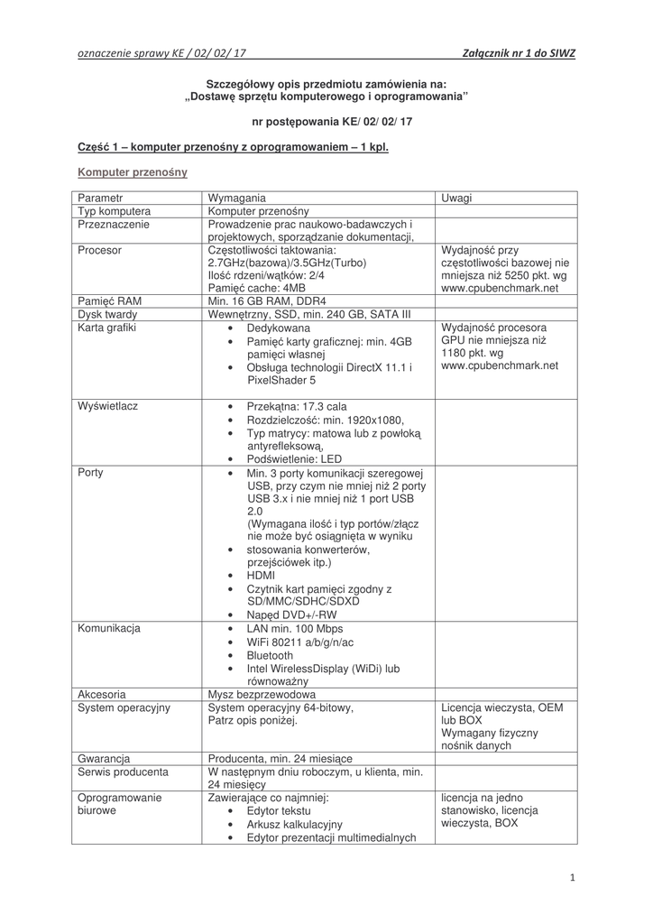 Szczegółowy opis przedmiotu zamówienia na: „Dostaw sprz tu komputerowego i oprogramowania” nr post powania KE/ 02/ 02/ 17 Cz 1 – komputer przeno ny z oprogramowaniem – 1 kpl. Komputer przeno ny Parametr Typ komputera Przeznaczenie Procesor Pami RAM Dysk twardy Karta grafiki Wy wietlacz Porty Komunikacja Akcesoria System operacyjny Gwarancja Serwis producenta Oprogramowanie biurowe Wymagania Komputer przeno ny Prowadzenie prac naukowo-badawczych i projektowych, sporz dzanie dokumentacji, Cz stotliwo ci taktowania: 2.7GHz(bazowa)/3.5GHz(Turbo) Ilo rdzeni/w tków: 2/4 Pami cache: 4MB Min. 16 GB RAM, DDR4 Wewn trzny, SSD, min. 240 GB, SATA III • Dedykowana • Pami karty graficznej: min. 4GB pami ci własnej • Obsługa technologii DirectX 11.1 i PixelShader 5 Uwagi Wydajno przy cz stotliwo ci bazowej nie mniejsza ni 5250 pkt. wg www.cpubenchmark.net Wydajno procesora GPU nie mniejsza ni 1180 pkt. wg www.cpubenchmark.net • • • Przek tna: 17.3 cala Rozdzielczo : min. 1920x1080, Typ matrycy: matowa lub z powłok antyrefleksow , • Pod wietlenie: LED • Min. 3 porty komunikacji szeregowej USB, przy czym nie mniej ni 2 porty USB 3.x i nie mniej ni 1 port USB 2.0 (Wymagana ilo i typ portów/zł cz nie mo e by osi gni ta w wyniku • stosowania konwerterów, przej ciówek itp.) • HDMI • Czytnik kart pami ci zgodny z SD/MMC/SDHC/SDXD • Nap d DVD+/-RW • LAN min. 100 Mbps • WiFi 80211 a/b/g/n/ac • Bluetooth • Intel WirelessDisplay (WiDi) lub równowa ny Mysz bezprzewodowa System operacyjny 64-bitowy, Patrz opis poni ej. Producenta, min. 24 miesi ce W nast pnym dniu roboczym, u klienta, min. 24 miesi cy Zawieraj ce co najmniej: • Edytor tekstu • Arkusz kalkulacyjny • Edytor prezentacji multimedialnych Licencja wieczysta, OEM lub BOX Wymagany fizyczny no nik danych licencja na jedno stanowisko, licencja wieczysta, BOX • Narz dzie zarz dzania informacj prywat (poczt elektroniczn , kalendarzem, kontaktami i zadaniami) Patrz opis poni ej System operacyjny 1. Licencja na zaoferowany system operacyjny musi by w pełni zgodna z warunkami licencjonowania producenta oprogramowania. 2. Interfejsy u ytkownika dost pne w kilku j zykach do wyboru – minimum w Polskim i Angielskim, 3. Funkcjonalno rozpoznawania mowy, pozwalaj c na sterowanie komputerem głosowo, wraz z modułem „uczenia si ” głosu u ytkownika. 4. Mo liwo dokonywania bezpłatnych aktualizacji i poprawek w ramach wersji systemu operacyjnego poprzez Internet, mechanizmem udost pnianym przez producenta systemu z mo liwo ci wyboru instalowanych poprawek oraz mechanizmem sprawdzaj cym, które z poprawek s potrzebne – wymagane podanie nazwy strony serwera www. 5. Mo liwo dokonywania aktualizacji i poprawek systemu poprzez mechanizm zarz dzany przez administratora systemu Za-mawiaj cego, 6. Dost pno bezpłatnych biuletynów bezpiecze stwa zwi zanych z działaniem systemu operacyjnego, 7. Wbudowana zapora internetowa (firewall) dla ochrony poł cze internetowych; zintegrowana z systemem konsola do zarz dzania ustawieniami zapory i regułami IP v4 i v6; 8. Wbudowane mechanizmy ochrony antywirusowej i przeciw zło liwemu oprogramowaniu z zapewnionymi bezpłatnymi aktualizacjami, 9. Zlokalizowane w j zyku polskim, co najmniej nast puj ce elementy: menu, odtwarzacz multimediów, pomoc, komunikaty systemowe, 10. Graficzne rodowisko instalacji i konfiguracji dost pne w j zyku polskim, 11. Wsparcie dla wi kszo ci powszechnie u ywanych urz dze peryferyjnych (drukarek, urz dze sieciowych, standardów USB, Plug&Play, Wi-Fi), 12. Funkcjonalno automatycznej zmiany domy lnej drukarki w zale no ci od sieci, do której podł czony jest komputer, 13. Mo liwo zarz dzania stacj robocz poprzez polityki grupowe – przez polityk Zamawiaj cy rozumie zestaw reguł definiuj cych lub ograniczaj cych funkcjonalno systemu lub aplikacji, 14. Rozbudowane, definiowalne polityki bezpiecze stwa – polityki dla systemu operacyjnego i dla wskazanych aplikacji, 15. Mo liwo zdalnej automatycznej instalacji, konfiguracji, administrowania oraz aktualizowania systemu, zgodnie z okre lonymi uprawnieniami poprzez polityki grupowe, 16. Zabezpieczony hasłem hierarchiczny dost p do systemu, konta i profile u ytkowników zarz dzane zdalnie; praca systemu w trybie ochrony kont u ytkowników. 17. Zintegrowany z systemem moduł wyszukiwania informacji (plików ró nego typu, tekstów, metadanych) dost pny z kilku poziomów: poziom menu, poziom otwartego okna systemu operacyjnego; system wyszukiwania oparty na konfigurowalnym przez u ytkownika module indeksacji zasobów lokalnych, 18. Zintegrowany z systemem operacyjnym moduł synchronizacji komputera z urz dzeniami zewn trznymi. 19. Mo liwo przystosowania stanowiska dla osób niepełnosprawnych (np. słabo widz cych); 20. Wsparcie dla IPSEC oparte na politykach – wdra anie IPSEC oparte na zestawach reguł definiuj cych ustawienia zarz dzanych w sposób centralny; 21. Mechanizmy logowania w oparciu o: a. Login i hasło, b. Karty z certyfikatami (smartcard), c. Wirtualne karty (logowanie w oparciu o certyfikat chroniony poprzez moduł TPM), 22. Wsparcie do uwierzytelnienia urz dzenia na bazie certyfikatu, 23. Wsparcie dla algorytmów Suite B (RFC 4869), 24. Wsparcie wbudowanej zapory ogniowej dla Internet Key Exchange v. 2 (IKEv2) dla warstwy transportowej IPsec, 25. Wbudowane narz dzia słu ce do administracji, do wykonywania kopii zapasowych polityk i ich odtwarzania oraz generowania raportów z ustawie polityk; 26. Wsparcie dla rodowisk Java i .NET Framework 4.x – mo liwo uruchomienia aplikacji działaj cych we wskazanych rodo-wiskach, 27. Wsparcie dla JScript i VBScript – mo liwo uruchamiania interpretera polece , 28. Zdalna pomoc i współdzielenie aplikacji – mo liwo zdalnego przej cia sesji zalogowanego u ytkownika celem rozwi zania problemu z komputerem, 29. Rozwi zanie słu ce do automatycznego zbudowania obrazu systemu wraz z aplikacjami. Obraz systemu słu y ma do automatycznego upow