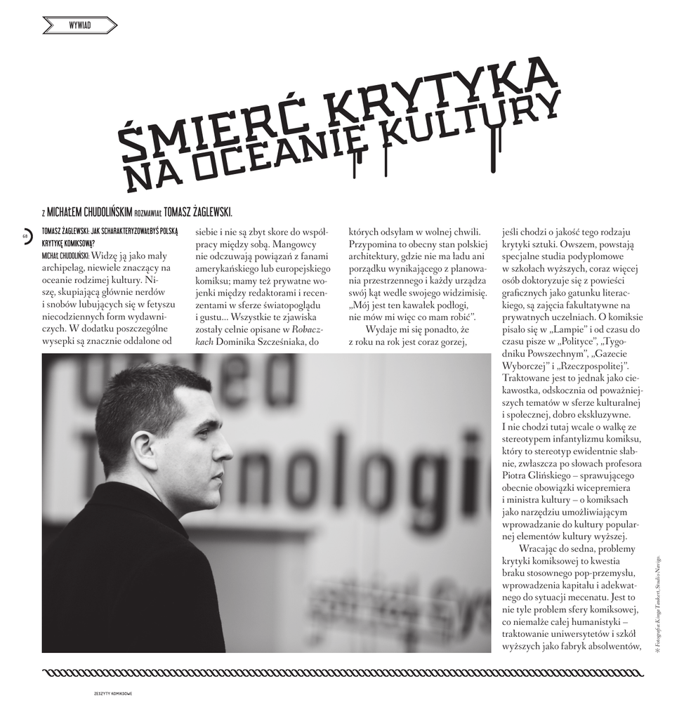 wywiad a k y t y r ry k u t ć l r u e k i e i m Ś an e c o na 68 Tomasz Żaglewski: Jak scharakteryzowałbyś polską krytykę komiksową? Michał Chudoliński: Widzę ją jako mały archipelag, niewiele znaczący na oceanie rodzimej kultury. Niszę, skupiającą głównie nerdów i snobów lubujących się w fetyszu niecodziennych form wydawniczych. W dodatku poszczególne wysepki są znacznie oddalone od siebie i nie są zbyt skore do współpracy między sobą. Mangowcy nie odczuwają powiązań z fanami amerykańskiego lub europejskiego komiksu; mamy też prywatne wojenki między redaktorami i recenzentami w sferze światopoglądu i gustu… Wszystkie te zjawiska zostały celnie opisane w Robaczkach Dominika Szcześniaka, do których odsyłam w wolnej chwili. Przypomina to obecny stan polskiej architektury, gdzie nie ma ładu ani porządku wynikającego z planowania przestrzennego i każdy urządza swój kąt wedle swojego widzimisię. „Mój jest ten kawałek podłogi, nie mów mi więc co mam robić”. Wydaje mi się ponadto, że z roku na rok jest coraz gorzej, jeśli chodzi o jakość tego rodzaju krytyki sztuki. Owszem, powstają specjalne studia podyplomowe w szkołach wyższych, coraz więcej osób doktoryzuje się z powieści graficznych jako gatunku literackiego, są zajęcia fakultatywne na prywatnych uczelniach. O komiksie pisało się w „Lampie” i od czasu do czasu pisze w „Polityce”, „Tygodniku Powszechnym”, „Gazecie Wyborczej” i „Rzeczpospolitej”. Traktowane jest to jednak jako ciekawostka, odskocznia od poważniejszych tematów w sferze kulturalnej i społecznej, dobro ekskluzywne. I nie chodzi tutaj wcale o walkę ze stereotypem infantylizmu komiksu, który to stereotyp ewidentnie słabnie, zwłaszcza po słowach profesora Piotra Glińskiego – sprawującego obecnie obowiązki wicepremiera i ministra kultury – o komiksach jako narzędziu umożliwiającym wprowadzanie do kultury popularnej elementów kultury wyższej. Wracając do sedna, problemy krytyki komiksowej to kwestia braku stosownego pop-przemysłu, wprowadzenia kapitału i adekwatnego do sytuacji mecenatu. Jest to nie tyle problem sfery komiksowej, co niemalże całej humanistyki – traktowanie uniwersytetów i szkół wyższych jako fabryk absolwentów, Fotografia: Kinga Taukert, Studio Navigo. Z michałem chudolińskim rozmawiał tomasz żaglewski. wywiad którzy potem na próżno szukają pracy i koniec końców robią później coś zupełnie innego z różnym (zazwyczaj gorszym) skutkiem. Dzisiejsza młodzież licealna i studencka jest tego bardziej świadoma aniżeli poprzednie roczniki. Nawet zapisując się na zajęcia poświęcone sztuce komiksowej, traktują je w sposób błahy, co wynika z pragmatyzmu – skoro nie przyda mi się to na rynku pracy, to po co się angażować w te sprawy poza murami uczelni? Czasami zdarzą się aktywiści, ale są to niezmiernie rzadkie przypadki. A tylko tak może się narodzić krytyk komiksowy z prawdziwego zdarzenia. TŻ: Czy są w Polsce szczególnie istotni krytycy zajmujący się komiksem? MCh: Wyjdę teraz na ignoranta, ale polska krytyka komiksowa uprawiana w gazetach, tygodnikach, telewizji przestała mnie od dłuższego czasu interesować. Jest tendencyjna i powierzchowna. Że atakuje się recenzenta a nie treść komiksu, to po pierwsze. Ale nade wszystko – po co poważnie rozmawiać, skoro tak mało ludzi ma kontakt z kulturą? Odpowiedź jest co prawda oczywista – po to, by zachęcać. Ale jest to, nie łudźmy się, syzyfowy trud. Niestety, dla Polaków książka siła Internetu, gdzie każdy może czy komiks nie jest dobrem pierwzjalna lub licealna – potencjalnie powiedzieć na dowolny temat to, co szej potrzeby i większość z nas przyszli, stali czytelnicy w dojrzachce, bez żadnych konsekwencji. boryka się z bardziej prozaicznymi łym wieku – nie jest w stanie sobie Może się wydawać, że komiks sprawami aniżeli egzystencjalne dy- pozwolić. Tym samym komiks staje staje się właśnie coraz bardziej lematy z komiksowych kadrów. Nie się dobrem wręcz ekstrawagancpopularny za sprawą innych meneguję, że takie osoby jak Sebastian kim i elitarnym, zwłaszcza jeśli diów, ale nie mylmy popularności Frąckiewicz, Kamil Śmiałkowski weźmiemy dodatkowo pod uwagę poszczególnych bohaterów popkulczy Maciej Gierszewski populanakłady komiksów w Polsce (warto tury z wzrostem ryzują komiks, czytelnictwa, ale zazwyczaj To właśnie w Internecie śledzę osoby zajmujące się sprzedaży i rozprodukują treści komiksem. poznawalności dla odbiorcy medium. Skazunieświadoje to na symboliczną śmierć znawmego. I nie jest to ich wina, lecz w tym miejscu poczytać „Biblioteców, których mało kto już potrzeredaktorów i wydawców dających kę Analiz” z grudnia 2013 roku). buje. Wolimy bowiem posłuchać krytykom ograniczoną przestrzeń Nisza, zamiast rosnąć, zamyka znajomego na Facebooku i jemu i traktujących czytelnika jako się w hermetycznej enklawie. prędzej zaufamy niż wyniosłemu indolenta bez własnego zdania. Wymiana myśli na temat wydakrytykowi, nierzadko znużonemu Taka publicystyka nie pozostawia wanych komiksów ogranicza się kolejnymi lekturami i seansami, po sobie nic wartego uwagi ani do jakości wydania i argumentów uważającego siebie za nie wiadomo zastanowienia – ile czasu można pokroju „fajne / niefajne”, „dobrze kogo. Dodatkowo, coraz więcej zaznajamiać z językiem komiksu oprawione / szpetne”. Brak w tym krytyków za wielką wodą realizuje nowicjuszy i ocierać się o banały? głębszych myśli, odwołań, bo i czyswoje powołanie jako hobby, pasję, Pytanie pozostawiam retorycznym. tanie w Polsce nie jest popularne. nie jako zawód. I tak powstaje obraz Dochodzi tutaj jeszcze marginaliskłaniający raczej do sceptycyzmu, zacja komiksu w wyniku wzrostu TŻ: A gdzie w tym wszystkim są wydawcy komiksowi? by nie powiedzieć pesymizmu. popularności gier kompute