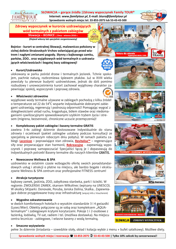 SŁOWACJA – gorące źródła |Zdrowy wypoczynek Family TOUR® Internet: www.familytour.pl, E-mail: [email protected] Sprawdzenie wolnych miejsc tel. 33-853-2075 lub 53-43-43-500 Zdrowy wypoczynek w kurorcie uzdrawiających wód termalnych z pakietem zabiegów Słowacja – BOJNICE | Zima - wiosna 2016 r. (Dojazd własny lub specjalnie zorganizowany) Bojnice - kurort w centralnej Słowacji, malowniczo położony w cichej dolinie Strażovskych Vrchov osłaniającej go przed wiatrem i nagłymi zmianami pogody. Słynny z bajkowego zamku, parków, ZOO.. oraz wyjątkowych wód termalnych o uzdrawiających właściwościach i bogatej bazy zabiegowej! Kurort/Uzdrowisko ulokowany w parku pośród drzew i termalnych jeziorek. Tchnie spokojem, pachnie naturą, rozbrzmiewa śpiewem ptaków. Już w XVIII wieku powstały tu pierwsze budynki uzdrowiskowe, jednak do dziś pomimo rozbudowy i unowocześnienia kurort zachował wyjątkowy charakter zapewniając spokój, wypoczynek i poprawę zdrowia. Właściwości zdrowotne wyjątkowe wody termalne używane w zabiegach pochodzą z kilku źródeł o temperaturze od 22 do 54oC wsparte indywidualnie dobranymi zabiegami uzdrawiają, regenerują i podnoszą odporność! Pomagając wygrać z dolegliwościami układ ruchu, kręgosłupa, bólem stawów oraz niedomaganiami cywilizacyjnymi spowodowanymi szybkim trybem życia i stresem (migrena, bezsenność, chroniczne uczucie przemęczenia)! Kompleksowy pakiet zabiegów i baseny termalne GRATIS zawiera 3-4x zabiegi dziennie dostosowane indywidualnie do stanu zdrowia i oczekiwań (pakiet zabiegów ustalany podczas konsultacji ze specjalistą w pierwszym roboczym dniu pobytu). W ramach pakietu zabiegi: Lecznicze – poprawiające stan zdrowia, Revitalise™ – regenerujące siły oraz przywracające stan harmonii, Rekreacyjne - zapewniają wypoczynek i poprawę samopoczucia! Specjaliści łączą je i dopasowują do indywidualnych potrzeb! Baseny termalne dla naszych klientów GRATIS. Nowoczesne Wellness & SPA uzdrowisko w ostatnim czasie wzbogaciło ofertę swoich ponadstandardowych usług i atrakcji o płatne na miejscu, ale bardzo bogate i ekskluzywne Wellness & SPA centrum oraz profesjonalne FITNESS centrum! Atrakcje turystyczne bajkowy zamek, jaskinia, ZOO, zabytkowa starówka, parki i ścieżki. W regionie: ZWOLEŃSKI ZAMEK, skansen Wilkolinec (wpisany na UNESCO). W okolicy SKIparki: Donovale, Poruba, Jonska Dolina, Skalka.. Zapewniające dobrze przygotowane trasy oraz infrastrukturę (więcej info z Voucherem) Wygodne zakwaterowanie w dwóch komfortowych hotelach o wysokim standardzie 3 i 4 gwiazdki (Lysec/Mier). Obiekty połączone są ze sobą oraz kompleksem „AQUAtermalnym” i zabiegowym krytymi korytarzami. Pokoje 1 i 2-osobowe z łazienką, lodówką, TV-sat, radiem i tel. (możliwa dostawka). Na miejscu centra leczniczo - zabiegowe, i własne baseny z wodą termalną. Smaczne wyżywienie pełne 3x dziennie (śniadania – szwedzkie stoły, obiad i kolacja wybór z menu + bufet sałatkowy). Możliwe diety. Sprawdzenie wolnych miejsc i rezerwacja 33-853-2075 53-43-43-500 | Tylko 10% zaliczki by zarezerwować! 2|Strona Kompleksowy, zdrowy wypoczynek w kurorcie termalnych wód.. BOJNICE zima/wiosna 2016 r. UWAGA - kurort przyjmuje tylko osoby pełnoletnie! Zdrowy wypoczynek BOJNICE w części 4 gwiazdkowej: w części 3 gwiazdkowej: 4 dni (3 noce) 5 dni (4 noce) 6 dni (5 nocy) 7 dni (6 nocy) 8 dni (7 nocy) 995 zł/os. 1395 zł/os. 1595 zł/os. 1795 zł/os. 1995 zł/os. 1375 zł/os. 1095 zł/os. 1595 zł/os. 1345 zł/os. 1895 zł/os. 1545 zł/os. 1995 zł/os. 1645 zł/os. 2195 zł/os. 1945 zł/os. Ceny PROMOCYJNE – zima/wiosna do wyczerpania wolnych miejsc! Cena zawiera: • 3 / 4 / 5 / 6 lub 7 nocy - Kurort BOJNICE, Hotel (część 3 lub 4 gwiazdki) • pełne wyżywienie (3x dziennie: śniadania, obiady, kolacje) • konsultacja lekarza specjalisty (dobór zabiegów) • 3-4x zabiegi na pełny dzień pobytu (oprócz niedzieli i świąt) • korzystanie z basenów termalnych wód przy hotelu – GRATIS All Inclusive • korzystanie z leżaków i infrastruktury rekreacyjnej – GRATIS All Inclusive • możliwość udziału w animacjach i wodnym aerobiku – GRATIS All Inclusive • szlafrok na czas wypoczynku, suszarka do włosów, kosmetyki hotelowe • możliwość udziału w programie kulturalno-rozrywkowym • faktura VAT (polski rachunek) pozwalający skorzystać z funduszu socjalnego i odliczeń • ubezpieczenie KL + NNW Signal Iduna wraz z KL i NNW chorób przewlekłych do 10 000 € • przed wypoczynkiem zestaw materiałów informacyjno – turystycznych (z Voucherem) • mapa samochodowa z planem dojazdu i atrakcji turystycznych Cena nie zawiera: opłaty klimatycznej (1 €/os./dzień) i parkingowej (14 €/tydzień - parking dozorowany!) Pokój jednoosobowy +40% (cześć 4*), pokój 1 osobowy +25% (część 3*), apartament dla 2 os +45%. Przejazd tam i z powrotem z Katowic +295 zł/os. Zniżki: dostawka –100 zł. Karta Family TOUR® –45 zł. Wczesna rezerwacja >35 dni –2%. Sprawdzenie wolnych miejsc i rezerwacja 33-853-2075 53-43-43-500 | Tylko 10% zaliczki by zarezerwować!