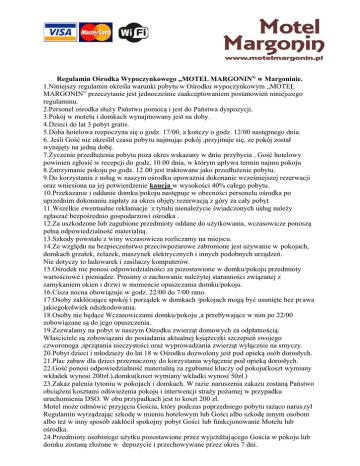 Regulamin Ośrodka Wypoczynkowego „MOTEL MARGONIN” w Margoninie. 1.Niniejszy regulamin określa warunki pobytu w Ośrodku wypoczynkowym „MOTEL MARGONIN” przeczytanie jest jednocześnie zaakceptowaniem postanowień niniejszego regulaminu. 2.Personel ośrodka służy Państwu pomocą i jest do Państwa dyspozycji. 3.Pokój w motelu i domkach wynajmowany jest na doby. 4.Dzieci do lat 3 pobyt gratis. 5.Doba hotelowa rozpoczyna się o godz. 17/00, a kończy o godz. 12/00 następnego dnia. 6. Jeśli Gość nie określił czasu pobytu najmując pokój ,przyjmuje się, ze pokój został wynajęty na jedną dobę. 7.Życzenie przedłużenia pobytu poza okres wskazany w dniu przybycia , Gość hotelowy powinien zgłosić w recepcji do godz. 10.00 dnia, w którym upływa termin najmu pokoju 8.Zatrzymanie pokoju po godz. 12.00 jest traktowane jako przedłużenie pobytu. 9.Do korzystania z usług w naszym ośrodku upoważnia dokonanie wcześniejszej rezerwacji oraz wniesiona na jej potwierdzenie kaucja w wysokości 40% całego pobytu. 10.Przekazanie i oddanie domku/pokoju następuje w obecności personelu ośrodka po uprzednim dokonaniu zapłaty za okres objęty rezerwacją z góry za cały pobyt. 11.Wszelkie ewentualne reklamacje z tytułu nienależycie świadczonych usług należy zgłaszać bezpośrednio gospodarzowi ośrodka . 12.Za uszkodzone lub zagubione przedmioty oddane do użytkowania, wczasowicze ponoszą pełną odpowiedzialność materialną. 13.Szkody powstałe z winy wczasowicza rozliczamy na miejscu. 14.Ze względu na bezpieczeństwo przeciwpożarowe zabronione jest używanie w pokojach, domkach grzałek, żelazek, maszynek elektrycznych i innych podobnych urządzeń. Nie dotyczy to ładowarek i zasilaczy komputerów. 15.Ośrodek nie ponosi odpowiedzialności za pozostawione w domku/pokoju przedmioty wartościowe i pieniądze. Prosimy o zachowanie należytej staranności związanej z zamykaniem okien i drzwi w momencie opuszczania domku/pokoju. 16.Cisza nocna obowiązuje w godz. 22/00 do 7/00 rano. 17.Osoby zakłócające spokój i porządek w domkach /pokojach mogą być usunięte bez pr awa jakiegokolwiek odszkodowania. 18.Osoby nie będące Wczasowiczami domku/pokoju ,a przebywające w nim po 22/00 zobowiązane są do jego opuszczenia. 19.Zezwalamy na pobyt w naszym Ośrodku zwierząt domowych za odpłatnością. Właściciele są zobowiązani do posiadania aktualnej książeczki szczepień swojego czworonoga ,sprzątania nieczystości oraz wyprowadzania zwierząt wyłącznie na smyczy. 20.Pobyt dzieci i młodzieży do lat 18 w Ośrodku dozwolony jest pod opieką osób dorosłych. 21.Plac zabaw dla dzieci przeznaczony do korzystania wyłącznie pod opieką dorosłych. 22.Gość ponosi odpowiedzialność materialną za zgubienie kluczy od pokoju(koszt wymiany wkładek wynosi 200zł.),domku(koszt wymiany wkładki wynosi 50zł.) 23.Zakaz palenia tytoniu w pokojach i domkach. W razie naruszenia zakazu zostaną Państwo obciążeni kosztami odświeżenia pokoju i interwencji straży pożarnej w przypadku uruchomienia DSO. W obu przypadkach jest to koszt 200 zł. Motel może odmówić przyjęcia Gościa, który podczas poprzedniego pobytu rażąco narus zył Regulamin wyrządzając szkodę w mieniu hotelowym lub Gości albo szkodę innym osobom albo też w inny sposób zakłócił spokojny pobyt Gości lub funkcjonowanie Motelu lub ośrodka. 24.Przedmioty osobistego użytku pozostawione przez wyjeżdżającego Gościa w pokoju lub domku zostaną złożone w depozycie i przechowywane przez okres 7 dni. 25. Parkowanie wyłącznie na miejscach parkingowych wyznaczonych do tego celu. Zabrania się wjazdu na tereny zielone ośrodka. 26.Regulamin pobytu w Ośrodku wchodzi w życie z dniem 29.05.2012 roku. 27. Załącznikiem nr 1 do niniejszego Regulaminu są Warunki re zerwacji i załącznikiem nr 2 do niniejszego Regulaminu jest cennik usług wypoczynkowych 28.Możliwość wykupienia posiłków: śniadanie i obiadokolacja 38 zł. Dziękujemy za współpracę i życzymy udanego wypoczynku Załącznik nr.1 Regulaminu Ośrodka Wypoczynkowego „Motel Margonin” w Margoninie. 1.Przedmiotem rezerwacji są pobyty w Ośrodku wypoczynkowym „MOTEL MARGONIN” w Margoninie. 2.Minimalny okres wynajmu wynosi 2 doby w okresie: a).01.06 do01.10 każdego roku w pozostałym okresie jest to 1 doba. Doba zaczyna się od godz.17/00 ,a kończy się o godz. 12/00 następnego dnia. 3.Niniejsze warunki stanowią oferty w rozumieniu przepisów kodeksu cywilnego. 4.Umowa o najem pokoju/domku/apartamentu zwana dalej „Umową” nie wymaga zawarcia w formie pisemnej , potwierdzeniem jej zawarcia jest wniesienie kau cji na poczet rezerwacji pobytu i podpis karty meldunkowej. 5.Zawarcie umowy poprzedzone jest wstępną rezerwacją danego domku/pokoju/apartam entu dokonanego w siedzibie Ośrodka Motelu Margonin lub w formie osobistej ,telefonicznej, telefaksowej albo pocztą elektroniczna. Pracownik ośrodka informuje o możliwości rezerwacji , o wysokości kaucji wnoszonej na poczet rezerwacji oraz numerze rachunku bankowego ,na który należy wnieść kaucję w terminie 5 dni od daty dokonania wstępnej rezerwacji. Klient zobowiązany jest do uiszczenia kaucji na rachunek bankowy WBK 89 1090 1317 0000 0001 1868 8824 lub też bezpośrednio w siedzibie z podaniem imienia i nazwiska i adresu osoby na którą dokonywana jest rezerwacja oraz rezerwowanego pokoju/domku oraz okresu rezerwacji. 6.Rezerwacja obowiązuje od trzeciego dnia roboczego od dnia dokonania wpłaty na rachunek bankowy. W przypadku braku dokonania wpłaty kaucji n a rachunek bankowy w ciągu 7 dni od dnia wstępnej rezerwacji-rezerwacje wstępną uważa się za nieobowiązującą. 7.Wysokości kaucji wnoszonych na poczet rezerwacji pobytu w Ośrodku zależą od okresu na jaki dokonywana jest rezerwacja oraz od przedmiotu rezerwacji. Wysokości te określone są w Regulaminie Ośrodka Motelu Margonin. 8.W niesienie kaucji na rachunek bankowy p