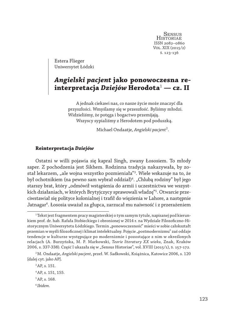 Sensus Historiae ISSN 2082–0860 Vol. XIX (2015/2) s. 123-136 Estera Flieger Uniwersytet Łódzki Angielski pacjent jako ponowoczesna reinterpretacja Dziejów Herodota1 — cz. II A jednak ciekawi nas, co nasze życie może znaczyć dla przyszłości. Wmyślamy się w przeszłość. Byliśmy młodzi. Widzieliśmy, że potęga i bogactwo przemijają. Wszyscy sypialiśmy z Herodotem pod poduszką. Michael Ondaatje, Angielski pacjent2. Reinterpretacja Dziejów Ostatni w willi pojawia się kapral Singh, zwany Łososiem. To młody saper. Z pochodzenia jest Sikhem. Rodzinna tradycja nakazywała, by został lekarzem, „ale wojna wszystko pozmieniała”3. Wiele wskazuje na to, że był ochotnikiem (na pewno sam wybrał oddział)4. „Chlubą rodziny” był jego starszy brat, który „odmówił wstąpienia do armii i uczestnictwa we wszystkich działaniach, w których Brytyjczycy sprawowali władzę”5. Otwarcie przeciwstawiał się polityce kolonialnej i trafił do więzienia w Lahore, a następnie Jatnagar6. Łososia uważał za głupca, zarzucał mu naiwność i z przerażeniem Tekst jest fragmentem pracy magisterskiej o tym samym tytule, napisanej pod kierunkiem prof. dr. hab. Rafała Stobieckiego i obronionej w 2014 r. na Wydziale Filozoficzno-Historycznym Uniwersytetu Łódzkiego. Termin „ponowoczesność” mieści w sobie całokształt przemian w myśli filozoficznej i klimat intelektualny. Pojęcie „postmodernizmu” zaś oddaje tendencje w kulturze występujące po modernizmie i pozostające z nim w określonych relacjach (A. Burzyńska, M. P. Markowski, Teorie literatury XX wieku, Znak, Kraków 2006, s. 337-338). Część I ukazała się w „Sensus Historiae”, vol. XVIII (2015/1), s. 157-172. 1 M. Ondaatje, Angielski pacjent, przeł. W. Sadkowski, Książnica, Katowice 2006, s. 120 [dalej cyt. jako AP]. 2 3 AP, s. 151. 4 AP, s. 151, 155. 5 AP, s. 168. 6 Ibidem. 123 Estera Flieger obserwował wciągnięcie indyjskich mężczyzn w „angielską wojnę”7. Podobne zdanie miał Caravaggio: […] a Łosoś pewnie któregoś dnia wyleci w powietrze. Dlaczego? W imię czego? Ma dwadzieścia sześć lat. Armia brytyjska szkoli go w zręczności, Amerykanie uczą go jeszcze większej zręczności […]. Jesteś wykorzystywany, boyo, jak mówią Walijczycy.8 Saper inaczej oceniał sytuację i przypomniał rozmowę z bratem: Japonia jest częścią Azji, odpowiadam mu, a Sikhowie na Malajach są przez Japończyków prześladowani. Ale do brata to nie dociera. Powiada, że Anglicy wieszają Sikhów walczących o swą niezależność.9 W oczach Hany walczy, ponieważ „wierzy w cywilizowany świat i jest człowiekiem cywilizowanym”10 . Ale wiadomość o zrzuceniu bomby atomowej na Hiroszimę i Nagasaki zmieniła wszystko: — Zostawiłem wam radio, żebyście sobie przyswoili lekcje historii. [...] Wszystkie te mowy o cywilizacji wygłaszane przez królów i królowe, i prezydentów… te wykładnie abstrakcyjnego porządku [...] odór tych obrządków. W Indiach, jeśli ojciec złamie sprawiedliwość, zabija się go.11 Kiedy Łosoś słyszy o tym, co stało się w Japonii, pada na kolana, krzyczy, płacze i przestaje jeść12. Mierzy się z wydarzeniem holokaustycznym: — Mój brat mi mówił. Nigdy nie odsłaniaj pleców w Europie. Paktują. Zawierają układy. Sporządzają mapy. Nigdy nie wierz Europejczykom, powtarzał. Nigdy im nie ściskaj dłoni. Ale my, och, tak łatwo ulegaliśmy złudzeniom — pod wpływem waszych przemówień, medali i ceremonii. Co ja robiłem przez te ostatnie kilka lat? Odcinałem, niszczyłem odnóże zła. Po co? Żeby to mogło się wydarzyć?13 7 AP, s. 178. 8 AP, s. 105. 9 AP, s. 178. 10 AP, s. 105. 11 AP, s. 235. 12 AP, s. 233, 237. AP, s. 235. A. Britain — „końcowy holocaust II wojny światowej” (tłum. E.F.) (A. Britain, War and the Book: The Diarist, the Cryptographer, and The English Patient, “PMLA”, Vol. 121, No. 1, Special Topic: The History of the Book and the Idea of Literature (Han., 2006), s. 201). J. Bolland — „nuklearny holocaust” (tłum. E.F.) (J. Bolland, Michael Ondaatje’s The English Patient : a reader’s guide, Continuum, New York, London 2002, s. 53). 13 124 Angielski pacjent jako ponowoczesna reinterpretacja... — II Nagle młody żołnierz „nie wie co tu robi” i ma wrażenie, że „wszystkie wichry świata wessały się w Azję”14. Celuje z broni do pacjenta, który stał się teraz dla niego symbolem zachodniego świata — zepsutego i fałszywego: Może to Amerykanin, Francuz, mniejsza o to. Od kiedy zaczęliście zrzucać bomby na kolorowych, wszyscy jesteście Anglikami. [...] Wszyscy jesteście uczniami Anglików.15 Wojna ma nowe oblicze. Nie ma cywilizacji, są rasy. W oczach Łososia konflikt ma charakter rasowy. „Paroksyzm zachodu” — te same ręce, które namalowały freski i wzniosły najpiękniejsze świątynie, skonstruowały broń masowej zagłady16. Michael Ondaatje odwrócił koncepcję podziału świata przyjętą przez Herodota i zakorzenioną w śródziemnomorskiej mentalności. Teraz Zachód ma oblicze barbarzyńcy, ale nie w znaczeniu odmienności kulturowej17. Młody saper podaje słuchawki pacjentowi. Dla niego po obu stronach frontu stali ci sami barbarzyńcy. Teraz „nie chce już niczego więcej usłyszeć i osuwa się w ciemność, daleką od tego pokoju”18. *** Kip opuszcza willę. Wcześniej zbliżył się do Hany. Ich romans wydawał się poza ramami narodowości19. Był ciekawym spotkaniem: „Tak jak wpadając w ramiona obcego, odkrywasz odbicie dokonanego przez siebie wyboru, jak w lustrze”20. Kochankowie „odkryli, że w miłości zawrzeć się może cała cywilizacja, że stawia ich ona oko w oko z krajem każdego z nich”21. Młoda pielęgniarka widziała „w wyobraźni całą Azję przez gesty tego mężczyzny”22. Był dla niej „hinduskim bożkiem”23. Wiele łączyło go również z pacjentem: 14 AP, s. 237. 15 AP, s. 236. 16 AP, s. 234. 