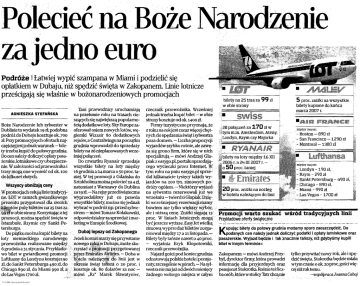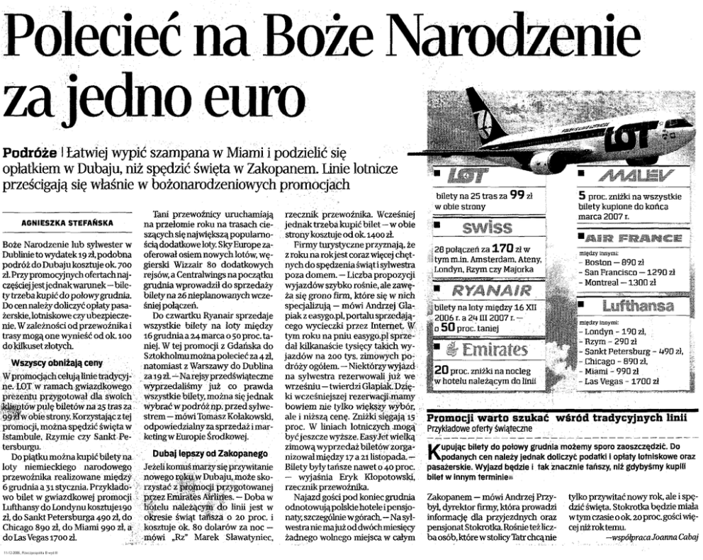 Polecieć na Boże Narodzenie za jedno euro Podróże l Łatwiej wypić szampana w Miami i podzielić się opłatkiem w Dubaju, niż spędzić święta w Zakopanem. linie lotnicze prześcigają się właśnie w bożonarodzeniowych promocjach AGNIESZKA STEFAŃSKA Boże Narodzenie lub sylwester w Dublinie to wydatek 19 zł, podobna podróż do Dubaju kosztuje ok. 700 zł. Przy promocyjnych ofertach naj częściejjestjednakwarunek-bilety trzeba kupić do połowy grudnia. Do cen należy doliczyć opłaty pasażerskie, lotniskowe czy ubezpieczenie. W zależności od przewoźnika i trasy mogą one wynieść od ok. 100 do kilkuset złotych. Wszyscy obniżają ceny W promocjach celują linie tradycyj ne. ŁÓJ w ramach gwiazdkowego prezentu przygotował dla swoich fldtertówpulę biletów na 25 tras za 99Ww obie strony. Korzystając z tej promocji, można spędzić święta w Istambule, Rzymie czy Sankt Petersburgu. Do piątku można kupić bilety na loty niemieckiego narodowego przewoźnika realizowane między 6 grudnia 331 stycznia. Przykładowo bilet w gwiazdkowej promocji Lufthansy do Londynu kosztujeigo zł, do Sankt Petersburga 490 zł, do Chicago 890 zł, do Miami 990 zł, a doLasYegas 1700 zł. Tani przewoźnicy uruchamiają na przełomie roku na trasach cieszących się największą popularnością dodatkowe loty. Sky Europę zaoferował osiem nowych lotów, węgierski Wizzair 80 dodatkowych rejsów, a Centralwings na początku grudnia wprowadził do sprzedaży bilety na 26 nieplanowanych wcześniej połączeń. Do czwartku Ryanair sprzedaje wszystkie bilety na lory między 16 grudnia a 24 marca 050 proc. taniej. W tej promocji z Gdańska do S ztokholmumożna polecieć za4zł, natomiast z Warszawy do Dublina zaigzł.—Narejsyprzedświąteczne wyprzedaliśmy już co prawda wszystkie bilety, można się jednak wybrać w podróż rip.przed sylwestrem —mówi Tomasz Kołakowski, odpowiedzialny za sprzedaż i marketingwEuropie Środkowej. Dubaj lepszy od Zakopanego Jeżeli komuś marzy się przywitanie nowego roktŁw Dubaju, może skorzystać z pj^fnocji przygotowanej przez Emłrates Airlittes. — Doba w hotelu należącynt do linii jest w okresie świąt taftszd o 20 proc. i kosztuje ok. 80 dolarów za noc — mówi „Rz" Marek Sławatyniec, rzecznik przewoźnika. Wcześniej jednak trzeba kupić bilet—w obie strony kosztuje od ok. 1400 zł. Firmy turystyczne przyznają, że z roku na rokjest coraz więcej chętnych do spędzenia świąt i sylwestra poza domem. — Liczba propozycji wyjazdów szybko rośnie, ale zawęża się grono firm, które się w nich specjalizują — mówi Andrzej Glapiak z easygo.pl, portalu sprzedającego wycieczki przez Internet W tym roku na pniu easygo.pl sprzedał kilkanaście tysięcy takich wyjazdów na 200 tyś. zimowych podróży ogółem.—Niektórzy wyjazd na sylwestra rezerwowali już we wrześniu—twierdzi Glapiak. Dzięki wcześniejszej rezerwacjijnamy bowiem nie tylko większy wybór, ale i niższą cenę. Zniżki sięgają 15 proc. W liniach lotniczych mogą być jeszcze wyższe. EasyJet wielką zimową wyprzedaż biletów zorganizował między 17 a 21 listopada. ^Bilety były tańsze nawet 040 proc. — wyjaśnia Eryk Kłopotowski, rzecznik przewoźnika. Najazd gości pod koniec grudnia odnotowują polskłehoteleipensjonaty, szczególnie w górach.—Na sylwestra nie majuż od dwóch miesięcy żadnego wolnego miejsca w całym bilety na 25 tras za 99 zł w obie strony 128 połączeń za 170 zł w i tym m.in. Amsterdam, Ateny, ; Londyn, Rzym czy Majorka ( bilety na loty między 16 XII * f 20D6r a 24 III 2007 r lo 50 proc taniej 120 proc. zniżki na nocleg t w hotelu należącym do linii 5 proc. zniżki na wszystkie bilety kupione do końca marca 2007 r. między innymi: - Boston — 890 zł - San Francisco - 1290 zł - Montreal - 1300 zł między innymi: - Londyn - 190 zł, -Rzym-290 zł - Sankt Petersburg - 490 zł, - Chicago - 890 zł, - Miami - 990 zł - Las Vegas - 1700 zł Promocji warto szukać wśród tradycyjnych linii Przykładowe oferty świąteczne |/upując bilety do połowy grudnia możemy sporo zaoszczędzić. Do l\podanych cen należy jednak doliczyć podatki i opłaty lotniskowe oraz pasażerskie. Wyjazd będzie i tak znacznie tańszy, niż gdybyśmy kupili bilet w innym terminie Zakopanem — mówi Andrzej Przybył, dyrektor firmy, która prowadzi informację dla przyjezdnych oraz pensjonat Stokrotka. Rośnie też liczba osób, które w stolicy Tatr chcą nie tylko przywitać nowy rok, ale i spędzić święta. Stokrotka będzie miała w tym czasie ook 20 proc.gości więcej niż roktemu. —współpraca Joanna Cabaj