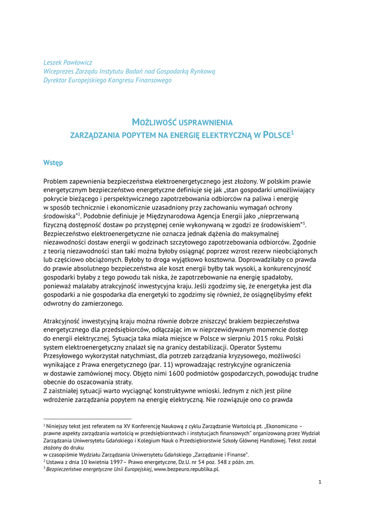 Leszek Pawłowicz Wiceprezes Zarządu Instytutu Badań nad Gospodarką Rynkową Dyrektor Europejskiego Kongresu Finansowego MOŻLIWOŚĆ USPRAWNIENIA ZARZĄDZANIA POPYTEM NA ENERGIĘ ELEKTRYCZNĄ W POLSCE1 Wstęp Problem zapewnienia bezpieczeństwa elektroenergetycznego jest złożony. W polskim prawie energetycznym bezpieczeństwo energetyczne definiuje się jak „stan gospodarki umożliwiający pokrycie bieżącego i perspektywicznego zapotrzebowania odbiorców na paliwa i energię w sposób technicznie i ekonomicznie uzasadniony przy zachowaniu wymagań ochrony środowiska”2. Podobnie definiuje je Międzynarodowa Agencja Energii jako „nieprzerwaną fizyczną dostępność dostaw po przystępnej cenie wykonywaną w zgodzi ze środowiskiem”3. Bezpieczeństwo elektroenergetyczne nie oznacza jednak dążenia do maksymalnej niezawodności dostaw energii w godzinach szczytowego zapotrzebowania odbiorców. Zgodnie z teorią niezawodności stan taki można byłoby osiągnąć poprzez wzrost rezerw nieobciążonych lub częściowo obciążonych. Byłoby to droga wyjątkowo kosztowna. Doprowadziłaby co prawda do prawie absolutnego bezpieczeństwa ale koszt energii byłby tak wysoki, a konkurencyjność gospodarki byłaby z tego powodu tak niska, że zapotrzebowanie na energię spadałoby, ponieważ malałaby atrakcyjność inwestycyjna kraju. Jeśli zgodzimy się, że energetyka jest dla gospodarki a nie gospodarka dla energetyki to zgodzimy się również, że osiągnęlibyśmy efekt odwrotny do zamierzonego. Atrakcyjność inwestycyjną kraju można równie dobrze zniszczyć brakiem bezpieczeństwa energetycznego dla przedsiębiorców, odłączając im w nieprzewidywanym momencie dostęp do energii elektrycznej. Sytuacja taka miała miejsce w Polsce w sierpniu 2015 roku. Polski system elektroenergetyczny znalazł się na granicy destabilizacji. Operator Systemu Przesyłowego wykorzystał natychmiast, dla potrzeb zarządzania kryzysowego, możliwości wynikające z Prawa energetycznego (par. 11) wprowadzając restrykcyjne ograniczenia w dostawie zamówionej mocy. Objęto nimi 1600 podmiotów gospodarczych, powodując trudne obecnie do oszacowania straty. Z zaistniałej sytuacji warto wyciągnąć konstruktywne wnioski. Jednym z nich jest pilne wdrożenie zarządzania popytem na energię elektryczną. Nie rozwiązuje ono co prawda 1 Niniejszy tekst jest referatem na XV Konferencję Naukową z cyklu Zarządzanie Wartością pt. „Ekonomiczno – prawne aspekty zarządzania wartością w przedsiębiorstwach i instytucjach finansowych” organizowaną przez Wydział Zarządzania Uniwersytetu Gdańskiego i Kolegium Nauk o Przedsiębiorstwie Szkoły Głównej Handlowej. Tekst został złożony do druku w czasopiśmie Wydziału Zarządzania Uniwersytetu Gdańskiego „Zarządzanie i Finanse”. 2 Ustawa z dnia 10 kwietnia 1997– Prawo energetyczne, Dz.U. nr 54 poz. 348 z późn. zm. 3 Bezpieczeństwo energetyczne Unii Europejskiej, www.bezpeuro.republika.pl. 1 problemów o wymiarze strategicznym polskiej energetyki, ale prawdopodobnie jest najtańszym instrumentem zarządzania kryzysowego. 1. Istota zarządzania popytem na energię elektryczną Rynek energii elektrycznej charakteryzuje się względnie cyklicznym popytem. W istocie mamy przypadek nakładania się na siebie cykli: dobowego, tygodniowego i rocznego. Głównym powodem wahań popytu na prąd jest zmienność klimatu. W Polsce maksymalne zapotrzebowanie na prąd jest: w okresie zimowym, najwyższe ok. godz. 17.00 (zimowy szczyt wieczorny), a w miesiącach letnich ok. godz. 13.00 (letni szczyt południowy). Utrzymywanie się bardzo niskich temperatur zimą lub/i bardzo wysokich temperatur latem pogłębia amplitudę cyklu. Warto zauważyć, że w ostatnich latach obserwujemy szybszy wzrost maksymalnej wartości szczytu letniego niż zimowego, głównie z powodu upowszechniania klimatyzatorów i urządzeń chłodniczych. I tak, w ostatnich dziesięciu latach szczytowe zapotrzebowanie w okresie zimowym wzrosło o ok. 11,2%, a w okresie letnim o ok. 25%4. Nadal jednak kluczowe znaczenie dla bilansu elektroenergetycznego w Polsce ma zapotrzebowanie na energię w tzw. szczycie zimowym. Przebieg krajowego zapotrzebowania na energię elektryczną w godzinach szczytu w roku 2014 ilustruje rysunek 1. Rysunek 1. Przebiegi krajowego zapotrzebowania na moc dla dnia o maksymalnym i minimalnym zapotrzebowaniu w szczycie wieczornym dnia roboczego w 2014 roku Źródło: Raport roczny 2014 KSE, www.pse.pl, s. 13]. 4 Sprawozdanie z wyników monitorowania bezpieczeństwa dostaw energii elektrycznej w okresie od 1 stycznia 2011 do 31 grudnia 2013, Minister Gospodarki, Warszawa 2013. 2 Krajowe zapotrzebowanie na energię elektryczną w szczycie wieczornym wyniosło w 2014 roku: - maksymalnie 25,5 tys. MW (29 stycznia 2014), - minimalnie 18,8 tys. MW (27 czerwca 2014). Historyczne maksimum zapotrzebowania miało miejsce w 2012 roku (7 lutego) i wyniosło 25,9 tys. MW. Amplituda wahań wynosi zatem ok. 10 tys. MW. W Polsce działania na rzecz bezpieczeństwa energetycznego, rozumianego jako nieprzerwane dostawy energii, koncentrują się na podaży. Dobitniej wyraża to prof. Jan Popczyk „Homo energericus (w tym wypadku sojusz polityczno-energetyczny) i homo economicus (dodatkowo jeszcze banki) chce deficyt obciążenia w KSE po 2015 roku, spowodowany dyrektywą 2010/75 (środowiskową), likwidować za pomocą bloków jądrowych i węglowych, pogłębiając zresztą znacznie większy problem nadmiaru mocy w dolinie nocnej”5. Wymaga to kapitałochłonnych inwestycji i przy braku innych działań powoduje wzrost kosztów energii. Nie kwestionując konieczności inwestycji w nowe moce, szczególnie w świetle planowanych likwidacji elektrowni łącznie produkujących 4500 MW, co stanowi ok. 17% tzw. mocy dyspozycyjnej, to niewytłumaczalne są zaniedbania w zakresie zarządzania popytem na energię6. Zarządzanie popytem pozwala bowiem istotnie zreduko