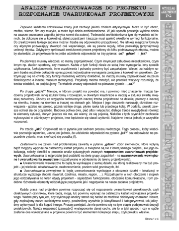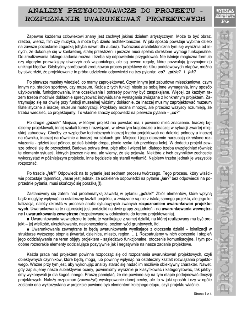 Zapewne każdemu człowiekowi znany jest zachwyt jakimś dziełem artystycznym. Może to być obraz, rzeźba, wiersz, film czy muzyka, a może być dzieło architektoniczne. W jaki sposób powstaje wybitne dzieło na zawsze pozostanie zagadką (chyba nawet dla autora). Twórczość architektoniczna tym się wyróżnia od innych, że dokonuje się w konkretnej, stałej przestrzeni i jeszcze musi spełnić określone wymogi funkcjonalne. Do zrealizowania takiego zadania można i trzeba się odpowiednio przygotować. Nie istnieje magiczna formuła czy algorytm pozwalający stworzyć coś wspaniałego, ale są pewne reguły, które pozwalają (przynajmniej) uniknąć błędów. Gdybyśmy spróbowali zredukować proces projektowy do kilku podstawowych etapów, można by stwierdzić, że projektowanie to próba udzielenia odpowiedzi na trzy pytania: co? gdzie? i jak? Po pierwsze musimy wiedzieć, co mamy zaprojektować. Czym innym jest zabudowa mieszkaniowa, czym innym np. stadion sportowy, czy muzeum. Każda z tych funkcji niesie ze sobą inne wymagania, inny sposób użytkowania, funkcjonowania, inne oczekiwania i potrzeby powinny być zaspakajane. Więcej, za każdym razem trzeba możliwie dokładnie sprecyzować indywidualne wymagania związane z konkretnym projektem. Zatrzymując się na chwilę przy funkcji muzealnej widzimy dokładnie, że inaczej musimy zaprojektować muzeum filatelistyczne a inaczej muzeum motoryzacji. Przykłady można mnożyć, ale przecież wszyscy rozumieją, że trzeba wiedzieć, co projektujemy. To właśnie znaczy odpowiedź na pierwsze pytanie – „co?” Po drugie „gdzie?” Miejsce, w którym projekt ma powstać ma, i powinno mieć znaczenie. Inaczej będziemy projektowali, innej szukali formy i rozwiązań, w otwartym krajobrazie a inaczej w sytuacji zwartej miejskiej zabudowy. Choćby ze względów technicznych inaczej trzeba projektować na dalekiej północy a inaczej na równiku, inaczej na równinie a inaczej na stokach gór. Miejsce i jego otoczenie narzucają określone rozwiązania - gdzieś jest północ, gdzieś istnieje droga, płynie rzeka lub przebiega kolej. W dodatku projekt zawsze odnosi się do przyszłości. Budowa potrwa dwa, pięć albo i więcej lat, dlatego trzeba uwzględniać również te elementy sytuacji, których jeszcze nie ma, ale wiemy, że się pojawią. Niektóre z tych czynników zechcecie wykorzystać w późniejszym projekcie, inne będziecie się starali wytłumić. Najpierw trzeba jednak je wszystkie rozpoznać. Po trzecie „jak?” Odpowiedź na to pytanie jest sednem procesu twórczego. Tego procesu, który właściwie pozostaje tajemnicą. Jasne jest jednak, że udzielenie odpowiedzi na pytanie „jak?” bez odpowiedzi na poprzednie pytania, musi skończyć się porażką (!). Zastanówmy się zatem nad problematyką zawartą w pytaniu „gdzie?” Zbiór elementów, które wpłyną bądź mogłyby wpłynąć na ostateczny kształt projektu, a związane są nie z istotą samego projektu, ale jego lokalizacją, należy określić w procesie analiz sytuacyjnych zwanych rozpoznaniem uwarunkowań projektowych. Uwarunkowania te najprościej jest podzielić na dwie grupy zagadnień - na uwarunkowania wewnętrzne i uwarunkowania zewnętrzne (rozpatrywane w odniesieniu do terenu projektowania). ■ Uwarunkowania wewnętrzne to będą te wynikające z samej działki, na której realizowany ma być projekt – jej wielkość, ukształtowanie, nasłonecznienie, poziom wód gruntowych, itd. ■ Uwarunkowania zewnętrzne to będą uwarunkowania wynikające z otoczenia działki – lokalizacji w strukturze wyższego stopnia (kwartał, dzielnica, miasto, region, …). Rozpatrujemy w nich otoczenie i stopień jego oddziaływania na teren objęty projektem - sąsiedztwo funkcjonalne, otoczenie komunikacyjne, i tym podobne różnorakie elementy oddziałujące pozytywnie jak i negatywnie na nasze zadanie projektowe. Każda praca nad projektem powinna rozpocząć się od rozpoznania uwarunkowań projektowych, czyli obiektywnych czynników, które będą, mogą, lub powinny wpłynąć na ostateczny kształt rozwiązania projektowego. Ważne przy tym jest, aby wykonując analizy starać się nadać im możliwie obiektywny charakter. Nawet, gdy zapisujemy nasze subiektywne oceny, powinniśmy wyraźnie je klasyfikować i kategoryzować, tak jakbyśmy wykonywali je dla kogoś innego. Proszę pamiętać, że nie powinno się na tym etapie podejmować decyzji projektowych. Należy rozpoznać (zauważyć) występowanie danej cechy, ale to w jaki sposób i czy w ogóle zostanie ona wykorzystana w projekcie powinno być elementem kolejnego etapu, czyli projektu właśnie. Strona 1 z 4 URBANISTYCZNE DR INŻ. ARCH. ROMAN RUCZYŃSKI ROZPOZNANIE UWARUNKOWAŃ PROJEKTOWYCH PROJEKTOWYCH WYDZIAŁ ARCHITEKTU ARCHITEKTURY PG PROJEKTOWANIE ANALIZY ANALIZY PRZYGOTOWAWCZE DO PROJEKTU - Rozpoznanie uwarunkowań projektowych, zakres i tematyka przeprowadzonych analiz, powinny być dostosowane do konkretnej sytuacji i problematyki projektu i mogą bardzo różnić się w poszczególnych przypadkach. Wpływać na to będzie zarówno temat zadania projektowego jak i nasycenie obszaru objętego projektem i jego otoczenia wartościami przyrodniczymi, kulturowymi, społecznymi, gospodarczymi, itd. ROZPOZNANIE WEWNĘTRZNYCH UWARUNKOWAŃ PROJEKTO PROJEKTOWYCH Jak zostało powiedziane, uwarunkowania wewnętrzne obrazują uwarunkowania wynikające z obszaru położonego wewnątrz granic opracowania. Teren, na którym realizowany jest jakikolwiek projekt, ma określone cechy, które mogą a nawet powinny wpłynąć na ostateczne rozwiązanie. Projekt na terenie urozmaiconym powinien różnić się od tego na terenie płaskim. Występowanie wód powierzchniowych - jezioro, staw, potok, nie może nie wpływać na kształt projektu. Spadki, istniejąca roślinność, nasłonecznienie, nośność gruntu, itp. elementy w naturalny sposób oddziałują na projekt, i powinn