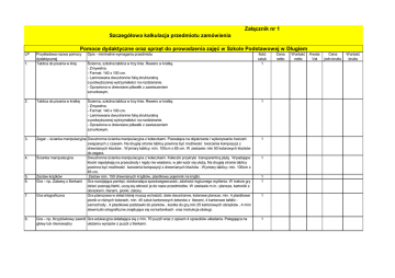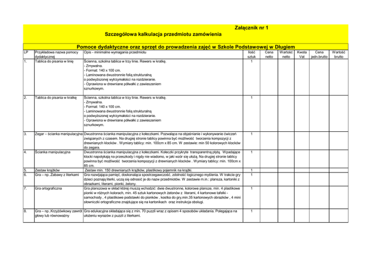 Załącznik nr 1 Szczegółowa kalkulacja przedmiotu zamówienia Pomoce dydaktyczne oraz sprzęt do prowadzenia zajęć w Szkole Podstawowej w Długiem LP Opis - minimalne wymagania przedmiotu 1. Przykładowa nazwa pomocy dydaktycznej Tablica do pisania w linię 2. Tablica do pisania w kratkę Ścienna, szkolna tablica w trzy linie. Rewers w kratkę. - Zmywalna. - Format: 140 x 100 cm. - Laminowana dwustronnie folią strukturalną o podwyższonej wytrzymałości na rozdzieranie. - Oprawiona w drewniane półwałki z zawieszeniem sznurkowym. 3. Zegar – ścianka manipulacyjna Dwustronna ścianka manipulacyjna z kołeczkami. Pozwaląca na objaśnianie i wykonywanie ćwiczeń związanych z czasem. Na drugiej stronie tablicy powinna być możliwość tworzenia kompozycji z drewnianych klocków . Wymiary tablicy: min. 100cm x 85 cm. W zestawie: min 50 kolorowych klocków do zegara. Ścianka manipulacyjna Dwustronna ścianka manipulacyjna z kołeczkami. Kołeczki przykryte transparentną płytą. Wpadające klocki napotykają na przeszkody i nigdy nie wiadomo, w jaki wzór się ułożą. Na drugiej stronie tablicy powinna być możliwość tworzenia kompozycji z drewnianych klocków . Wymiary tablicy: min. 100cm x 85 cm. Zestaw krążków Zestaw min. 150 drewnianych krążków, plastikowy pojemnik na krążki. Gra – np..Zabawy z literkami Gra rozwijająca pamięć, doskonaląca spostrzegawczość, zdolność logicznego myślenia. W trakcie gry dzieci poznają literki, uczą się odnosić je do nazw przedmiotów. W zestawie m.in.: plansza, kartoniki z obrazkami, literami, pionki, żetony. Gra ortograficzna Gra planszowa w skład której muszą wchodzić: dwie dwustronne, kolorowe plansze, min. 4 plastikowe pionki w różnych kolorach, min. 45 sztuk kartonowych żetonów z literami, 4 kartonowe tafelki samochody , 4 plastikowe podstawki do pionków , kostka do gry,min.35 kartonowych obrazków , 4 mini słowniczki ortograficzne znajdujące się na kartonikach oraz instrukcja obsługi. 1 Gra – np..Krzyżówkowy zawrót Gra edukacyjna składająca się z min. 70 puzzli wraz z opisem 4 sposobów układania. Polegająca na głowy lub równoważny ułożeniu wyrazów z puzzli z literkami. 1 4. 5. 6. 7. 8. Ścienna, szkolna tablica w trzy linie. Rewers w kratkę. - Zmywalna. - Format: 140 x 100 cm. - Laminowana dwustronnie folią strukturalną o podwyższonej wytrzymałości na rozdzieranie. - Oprawiona w drewniane półwałki z zawieszeniem sznurkowym. Ilość sztuk 1 1 1 1 1 1 Cena netto Wartość netto Kwota Vat Cena jedn.brutto Wartość brutto 9. Loteryjki obrazkowo-sylabowe Publikacja powinna zawierająć dwie serie loteryjek obrazkowo-sylabowych. W pierwszej znajdują się loteryjki jednoobrazkowe dwusylabowe o sylabach dwuliterowych otwartych, w drugiej loteryjki dziewięcioobrazkowe o dwóch różnych sylabach. Każda loteryjka składająca się z obrazka i pustych okienek, które są uzupełniane przez dziecko wyciętymi kartonikami np. „Loteryjki obrazkowo-sylabowe” lub równoważna Książeczka – np..Dyslektyczne Książeczka utrwalająca pisownię wyrazów. Dzieci powinny mieć możliwość uzupełniania w danym ucho wyrazie literę lub dwuznak, następnie wykonują ćwiczenie utrwalające pisownię tego słowa. Do książeczki powinien być dołączony minisłowniczek zawierający wszystkie wyrazy z ćwiczeń. Korzystając z niego, dziecko może sprawdzić, czy dobrze wykonało zadanie. Gra doskonaląca koordynację wzrokowo-ruchową, spryt, celowości ruchu, Gra polegająca na rzucaniu Gra -np.Łapiemy żabę lub równoważny i łapaniu żabki. W zestawie powinna być min. 1 żabka i 2 tarcze o śr. Min. 12,5 cm. (+/- 1 cm) 1 12. Labirynt 2 13. Przeplatanki Drewniany labirynt ze szlaczkami do manipulacji, ma postać prostokątnej płytki z zaokrąglonymi rogami. Na rogu każdej płytki powinna znajdować się podpórka w postaci dwóch drewnianych kulek. Zabawa polega na przesuwaniu barwnych, koralików po fantazyjnie wyciętych ścieżkach. Wym. minimalne: 27 x 27 x 7 cm. Minimum8 plastikowych, kolorowych, dziurkowanych kształtów zwierząt, pojazdów do przewlekania wraz z min. 8 sznureczkami o długości min. 90 cm.Wymiary każdego z kształtów min.: 11 x 9 cm. 14. Gra- np. Trzykurs lub równoważny 3 15. Zeszyt – np..Dyslektyczne ucho Książeczka – np.. Metoda dobrego startu Gra powinna składać się ze skrzynki w kształcie trójkąta, z wyciętymi otworami rozmieszczonymi blisko siebie i min. trzech kulek w kolorach czerwonym, niebieskim i żółtym. które można przemieszczać za pomocą specjalnej obręczy i min. 3 długich sznurków po narysowanych torach. Gra ucząca koordynacji i współpracy. Zbiór ćwiczeń stymulujących rozwój percepcji słuchowej nie tylko dla uczniów . Książeczka przeznaczona jest dla uczniów rozpoczynających naukę pisania i czytania, zawieraj materiał potrzebny do wprowadzenia 24 liter małych i wielkich. Wierszyki powinny być napisane w taki sposób, aby kilkakrotnie występowała w nich głoska odpowiadająca poznawanej literze. Stanowiące punkt wyjścia do ćwiczeń językowych dotyczących przede wszystkim analizy i syntezy słuchowej (wyrazowej, sylabowej i głoskowej), ale także analizy wzrokowej (wyróżnianie określonej litery w tekście). Np.: Od wierszyka do literki lub równoważny. 8 10. 11. 16. 8 3 1 8 17. Ćwiczenie – np..Metoda dobrego startu Ćwiczenia percepcji słuchowej dla dzieci, służące sprawnemu rozpoznawaniu głosek, zauważaniu różnić między głoskami, wyrobieniu sprawności całościowego słuchowego ujmowania wyrazu i zdania, kształceniu pamięci słuchowej. Dotyczą różnicowania głosek: b – p, g – k, d – t, l – r, w–f oraz głosek szumiących i syczących, np. „Gumowe ucho” lub równoważna 8 18. Zestaw plansz z literkami i cyferkami alfabet i cyfry polisensoryczne wykonane z płyty HDF 6 mm (Minimalne wymiary: 16 x 13 cm); Min.80 sztuk: w tym min 35 małych liter z 