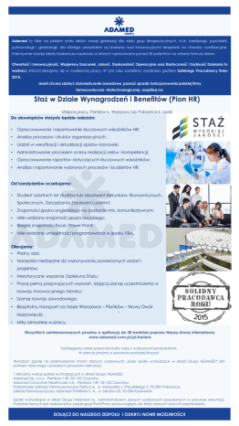 Adamed to lider na polskim rynku leków nowej generacji dla wielu grup terapeutycznych, m.in. kardiologii, psychiatrii, pulmonologii i ginekologii, dla którego priorytetem są badania nad innowacyjnymi terapiami na choroby cywilizacyjne. Intensywnie rozwija działy badawczo-naukowe, w których opracowano ponad 50 patentów na własne formuły leków. Otwartość i Innowacyjność, Wzajemny Szacunek, Jakość, Doskonałość Operacyjna oraz Elastyczność i Szybkość Działania to wartości, którymi kierujemy się w codziennej pracy. W tym roku zostaliśmy wyróżnieni godłem Solidnego Pracodawcy Roku 2015. Jeżeli chcesz zdobyć doświadczenie zawodowe, poznać sposób funkcjonowania polskiej firmy farmaceutyczno- biotechnologicznej, zaaplikuj na: Staż w Dziale Wynagrodzeń i Benefitów (Pion HR) Miejsce pracy: Pieńków k. Warszawy lub Pabianice k. Łodzi Do obowiązków stażysty będzie należało: • Opracowywanie i raportowanie kluczowych wskaźników HR; • Analiza procesów i struktur organizacyjnych; • Udział w weryfikacji i aktualizacji opisów stanowisk; • Administrowanie procesem oceny realizacji celów i kompetencji; • Opracowywanie raportów dotyczących kluczowych wskaźników; • Analiza i raportowanie wybranych procesów i budżetów HR. Od kandydatów oczekujemy: • Student ostatnich lat studiów lub absolwent kierunków: Ekonomicznych, Społecznych, Zarządzania Zasobami Ludzkimi; • Znajomości języka angielskiego na poziomie min. komunikatywnym; • Mile widziana znajomość języka rosyjskiego; • Biegłej znajomości Excel, Power Point; • Mile widziane umiejętności programowania w języku VBA. Oferujemy: • Płatny staż; • Narzędzia niezbędne do wykonywania powierzonych zadań i projektów; • Merytoryczne wsparcie Opiekuna Stażu; • Pracę pełną pasjonujących wyzwań, dającą szansę uczestniczenia w rozwoju innowacyjnego biznesu; • Szansę rozwoju zawodowego; • Bezpłatny transport na trasie Warszawa – Pieńków – Nowy Dwór . Mazowiecki; • Miłą atmosferę w pracy. Wszystkich zainteresowanych prosimy o aplikację do 30 kwietnia poprzez Naszą stronę internetową: www.adamed.com.pl/pl/kariera Zastrzegamy sobie prawo kontaktu tylko z wybranymi kandydatami. W ofercie prosimy o zawarcie poniższej klauzuli: Wyrażam zgodę na przetwarzanie moich danych osobowych, przez spółki wchodzące w skład Grupy ADAMED* dla potrzeb obecnego i przyszłych procesów rekrutacji . * Aktualny wykaz spółek wchodzących w skład Grupy ADAMED: Adamed Sp. z o.o., Pieńków 149, 05-152 Czosnów, Adamed Consumer Healthcare S.A., Pieńków 149, 05-152 Czosnów, Pabianickie Zakłady Farmaceutyczne Polfa S.A., ul. Marszałka J. Piłsudskiego 5, 95-200 Pabianice Zakład Farmaceutyczny Adamed PHARMA S. A., ul. Szkolna 33, 95-054 Ksawerów DO NASZEGO ZESPOŁU I pozyskanych ODKRYJ NOWE MOŻLIWOŚCI! Spółki wchodzące w skład Grupy Adamed sąDOŁĄCZ administratorem danych osobowych w procesie rekrutacji. Podanie danych jest dobrowolne, przysługuje Pani/Panu prawo wglądu do treści danych oraz ich poprawiania. DOŁĄCZ DO NASZEGO ZESPOŁU I ODKRYJ NOWE MOŻLIWOŚCI!