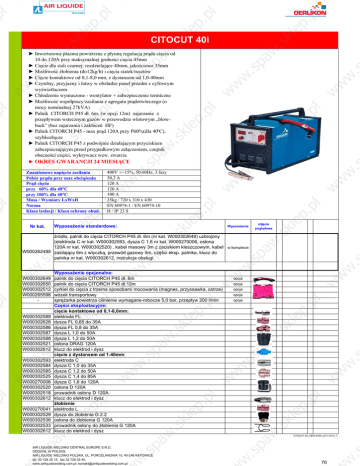 w ww ww w. .ssp pa aw w. .ssk k le le p p .p .p l l w ww ww w. .ssp pa aw w. .ssk k le le p p .p .p l l w ww ww w. .ssp pa aw w. .ssk k le le p p .p .p l l w ww ww w. .s p pl l ► Inwertorowa plazma powietrzna z płynną regulacją prądu cięcia od 10 do 120A przy maksymalnej grubości cięcia 45mm ► Cięcie dla stali czarnej: rozdzielające 40mm, jakościowe 35mm ► Możliwość żłobienia (do12kg/h) i cięcia siatek/rusztów ► Cięcie kontaktowe od 0,1-8,0 mm, z dystansem od 1,0-40mm ► Czytelny, przyjazny i łatwy w obsłudze panel przedni z cyfrowym wyświetlaczem ► Chłodzenie wymuszone - wentylator + zabezpieczenie termiczne ► Możliwość współpracy/zasilania z agregatu prądotwórczego (o mocy nominalnej 27kVA) ► Palnik CITORCH P45 dł. 6m, (w opcji 12m) zajarzanie z przepływem wstecznym gazów w przewodzie wlotowym „blowback” (bez zajarzania i zakłóceń HF) ► Palnik CITORCH P45 - max prąd 120A przy P60%(dla 40ºC), szybkozłącze ► Palnik CITORCH P45 z podwójnie działającym przyciskiem zabezpieczającym przed przypadkowym załączeniem, czujnik obecności części, wykrywacz wew. zwarcia ► OKRES GWARANCJI 24 MIESIĄCE Znamionowe napięcia zasilania Pobór prądu przy max obciążeniu Prąd cięcia przy 60% dla 40°C przy 100% dla 40°C Masa / Wymiary LxWxH Norma Klasa izolacji / Klasa ochrony obud. 400V +/-15%, 50-60Hz, 3 fazy 30,2 A 120 A 120 A 100 A 35kg / 720 x 310 x 430 EN 60974-1 / EN 60974-10 H / IP 23 S w ww ww w. .ssp pa aw w. .ssk k le le p p .p .p l l w ww ww w. .ssp pa aw w. .ssk k le le p p .p .p l l w ww ww w. .ssp pa aw w. .ssk k le le p p .p .p l l w ww ww w. .s p pl l w ww ww w. .ssp pa aw w. .ssk k le le p p .p .p l l w ww ww w. .ssp pa aw w. .ssk k le le p p .p .p l l w ww ww w. .ssp pa aw w. .ssk k le le p p .p .p l l w ww ww w. .s p pl l CITOCUT 40i Nr kat. Wyposażenie standardowe: Wyposażenie zdjęcie poglądowe W000302649 W000302650 W000302512 W000265598 - Wyposażenie opcjonalne: palnik do cięcia CITORCH P45 dł. 6m palnik do cięcia CITORCH P45 dł.12m cyrkiel do cięcia z trzema sposobami mocowania (magnes, przyssawka, ostrze) wózek transportowy sprężarka powietrza ciśnienie wymagane-robocze 5,0 bar, przepływ 200 l/min Części eksploatacyjne: cięcie kontaktowe od 0,1-8,0mm: elektroda FL dysza FL 0,65 do 35A dysza FL 0,8 do 35A dysza L 1,0 do 50A dysza L 1,2 do 50A osłona DRAG 120A klucz do elektrod i dysz cięcie z dystansem od 1-40mm: elektroda C dysza C 1,0 do 35A dysza C 1,2 do 50A dysza C 1,4 do 85A dysza C 1,6 do 120A osłona D 120A prowadnik osłony D 120A klucz do elektrod i dysz żłobienie elektroda L dysza do żłobienia G 2.2 osłona do żłobienia G 120A prowadnik osłony do żłobienia G 120A klucz do elektrod i dysz opcja opcja opcja opcja p pl l w ww ww w w. w. .ssp .ssp pa pa aw aw w. w. .ssk .ssk k le k le le p le p p .p p .p .p l .p l l l w ww ww w w. w. s .s p .ssp pa pa aw aw w. w. s .s k .ssk k le k le le p le p p .p p .p .p l .p l l l w ww ww w w. w. .ssp .ssp pa pa aw aw w. w. s .s k .ssk k le k le le p le p p .p p .p .p l .p l l l w ww ww w w. w. .s .s p pl l źródło, palnik do cięcia CITORCH P45 dł. 6m (nr kat. W000302649) uzbrojony (elektroda C nr kat. W000302593, dysza C 1,6 nr kat. W000270006, osłona 120A nr kat. W000302520) , kabel masowy 3m z zaciskiem kleszczowym, kabel w komplecie W000262495 zasilający 6m z wtyczką, przewód gazowy 5m, części eksp. palnika, klucz do palnika nr kat. W000302612, instrukcja obsługi W000302589 W000302628 W000302586 W000302587 W000302588 W000302521 W000302612 W000302593 W000302584 W000302585 W000302525 W000270006 W000302520 W000302518 W000302612 W000270041 W000302529 W000302536 W000302533 W000302612 opcja CITOCUT 40i_OERLIKON_2011.04.01_T AIR LIQUIDE WELDING CENTRAL EUROPE S.R.O. ODDZIAŁ W POLSCE: AIR LIQUIDE WELDING POLSKA, UL. PORCELANOWA 10, 40-246 KATOWICE tel. 32 728 35 15 , fax 32 728 35 45, www.airliquidewelding.com.pl; [email protected] 70
