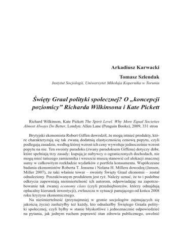 Arkadiusz Karwacki Tomasz Szlendak Instytut Socjologii, Uniwersytet Mikołaja Kopernika w Toruniu Święty Graal polityki społecznej? O „koncepcji poziomicy” Richarda Wilkinsona i Kate Pickett Richard Wilkinson, Kate Pickett The Spirit Level. Why More Equal Societies Almost Always Do Better, Londyn: Allen Lane (Penguin Books), 2009, 331 stron Brytyjski ekonomista Robert Giffen dowodził, że mogą istnieć produkty, które charakteryzują się tak zwaną dodatnią elastycznością cenową popytu, czyli podlegają zasadzie, według której wzrost ich ceny wywołuje jednocześnie wzrost popytu na nie. Ten swoisty paradoks (zwany paradoksem Giffena) dotyczy dóbr, które spełniają trzy zasady: kupują je nabywcy o ograniczonych dochodach, nie mogą mieć tańszego zamiennika i wreszcie muszą stanowić cel alokacji znacznej sumy w całkowitym rozkładzie wydatków z portfela konsumenta. Współczesne badania ekonomistów Roberta T. Jensena i Nolana H. Millera dowodzą (Jansen, Miller 2007), że taki właśnie towar – swoisty Święty Graal ekonomii – został odnaleziony. Poszukiwanym produktem jest ryż. Należy uznać, że to i podobne odkrycia zapewniają nieśmiertelność ich autorom, odpowiadając na zapotrzebowanie tak zwanej economy class (czyli przedsiębiorców, którzy odnajdują opłacalny kierunek inwestycji), zwłaszcza w sytuacji panującego od końca 2008 roku kryzysu ekonomicznego. Na nieśmiertelność (przynajmniej w gronie socjologów zajmujących się jakością życia) zasłużyłby też każdy, kto odnalazłby Świętego Graala polityki społecznej, czyli byłby w stanie błyskotliwe i jednoznacznie odpowiedzieć na pytania, jak jednym ruchem poprawić stan zdrowia publicznego, uwolnić 220 Arkadiusz Karwacki, Tomasz Szlendak ludzi od generowanych społecznie dysfunkcji psychicznych i fizycznych oraz zaprowadzić powszechny socjalny dobrobyt skutkujący mniejszym stresem (generującym różnorakie schorzenia). Jest to swoiste pytanie o charakter recepty na wielowymiarowe społeczne problemy w drodze ku uzdrowieniu, czyli funkcjonowaniu dostatniego, wolnego od aberracji społeczeństwa zabezpieczonych socjalnie, zdrowych obywateli skłonnych do zawiązywania więzi z innymi. Jak wiadomo, proces poszukiwania klucza do „socjalnej szczęśliwości”, mimo prób dochodzenia do konsensu, racjonalizacji stanowisk i poszukiwania rozwiązań ponad podziałami ideologicznymi, w praktyce (czyli debatach i decyzjach politycznych, w ramach sporów naukowych, ale także w ramach codziennych dyskusji między uczestnikami życia społecznego) najczęściej i tak kończy się eksponowaniem jednego z dwóch przeciwstawnych poglądów. Z jednej strony, jest to akcent położony na rozbudowaną rolę i doniosłość redystrybutywnie ukierunkowanego państwa, które ma chronić, zabezpieczać, leczyć i uczyć obywateli (Wilensky 1975). Wszechstronne zaangażowanie państwa i jego instytucji w zaspokajanie podstawowych potrzeb obywateli, z prymarną rolą tegoż państwa jako gwaranta darmowych usług wysokiej jakości, ma być gwarantem drogi do dobrobytu. Z drugiej strony, wskazuje się na sprawiedliwość drzemiącą w nieskrępowanych regułach rynkowych, uwolnionych od dysfunkcji płynących z kolektywnych (czytaj: nieefektywnych) wyborów, opiekuńczej niesprawiedliwości faworyzowania jednych kosztem drugich i moralnego skażenia związanego z przyznawaniem ludziom nieradzącym sobie w życiu tłustych ryb, zamiast wypożyczanej na krótko wędki (Nozick 1974; Olson 1965, 1982; Murray 1984). Po lewej stronie tego sporu pojawiła się ostatnio koncepcja (w tekście nazywamy ją „koncepcją poziomicy”) autorstwa brytyjskich epidemiologów Richarda Wilkinsona i Kate Pickett, która zasługuje na baczniejszą uwagę, ponieważ pretenduje do miana odkrycia na miarę Świętego Graala polityki społecznej, skupionej m.in. na poprawie jakości zdrowia publicznego. Koncepcja poziomicy to bez wątpienia odkrywczy, lecz dosyć kontrowersyjny pogląd, że aby poprawić jakość zdrowia psychicznego i fizycznego ludności, a także zredukować w społeczeństwie liczbę ludzi otyłych i liczbę przypadków śmierci wśród niemowląt, wystarczy redukcja nierówności społecznych poprzez spłaszczenie rozpiętości dochodów. Jeśli odkrycie brytyjskich epidemiologów zostałoby potwierdzone i uznane przez innych badaczy, mielibyśmy do czynienia z epokowym osiągnięciem, rewolucjonizującym dyskurs w obrębie wielu dyscyplin (przede wszystkim polityki społecznej i ekonomii, ale także w ramach socjologii, nauk politycznych, filozofii i nauk pedagogicznych). Potwierdzenie odkrycia Wilkinsona i Pickett oznaczałoby konieczność mobilizacji środowisk decyzyjnych (opinio- i wiedzotwórczych) w czytelnie zdefiniowanym kierunku: do kreowania systemu działań, których konsekwencją miałaby być egalitarna struktura rozkładu dochodów, a w efekcie wysoka jakość zdrowia publicz- Święty Graal polityki społecznej? O „koncepcji poziomicy”... 221 nego, spadek przestępczości, wysoki stopień zaktywizowania obywateli i duża aktywność kulturalna. Środowiska naukowe zyskałyby odpowiedź na pytanie o genezę wielu dysfunkcyjnych zjawisk i procesów, namysł nad którymi wypełnia ich codzienną pracę. Mając powyższe na względzie należy stwierdzić, że lekturze książki Wilkinsona i Pickett towarzyszą nurtujące pytania. Czy rzeczywiście istnieją niezbite dowody na to, że duże nierówności w rozkładzie dochodów w konkretnym kraju warunkują równie wielką skalę wszelkich dysfunkcji biologicznych i społecznych? I czy prawdą jest, że egalitarna struktura rozkładu dochodów kreuje silną więź społeczną między obywatelami, zapewnia wysoką jakość kondycji zdrowotnej, wysoki poziom wyedukowania albo redukuje przestępczość1? Roszczenie do uniwersalności i zarazem doniosłości naukowego odkrycia wpisane w treść książki brytyjskich badaczy na