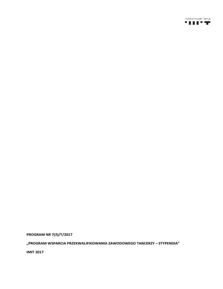 PROGRAM NR 7(2)/T/2017 „PROGRAM WSPARCIA PRZEKWALIFIKOWANIA ZAWODOWEGO TANCERZY – STYPENDIA” IMIT 2017 PROGRAM WSPARCIA PRZEKWALIFIKOWANIA ZAWODOWEGO TANCERZY 2017 REGULAMIN PROGRAMU STYPENDIALNEGO CELE PROGRAMU Celem Programu jest wspieranie profesjonalnych tancerzy tańca artystycznego w Polsce w procesie identyfikowania własnego potencjału zawodowego i planowania rozwoju zawodowego poza zawodem tancerza wykonawcy oraz w procesie zdobywania kwalifikacji zawodowych i doświadczenia, niezbędnych do rozpoczęcia drugiej ścieżki kariery zawodowej, po zakończeniu kariery scenicznej. OPIS W ramach Programu tancerze mogą korzystać z bezpłatnych konsultacji doradców zawodowych i psychologa, bezpłatnie uczestniczyć w warsztatach oraz otrzymać stypendium na realizację indywidualnych projektów przekwalifikowania zawodowego, przygotowanych we współpracy z doradcą zawodowym (pokrycie kosztów studiów/kursów/warsztatów/staży i praktyk; dojazdu i noclegu; kosztów ubezpieczenia zdrowotnego oraz, w szczególnych przypadkach, kosztów utrzymania w trakcie realizacji projektu przekwalifikowania. REGULAMIN OGÓLNY PROGRAMU Podstawowe pojęcia występujące w niniejszym Regulaminie (dalej jako „Regulamin”): Program – Program wsparcia przekwalifikowania zawodowego tancerzy realizowany przez Instytut Muzyki i Tańca (dalej „IMiT”) z siedzibą w Warszawie, adres: ul. Fredry 8, 00-097 Warszawa, będący państwową instytucją kultury, zarejestrowany w rejestrze instytucji kultury pod numerem RIK 83/2010; Instytut Muzyki i Tańca / IMiT – instytucja będąca operatorem Programu; Wnioskodawca – osoba składająca wniosek stypendialny w ramach Programu; Beneficjent – osoba, która uzyskała w ramach Programu stypendium na realizację indywidualnego Projektu przekwalifikowania zawodowego; Projekt – indywidualny plan przekwalifikowania zawodowego złożony z opisu, harmonogramu działań i budżetu opracowany przez Wnioskodawcę we współpracy z doradcą zawodowym. 2 PROGRAM WSPARCIA PRZEKWALIFIKOWANIA ZAWODOWEGO TANCERZY 2017 1. Każdy Wnioskodawca może złożyć tylko jeden wniosek stypendialny w danej edycji Programu. 2. Beneficjent Programu, który otrzymał w ramach Programu stypendium na realizację Projektu z zakresu przekwalifikowania zawodowego, nie może w latach następnych składać w ramach Programu wniosku stypendialnego na realizację innego Projektu przekwalifikowania zawodowego. Każdy Beneficjent Programu może natomiast w trakcie oraz po zakończeniu realizacji indywidualnego Projektu przekwalifikowania zawodowego korzystać w ramach Programu z innych form wsparcia (sesje z doradcą zawodowym, psychologiem, udział w warsztatach). 3. Rozliczenie merytoryczne i finansowe otrzymanego stypendium lub transzy stypendium następuje zgodnie z umową zawartą pomiędzy Beneficjentem a IMiT, nie później niż do 15 grudnia roku, w którym zrealizowany został Projekt lub moduł Projektu. 4. Maksymalna wysokość stypendium na realizację całego indywidualnego Projektu z zakresu przekwalifikowania zawodowego określona zostanie w Regulaminie każdej edycji Programu. W ramach Programu dofinansowana jest realizacja indywidualnego Projektu z zakresu przekwalifikowania zawodowego, rozłożonego minimalnie na okres 3 miesięcy i maksymalnie na okres 44 miesięcy, przy czym w wypadku Projektów realizowanych w trybie wieloletnim dofinansowanie na 2., 3., 4. i 5. rok kalendarzowy przyznawane jest w formie promesy, a następnie wypłacane zgodnie z harmonogramem określonym w umowie zawartej pomiędzy Beneficjentem a Instytutem Muzyki i Tańca, po zaakceptowaniu przez IMiT rozliczenia merytorycznego i finansowego działań zrealizowanych w poprzednim roku. REGULAMIN II EDYCJI PROGRAMU I. 3 TERMINY I TRYB NABORU WNIOSKÓW W II EDYCJI PROGRAMU 1. W II edycji Programu nabory są realizowane w następujących terminach wniosków: a. I nabór: do 15 marca 2017; b. II nabór: do 30 maja 2017; c. III nabór: do 15 września 2017 2. Wnioski (podpisany formularz aplikacyjny wraz z załącznikami) należy przesłać drogą mailową (dokumenty zeskanowane do jednego pliku PDF) na adres mailowy: [email protected] oraz pocztą na adres: Instytut Muzyki i Tańca, ul. Fredry 8, 00-097 Warszawa, z dopiskiem na kopercie: „przekwalifikowanie zawodowe tancerzy” (decyduje data stempla pocztowego). 3. Wnioskodawcom mogą zostać przyznane stypendia: a. w wypadku wniosków składanych w pierwszym naborze – na Projekty przekwalifikowania realizowane w okresie od 1 kwietnia 2017 do 30 listopada 2020, minimalnie przez 3 kolejne miesiące. Realizacja indywidualnego Projektu przekwalifikowania zawodowego musi rozpocząć się w 2017 roku, a dofinansowanie na 2., 3. i 4. rok kalendarzowy przyznawane jest w formie promesy. PROGRAM WSPARCIA PRZEKWALIFIKOWANIA ZAWODOWEGO TANCERZY 2017 4. 5. 6. 7. b. w wypadku wniosków składanych w drugim naborze – na Projekty przekwalifikowania realizowane od 1 lipca 2017 do 28 lutego 2021, minimalnie przez 3 kolejne miesiące. Realizacja indywidualnego Projektu przekwalifikowania zawodowego musi rozpocząć się w 2017 roku, a dofinansowanie na 2., 3., 4. i 5. rok kalendarzowy przyznawane jest w formie promesy. c. w wypadku wniosków składanych w trzecim naborze – na Projekty przekwalifikowania realizowane od 1 października 2017 do 30 maja 2021, minimalnie przez 3 kolejne miesiące. Realizacja indywidualnego Projektu przekwalifikowania zawodowego musi rozpocząć się w 2017 roku, a dofinansowanie na 2., 3., 4. i 5. rok kalendarzowy przyznawane jest w formie promesy. Przed złożeniem wniosku Wnioskodawca jest zobligowany do odbycia minimum 1 indywidualnej konsultacji z doradcą zawodowym zatrudnionym przez IMiT i uzyskania od niego pisemnej opinii opracowanej na podstawie wypełnionego wniosku stypendialnego. Aby umówić się na indywidualne konsultacje z doradcą zawodowym należy zgłosić się do koordynatora Programu (dane kontaktowe w pun