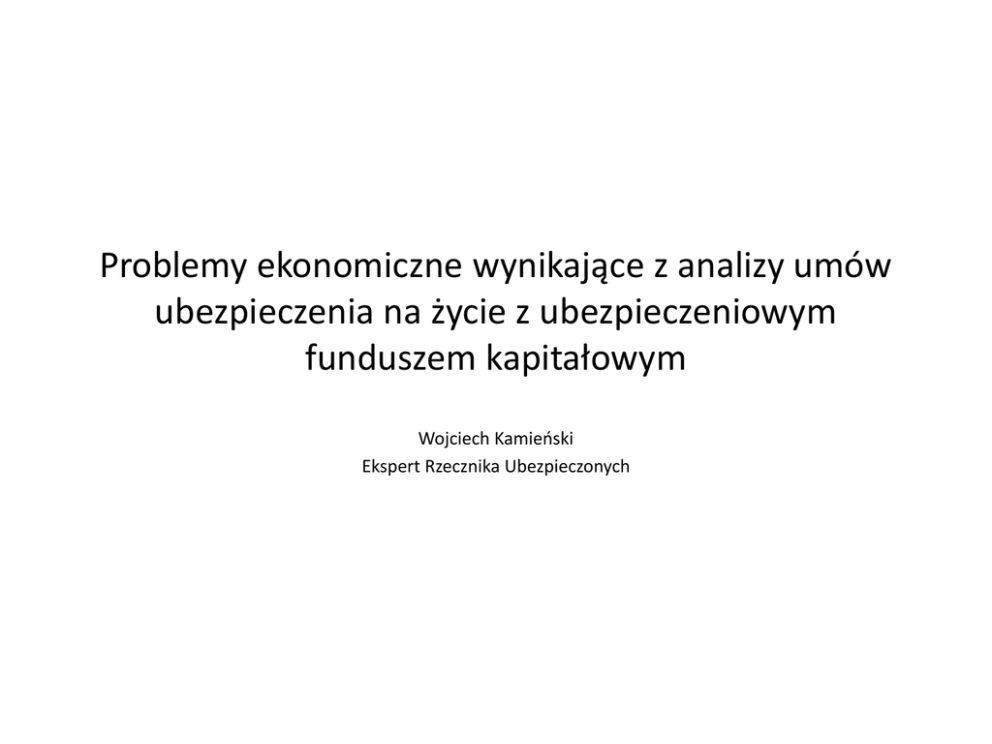 Problemy ekonomiczne wynikające z analizy umów ubezpieczenia na życie z ubezpieczeniowym funduszem kapitałowym Wojciech Kamieński Ekspert Rzecznika Ubezpieczonych Pytanie o „poliso-fundusze” (Z-ca Przewodniczącego KNF - W. Kwaśniak - w TVN CNBC 10.01.2013) Analiza produktowa • • • • Ubezpieczenie typu endowment Ubezpieczenie typu unit-linked Ubezpieczenie hybrydowe (endowment +unit-linked + indeks) Ubezpieczenie jednostkowe i quasi-ubezpieczenie grupowe Ubezpieczenie typu endowment (Cechy ubezpieczenia na życie i dożycie) • • • • • • • • Cel oszczędnościowo-ochronny Umowa na czas oznaczony (dożycie określonego wieku) Maksymalny wiek wstępu Określona suma na wypadek śmierci i na wypadek dożycia Gwarancja wpłaconych środków (składki oszczędnościowej) Gwarancja zysku (stopa techniczna ubezpieczenia) Zdefiniowana wartość wykupu Redukcja ubezpieczenia i ubezpieczenie wolne od opłaty składki Ubezpieczenie typu unit-linked (Cechy ubezpieczenia na życie z ubezpieczeniowym funduszem kapitałowym) • • • • • • • • • • • • Cel inwestycyjno-oszczędnościowy Znikoma suma ubezpieczenia Umowa na czas nieoznaczony Ryzyko inwestycyjne Brak gwarancji zysku i zwrotu wpłaconych środków Ubezpieczeniowy fundusz kapitałowy i jednostka uczestnictwa Możliwość zmiany struktury portfela Możliwość częściowego wykupu ubezpieczenia Ubezpieczenie wolne od opłaty składek Opłata za zarządzenia liczona od bieżącej wartości aktywów Opłata likwidacyjna (*) Brak indeksu Hybryda ubezpieczenia endowment i ubezpieczenia unit-linked (1) (Cechy ubezpieczenia na życie i dożycie z ubezpieczeniowym funduszem kapitałowym powiązanego z indeksem) • • • • • • • • • Cel stricte inwestycyjny Znikoma suma ubezpieczenia Umowa na czas oznaczony Brak maksymalnego wieku wstępu Ryzyko inwestycyjne Indeks Gwarancja zwrotu zainwestowanych środków (*) Ubezpieczeniowy fundusz kapitałowy Jednostka uczestnictwa Hybryda ubezpieczenia endowment i ubezpieczenia unit-linked (2) (Cechy ubezpieczenia na życie i dożycie z ubezpieczeniowym funduszem kapitałowym powiązanego z indeksem) • • • • • • • Brak możliwość zmiany struktury portfela Brak możliwość częściowego wykupu ubezpieczenia Brak możliwości opłacania składek ze zgromadzonego kapitału Opłata za zarządzenia Wartość wykupu Opłata likwidacyjna (*) Spektrum ryzyk Efektywność ubezpieczenia hybrydowego (1) (dla stałej ceny jednostki uczestnictwa równej cenie nominalnej) Efektywność ubezpieczenia hybrydowego (2) (dla stałej ceny jednostki uczestnictwa równej cenie nominalnej) Efektywność ubezpieczenia hybrydowego (3) (dla stałej ceny jednostki uczestnictwa równej cenie nominalnej) Efektywność ubezpieczenia hybrydowego (4) (dla stałej ceny jednostki uczestnictwa równej cenie nominalnej) Efektywność ubezpieczenia hybrydowego (5) (dla ceny jednostki uczestnictwa oszacowanej na podstawie danych historycznych) Efektywność ubezpieczenia hybrydowego (6) (dla ceny jednostki uczestnictwa oszacowanej na podstawie danych historycznych) Efektywność ubezpieczenia hybrydowego (7) (dla ceny jednostki uczestnictwa oszacowanej na podstawie danych historycznych) Efektywność ubezpieczenia hybrydowego (8) (Index: BNP PARIBAS NF8 Europe Excess Return Index; UFK: Pareto II - New Frontier III) Efektywność ubezpieczenia hybrydowego (9) (Index: BNP PARIBAS NF8 Europe Excess Return Index; UFK: Pareto II - New Frontier III) Efektywność ubezpieczenia hybrydowego (10) (BNP PARIBAS NF8 Europe Excess Return Index - BNPINF8E:IND) Efektywność ubezpieczenia hybrydowego (11) (Podsumowanie) • • • • • • • • Opłata za obsługę stanowi 12,59% składki wpłaconej przez 15 lat trwania inwestycji Kwota zainwestowana w jednostki u.f.k. to 87,41% wpłaconych składek Koszt = 0 => kurs zamknięcia będzie o 14,40% wyższy od kursu początkowego Procent składany dla wpłaconych składek (przy rocznej stopie 3,0% i rocznej kapitalizacji odsetek) to 32,62% (26,41% przy pomniejszeniu o 19% PIT) W ubezpieczeniu endowment roczna stopa techniczna (roczna stopa dyskonta rezerwy na dożycie) wynosi ≈ 3,0% Dla rzeczywistej stopy procentowej 26,41% indeks na zakończenie inwestycji musiałby być o 44,63% wyższy od indeksu początkowego. Po 34 miesiącach wartość indeksu spadła o 15,0%. Na dzień obserwacji poziom indeksu, który kompensuje koszty to 446 pkt - indeks musiałby wzrosnąć o 35,0% WIG pomiędzy kursem otwarcia (Indeks_initial) a kursem zamknięcia (Indeks_final) wzrósł o 1,0% Efektywność ubezpieczenia hybrydowego (12) (Podsumowanie) • • • • • Cena jednostki u.f.k. od sty 2010 r. do list 2012 r. spadła z 200 PLN do 34,28 PLN (tj. o 82,86%) Różnica pomiędzy ceną nominalną jednostki u.f.k. (200 PLN) i ceną pierwszego notowania (118,14 PLN) oznacza „na wejście” spadek na wartości o ≈ 41,0% W tym samym okresie obserwacji spadek indeksu wyniósł 15,0%, a spadek ceny jednostki u.f.k. 82,0% Notowanie indeksu w dniu zamknięcia inwestycji (po 15 latach) decyduje o wysokości premii i przekroczeniu poziomów referencyjnych: kompensaty kosztów oraz alternatywnego zysku Notowanie jednostki u.f.k. decyduje o wartości rachunku jednostek uczestnictwa, a po potrąceniu opłaty likwidacyjnej – o wartość wykupu Dziękuję za uwagę Wojciech Kamieński Ekspert Rzecznika Ubezpieczonych