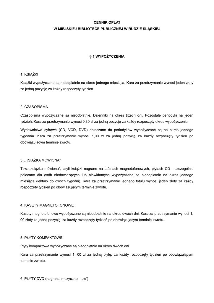 CENNIK OPŁAT W MIEJSKIEJ BIBLIOTECE PUBLICZNEJ W RUDZIE ŚLĄSKIEJ § 1 WYPOŻYCZENIA 1. KSIĄŻKI Książki wypożyczane są nieodpłatnie na okres jednego miesiąca. Kara za przetrzymanie wynosi jeden złoty za jedną pozycję za każdy rozpoczęty tydzień. 2. CZASOPISMA Czasopisma wypożyczane są nieodpłatnie. Dzienniki na okres trzech dni. Pozostałe periodyki na jeden tydzień. Kara za przetrzymanie wynosi 0,30 zł za jedną pozycję za każdy rozpoczęty okres wypożyczenia. Wydawnictwa cyfrowe (CD, VCD, DVD) dołączane do periodyków wypożyczane są na okres jednego tygodnia. Kara za przetrzymanie wynosi 1,00 zł za jedną pozycję za każdy rozpoczęty tydzień po obowiązującym terminie zwrotu. 3. „KSIĄŻKA MÓWIONA” Tzw. „książka mówiona”, czyli książki nagrane na taśmach magnetofonowych, płytach CD - szczególnie polecane dla osób niedowidzących lub niewidomych wypożyczane są nieodpłatnie na okres jednego miesiąca (lektury do dwóch tygodni). Kara za przetrzymanie jednego tytułu wynosi jeden złoty za każdy rozpoczęty tydzień po obowiązującym terminie zwrotu. 4. KASETY MAGNETOFONOWE Kasety magnetofonowe wypożyczane są nieodpłatnie na okres dwóch dni. Kara za przetrzymanie wynosi 1, 00 złoty za jedną pozycję, za każdy rozpoczęty tydzień po obowiązującym terminie zwrotu. 5. PŁYTY KOMPAKTOWE Płyty kompaktowe wypożyczane są nieodpłatnie na okres dwóch dni. Kara za przetrzymanie wynosi 1, 00 zł za jedną płytę, za każdy rozpoczęty tydzień po obowiązującym terminie zwrotu. 6. PŁYTY DVD (nagrania muzyczne – „m”) Płyty DVD z nagraniami muzycznymi wypożyczane są nieodpłatnie na okres dwóch dni. Kara za przetrzymanie wynosi 1, 00 zł za jedną płytę, za każdy rozpoczęty tydzień po obowiązującym terminie zwrotu. 7. WYDAWNICTWA MULTIMEDIALNE Wydawnictwa multimedialne (poza lekturami) wypożyczane są nieodpłatnie na okres dwóch dni. Wydawnictwa multimedialne-lektury wypożyczane są nieodpłatnie na okres dwóch tygodni. Kara za przetrzymanie wynosi 5, 00 zł za jedno wydawnictwo, za każdy rozpoczęty tydzień po obowiązującym terminie zwrotu. 8. PLAYSTATION 3 (PS3) Gry na konsolę PlayStation 3 (PS3) wypożyczane są nieodpłatnie na okres dwóch dni. Kara za przetrzymanie wynosi 5,00 zł za jedno wydawnictwo, za każdy rozpoczęty tydzień po obowiązującym terminie zwrotu. 9. FILMY: PŁYTY DVD , BD-ROM (Blu-ray Disc), Filmy wypożyczane są odpłatnie: a) film fabularny (nowość: do 1 miesiąca) - 6, 00 zł na dwie doby, b) film fabularny – 3, 00 zł na dwie doby, c) film dokumentalny - nieodpłatnie, d) bajki dla dzieci - nieodpłatnie. e) adaptacje filmowe lektur dla szkół podstawowych, gimnazjalnych i średnich - nieodpłatnie f) cena karnetu na wypożyczenie 11 filmów wynosi 30,00 zł. g) dopuszcza się zmianę ceny wypożyczeń zbiorów i usług informacyjnych w akcjach promocyjnych. Wszystkie filmy wypożycza się na dwie doby. Kary za przetrzymanie traktowane są jak pełnopłatne dodatkowe wypożyczenie. Instytucje kultury, szkoły, ośrodki opieki społecznej oraz stowarzyszenia wypożyczają filmy nieodpłatnie § 2 KAUCJE I ODSZKODOWANIA 1. KAUCJE Za wypożyczenie szczególnie cennego dokumentu (książka, wydawnictwo cyfrowe) obowiązuje kaucja w kwocie, co najmniej aktualnej, rynkowej wartości pozycji. 2. ODSZKODOWANIA 1. Wysokość odszkodowania za dokument (książka, czasopismo, płyta CD, taśma magnetofonowa, taśma wideo i inne) zagubiony, zniszczony lub uszkodzony ustala kierownik wypożyczalni w zależności od aktualnej, rynkowej wartości tegoż dokumentu. 2. Czytelnik może za zgodą kierownika wypożyczalni, dostarczyć zamiast zagubionej lub zniszczonej pozycji inną książkę, o takich samych cechach wydawniczych. § 3 POZOSTAŁE USŁUGI 1. USŁUGI KSEROGRAFICZNE 1) odbitki czarno-białe a) format A4 · odbitka jednostronna - 0, 15 zł, · odbitka dwustronna - 0, 20 zł, · odbitka jednej strony książki + 0, 05 zł do ceny kopii dokumentu płaskiego. Bonifikata powyżej 20 sztuk wynosi 10%. b) format A3 · odbitka jednostronna - 0, 20 zł, · odbitka dwustronna - 0, 30 zł, · odbitka jednej strony książki + 0, 05 zł do ceny kopii dokumentu płaskiego. Bonifikata powyżej 20 sztuk wynosi 10%. 2) odbitki kolorowe a) format A4 · odbitka – 1,5 zł, Bonifikata powyżej 20 sztuk wynosi 10%. b) format A3 · odbitka – 2,5 00 zł Bonifikata powyżej 20 sztuk wynosi 10%.” 2. USŁUGI INFORMACYJNE 1) prymarne usługe informacyjne (karta biblioteczna) – 7 zł 2) opracowania informacyjne i bibliograficzne – cenę tegoż opracowania ustala bibliotekarz opracowujący tenże dokument pochodny, nie może być jednak większa niż 30 zł za znormalizowaną stronę maszynopisu. 3. INTERNET - korzystanie z Internetu jest nieodpłatne, - wydruk strony A4 wynosi 0, 50 zł. 4. DOSTĘP DO INFORMACJI PUBLICZNEJ - wykonanie odbitki 1 szt. A-4 jednostronnie ; 0,25 zł dwustronnie 0,30 zł - wykonanie odbitki 1 szt. A-4 jednostronnie ; 0,30 zł dwustronnie 0,35 zł - informacja na dyskietce 1,50 zł ; informacja na płycie CD 2,50 zł Niniejszy Cennik obowiązuje od 1 stycznia 2012 roku.
