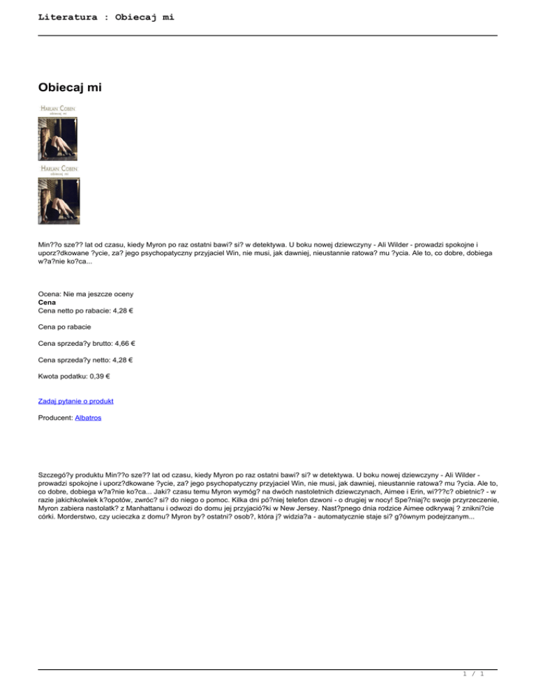 Literatura : Obiecaj mi Obiecaj mi Min??o sze?? lat od czasu, kiedy Myron po raz ostatni bawi? si? w detektywa. U boku nowej dziewczyny - Ali Wilder - prowadzi spokojne i uporz?dkowane ?ycie, za? jego psychopatyczny przyjaciel Win, nie musi, jak dawniej, nieustannie ratowa? mu ?ycia. Ale to, co dobre, dobiega w?a?nie ko?ca... Ocena: Nie ma jeszcze oceny Cena Cena netto po rabacie: 4,28 € Cena po rabacie Cena sprzeda?y brutto: 4,66 € Cena sprzeda?y netto: 4,28 € Kwota podatku: 0,39 € Zadaj pytanie o produkt Producent: Albatros Szczegó?y produktu Min??o sze?? lat od czasu, kiedy Myron po raz ostatni bawi? si? w detektywa. U boku nowej dziewczyny - Ali Wilder prowadzi spokojne i uporz?dkowane ?ycie, za? jego psychopatyczny przyjaciel Win, nie musi, jak dawniej, nieustannie ratowa? mu ?ycia. Ale to, co dobre, dobiega w?a?nie ko?ca... Jaki? czasu temu Myron wymóg? na dwóch nastoletnich dziewczynach, Aimee i Erin, wi???c? obietnic? - w razie jakichkolwiek k?opotów, zwróc? si? do niego o pomoc. Kilka dni pó?niej telefon dzwoni - o drugiej w nocy! Spe?niaj?c swoje przyrzeczenie, Myron zabiera nastolatk? z Manhattanu i odwozi do domu jej przyjació?ki w New Jersey. Nast?pnego dnia rodzice Aimee odkrywaj ? znikni?cie córki. Morderstwo, czy ucieczka z domu? Myron by? ostatni? osob?, która j? widzia?a - automatycznie staje si? g?ównym podejrzanym... 1 / 1 Powered by TCPDF (www.tcpdf.org)