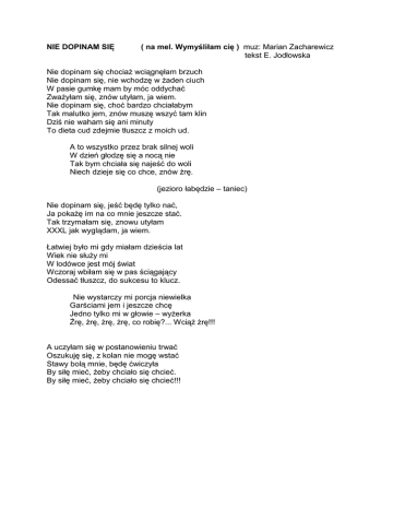 NIE DOPINAM SIĘ ( na mel. Wymyśliłam cię ) muz: Marian Zacharewicz tekst E. Jodłowska Nie dopinam się chociaŜ wciągnęłam brzuch Nie dopinam się, nie wchodzę w Ŝaden ciuch W pasie gumkę mam by móc oddychać ZwaŜyłam się, znów utyłam, ja wiem. Nie dopinam się, choć bardzo chciałabym Tak malutko jem, znów muszę wszyć tam klin Dziś nie waham się ani minuty To dieta cud zdejmie tłuszcz z moich ud. A to wszystko przez brak silnej woli W dzień głodzę się a nocą nie Tak bym chciała się najeść do woli Niech dzieje się co chce, znów Ŝrę. (jezioro łabędzie – taniec) Nie dopinam się, jeść będę tylko nać, Ja pokaŜę im na co mnie jeszcze stać. Tak trzymałam się, znowu utyłam XXXL jak wyglądam, ja wiem. Łatwiej było mi gdy miałam dzieścia lat Wiek nie słuŜy mi W lodówce jest mój świat Wczoraj wbiłam się w pas ściągający Odessać tłuszcz, do sukcesu to klucz. Nie wystarczy mi porcja niewielka Garściami jem i jeszcze chcę Jedno tylko mi w głowie – wyŜerka śrę, Ŝrę, Ŝrę, Ŝrę, co robię?... WciąŜ Ŝrę!!! A uczyłam się w postanowieniu trwać Oszukuję się, z kolan nie mogę wstać Stawy bolą mnie, będę ćwiczyła By siłę mieć, Ŝeby chciało się chcieć. By siłę mieć, Ŝeby chciało się chcieć!!!