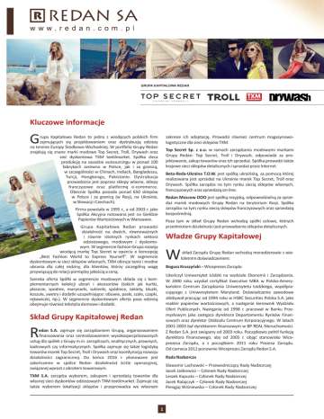 GRUPA KAPITAŁOWA REDAN Kluczowe informacje G zakresie ich adaptację. Prowadzi również centrum magazynowologistyczne dla sieci sklepów TXM. rupa Kapitałowa Redan to jedna z wiodących polskich firm zajmujących się projektowaniem oraz dystrybucją odzieży na terenie Europy Środkowo-Wschodniej. W portfolio Grupy Redan znajdują się znane marki modowe Top Secret, Troll, Drywash oraz sieć dyskontowa TXM textilmarket. Spółka zleca produkcję na zasadzie outsourcingu w ponad 100 fabrykach zarówno w Polsce, jak i za granicą, w szczególności w Chinach, Indiach, Bangladeszu, Turcji, Hongkongu, Pakistanie. Dystrybucja prowadzona jest poprzez sklepy własne, sklepy franczyzowe oraz platformę e-commerce. Obecnie Spółka posiada ponad 650 sklepów w Polsce i za granicą (w Rosji, na Ukrainie, w Słowacji i Czechach). Top Secret Sp. z o.o. w ramach zarządzania modowymi markami Grupy Redan: Top Secret, Troll i Drywash, odpowiada za projektowanie, zakup towarów oraz ich sprzedaż. Spółka prowadzi także krajowe sieci sklepów detalicznych i sprzedaż przez Internet. Beta-Reda-Ukraina T.O.W. jest spółką ukraińską, za pomocą której realizowana jest sprzedaż na Ukrainie marek Top Secret, Troll oraz Drywash. Spółka zarządza na tym rynku siecią sklepów własnych, franczyzowych oraz sprzedażą on-line. Redan Moscow OOO jest spółką rosyjską, odpowiedzialną za sprzedaż marek modowych Grupy Redan na terytorium Rosji. Spółka zarządza na tym rynku siecią sklepów franczyzowych oraz sprzedażą bezpośrednią. Firma powstała w 1995 r., a od 2003 r. jako Spółka Akcyjna notowana jest na Giełdzie Papierów Wartościowych w Warszawie. Poza tym w skład Grupy Redan wchodzą spółki celowe, których przedmiotem działalności jest prowadzenie sklepów detalicznych. Grupa Kapitałowa Redan prowadzi działalność na dwóch, równoważnych i równie istotnych rynkach sektora odzieżowego, modowym i dyskontowym. W segmencie fashion Grupa rozwija wiodącą markę Top Secret w oparciu o koncepcję „Best Fashion World to Express Yourself”. W segmencie dyskontowym w sieci sklepów własnych, TXM oferuje tanie i modne ubrania dla całej rodziny, dla klientów, którzy szczególną wagę przywiązują do relacji pomiędzy jakością a ceną. Władze Grupy Kapitałowej W skład Zarządu Grupy Redan wchodzą menedżerowie z wieloletnim doświadczeniem: Bogusz Kruszyński – Wiceprezes Zarządu Ukończył Uniwersytet Łódzki na wydziale Ekonomii i Zarządzania. W 2000 roku uzyskał certyfikat Executive MBA w Polsko-Amerykańskim Centrum Zarządzania Uniwersytetu Łódzkiego, współpracującego z Uniwersytetem Maryland. Doświadczenie zawodowe zdobywał pracując od 1994 roku w HSBC Securities Polska S.A. jako makler papierów wartościowych, a następnie kierownik Wydziału Ofert Publicznych. Następnie od 1998 r. pracował w Banku Przemysłowym jako zastępca dyrektora Departamentu Rynków Finansowych oraz dyrektor Oddziału Centrum Korporacyjnego. W latach 2001-2003 był dyrektorem finansowym w BP REAL Nieruchomości. Z Redan S.A. jest związany od 2003 roku. Początkowo pełnił funkcję dyrektora finansowego, aby od 2005 r. objąć stanowisko Wiceprezesa Zarządu, a z początkiem 2011 roku Prezesa Zarządu. Od czerwca 2012 ponownie Wiceprezes Zarządu Redan S.A. Szeroka oferta Spółki w segmencie modowym składa się z komplementarnych kolekcji ubrań i akcesoriów (takich jak kurtki, płaszcze, spodnie, marynarki, sukienki, spódnice, żakiety, bluzki, koszule, swetry i dodatki uzupełniające: obuwie, paski, szale, czapki, rękawiczki, itp.). W segmencie dyskontowym oferta poza odzieżą obejmuje również tekstylia domowe i dodatki. Skład Grupy Kapitałowej Redan R edan S.A. zajmuje się zarządzaniem Grupą, organizowaniem finansowania oraz centralizowaniem wysokospecjalizowanych usług dla spółek z Grupy m.in. zarządczych, analitycznych, prawnych, kadrowych czy informatycznych. Spółka zajmuje się także logistyką towarów marek Top Secret, Troll i Drywash oraz koordynacją rozwoju działalności zagranicznej. Do końca 2016 r. planowane jest zakończenie w spółce Redan działalności ściśle operacyjnej, związanej wprost z obrotem towarowym. Rada Nadzorcza Sławomir Lachowski – Przewodniczący Rady Nadzorczej Jacek Jaśkiewicz – Członek Rady Nadzorczej Leszek Kapusta – Członek Rady Nadzorczej Jacek Ratajczyk – Członek Rady Nadzorczej Piengjaj Wiśniewska – Członek Rady Nadzorczej TXM S.A. zarządza wyborem, zakupem i sprzedażą towarów dla własnej sieci dyskontów odzieżowych TXM textilmarket. Zajmuje się także wyborem lokalizacji sklepów i przeprowadza we własnym 1 utworzona spółka O.O.O. Redan-Moskwa koordynująca sprzedaż na terenie Rosji. Struktura akcjonariatu W 2014 r. sieć TXM textilmarket rozpoczęła działalność na rynkach zagranicznych, poprzez pierwsze otwarcia placówek na Słowacji i w Czechach. W celu koordynowania tych działań zostały założone spółki: Adesso TXM s.r.o, Adesso Slovakia s.r.o. Dalszy rozwój ekspansji zagranicznej sieci planowany jest na tych rynkach oraz w Rumunii, w której w 2015 r. została założona spółka Adesso TXM Romania SRL. Wg liczby akcji Radosław Wiśniewski 40% Piengjaj Wiśniewska 21% free float 39% W listopadzie 2014 r. Redan S.A. pozyskał fundusz private equity 21 Concordia wchodzący w skład grupy 21 Partners. Inwestor nabył mniejszościowy pakiet 25% akcji TXM S.A. za kwotę 35 mln zł. W kwietniu 2015 r. – wykonując posiadaną opcję – inwestor zwiększył zaangażowanie w TXM S.A. do 36%. Wg liczby głosów na WZA Radosław Wiśniewski 47% Piengjaj Wiśniewska 18% free float 35% Wraz z początkiem 2015 r. Grupa Redan dokonała zmiany nazwy spółki zależnej Adesso S.A. na nową, TXM S.A. celem ułatwienia kojarzenia nazwy firmy z zarządzaną przez nią siecią dyskontową TXM textilmarket. W 2015 r. Redan planuje także wprowadzenie TXM na Giełdę Papie