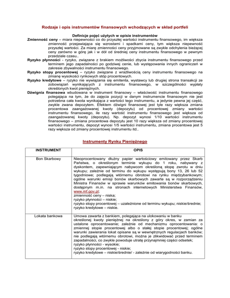 Rodzaje i opis instrumentów finansowych wchodzących w skład portfeli Definicje pojęć użytych w opisie instrumentów Zmienność ceny – miara niepewności co do przyszłej wartości instrumentu finansowego, im większa zmienność przejawiająca się wzrostami i spadkami ceny, tym większa niepewność przyszłej wartości. Za miarę zmienności ceny przyjmowane są zwykle odchylenia bieżącej ceny zarówno w górę jak i w dół od średniej ceny instrumentu finansowego w pewnym przedziale czasu.. Ryzyko płynności - ryzyko, związane z brakiem możliwości zbycia instrumentu finansowego przed terminem jego zapadalności po godziwej cenie, lub występowania innych ograniczeń w zakresie zbywalności instrumentu finansowego. Ryzyko stopy procentowej – ryzyko związane z wrażliwością ceny instrumentu finansowego na zmianę wysokości rynkowych stóp procentowych. Ryzyko kredytowe – ryzyko nie wywiązania się emitenta, wystawcy lub drugiej strona transakcji ze zobowiązań wynikających z instrumentu finansowego, w szczególności wypłaty określonych kwot pieniężnych. Dźwignia finansowa wbudowana w instrument finansowy – właściwość instrumentu finansowego polegająca na tym, że do zajęcia pozycji w danym instrumencie finansowym nie jest potrzebna cała kwota wynikająca z wartości tego instrumentu, a jedynie pewna jej część, zwykle zwana depozytem. Efektem dźwigni finansowej jest tyle razy większa zmiana procentowa zaangażowanej kwoty (depozytu) od procentowej zmiany wartości instrumentu finansowego, ile razy wartość instrumentu finansowego jest większa od zaangażowanej kwoty (depozytu). Np. depozyt wynosi 1/10 wartości instrumentu finansowego – zmiana procentowa depozytu jest 10 razy większa od zmiany procentowej wartości instrumentu, depozyt wynosi 1/5 wartości instrumentu, zmiana procentowa jest 5 razy większa od zmiany procentowej instrumentu itd.. Instrumenty Rynku Pieniężnego INSTRUMENT OPIS Bon Skarbowy Nieoprocentowany dłużny papier wartościowy emitowany przez Skarb Państwa, o określonym terminie wykupu do 1 roku, nabywany z dyskontem, zapewniającym nabywcom określoną stopę zwrotu w dniu wykupu; zależnie od terminu do wykupu występują bony 13, 26 lub 52 tygodniowe; podlegają wtórnemu obrotowi na rynku międzybankowym; ogólne warunki emisji bonów skarbowych zawarte są w rozporządzeniu Ministra Finansów w sprawie warunków emitowania bonów skarbowych, dostępnym m.in. na stronach internetowych Ministerstwa Finansów, www.mf.gov.pl; zmienność ceny – niska; ryzyko płynności – niskie; ryzyko stopy procentowej – uzależnione od terminu wykupu; niskie/średnie; ryzyko kredytowe – niskie. Lokata bankowa Umowa zawarta z bankiem, polegająca na ulokowaniu w banku określonej kwoty pieniężnej na określony z góry okres, w zamian za ustalone oprocentowanie; zależnie od mechanizmu oprocentowania: o zmiennej stopie procentowej albo o stałej stopie procentowej; ogólne warunki zawierania lokat opisane są w wewnętrznych regulacjach banków; nie podlegają wtórnemu obrotowi, można je zlikwidować przed terminem zapadalności, co zwykle powoduje utratę przynajmniej części odsetek; ryzyko płynności - wysokie; ryzyko stopy procentowej - niskie; ryzyko kredytowe – niskie/średnie/ - zależnie od wiarygodności banku. Instrumenty Dłużne INSTRUMENT OPIS Obligacja skarbowa Papier wartościowy emitowany przez Skarb Państwa, o określonym terminie wykupu, o stałym lub zmiennym oprocentowaniu; szczegółowy opis obligacji skarbowych można między innymi znaleźć na stronie internetowej GPW: www.gpw.pl; dokumentem emisyjnym jest list emisyjny Ministra Finansów, www.mf.gov.pl; obligacje skarbowe mogą podlegać wtórnemu obrotowi na rynku międzybankowym oraz na rynku regulowanym; zmienność ceny - niska / średnia – zależnie od terminu do wykupu oraz mechanizmu oprocentowania; ryzyko płynności - niskie / średnie – zależnie od rynku obrotu oraz od kształtowania się popytu i podaży na poszczególne emisje obligacji; ryzyko stopy procentowej - niskie / średnie / wysokie - zależnie od terminu do wykupu oraz mechanizmu oprocentowania; ryzyko kredytowe – niskie. Obligacje przedsiębiorstw – papiery komercyjne Papiery wartościowe zabezpieczone, nie zabezpieczone lub zabezpieczone częściowo emitowane przez przedsiębiorstwa, o określonym terminie wykupu o stałym lub zmiennym oprocentowaniu; mogą być gwarantowane; dokumentem emisyjnym jest memorandum informacyjne udostępniane przez organizatora emisji lub przez emitenta; mogą podlegać wtórnemu obrotowi na rynku międzybankowym lub też na rynku regulowanym, jeśli są dopuszczone do obrotu regulowanego; zmienność ceny - niska / średnia / wysoka – zależnie od terminu do wykupu, mechanizmu oprocentowania oraz zmian zdolności kredytowej emitenta; ryzyko płynności - średnie / wysokie – zależnie od rynku obrotu oraz od kształtowania się popytu i podaży na poszczególne emisje papierów komercyjnych; ryzyko stopy procentowej - niskie / średnie – zależnie od terminu do wykupu oraz mechanizmu oprocentowania; ryzyko kredytowe - niskie / średnie / wysokie – zależnie od zdolności kredytowej emitenta oraz gwaranta. List zastawny Papier wartościowy emitowany przez banki hipoteczne, o określonym terminie wykupu, o stałym lub zmiennym oprocentowaniu, którego podstawę emisji (zabezpieczenie) stanowią dla: - hipotecznych listów zastawnych – wierzytelności banku hipotecznego zabezpieczone hipotekami, - publicznych listów zastawnych – wierzytelności z tytułu kredytów w części zabezpieczonej wraz z odsetkami gwarancją lub poręczeniem udzielonym przez m.in. NBP, EBC, rządy lub banki centralne krajów członkowskich Unii Europejskiej oraz jednostki samorządu terytorialnego a także wierzytelności z tytułu kredytów udzielonych w/w podmiotom; posiadacze listów zastawnych mają pierwszeństwo w zaspokajaniu s