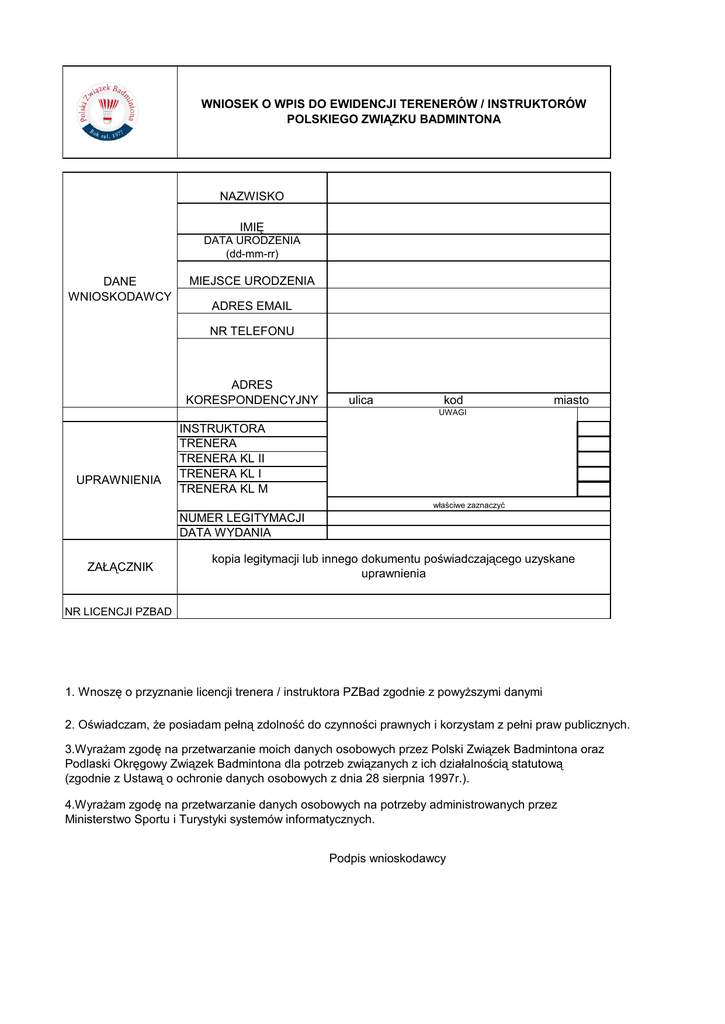 WNIOSEK O WPIS DO EWIDENCJI TERENERÓW / INSTRUKTORÓW POLSKIEGO ZWIĄZKU BADMINTONA NAZWISKO IMIĘ DATA URODZENIA (dd-mm-rr) DANE WNIOSKODAWCY MIEJSCE URODZENIA ADRES EMAIL NR TELEFONU ADRES KORESPONDENCYJNY ulica kod miasto UWAGI UPRAWNIENIA INSTRUKTORA TRENERA TRENERA KL II TRENERA KL I TRENERA KL M właściwe zaznaczyć NUMER LEGITYMACJI DATA WYDANIA ZAŁĄCZNIK kopia legitymacji lub innego dokumentu poświadczającego uzyskane uprawnienia NR LICENCJI PZBAD 1. Wnoszę o przyznanie licencji trenera / instruktora PZBad zgodnie z powyższymi danymi 2. Oświadczam, że posiadam pełną zdolność do czynności prawnych i korzystam z pełni praw publicznych. 3.Wyrażam zgodę na przetwarzanie moich danych osobowych przez Polski Związek Badmintona oraz Podlaski Okręgowy Związek Badmintona dla potrzeb związanych z ich działalnością statutową (zgodnie z Ustawą o ochronie danych osobowych z dnia 28 sierpnia 1997r.). 4.Wyrażam zgodę na przetwarzanie danych osobowych na potrzeby administrowanych przez Ministerstwo Sportu i Turystyki systemów informatycznych. Podpis wnioskodawcy
