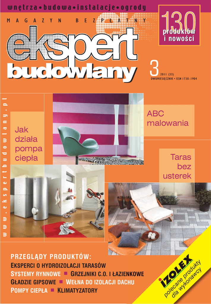 wnętrza•budowa•instalacje•ogrody M A G A Z Y N B E Z P Ł A T N Y produktów i nowoÊci budowlany 3 Jak działa pompa ciepła PRZEGLÑDY PRODUKTÓW: EKSPERCI O HYDROIZOLACJI TARASÓW SYSTEMY RYNNOWE n GRZEJNIKI C.O. I ŁAZIENKOWE GŁADZIE GIPSOWE n WEŁNA DO IZOLACJI DACHU POMPY CIEPŁA n KLIMATYZATORY ABC malowania Taras bez usterek po dl lec a an w e yk p on ro aw du cy kty w w w . e k s p e r t b u d o w l a n y . p l 2011 (33) DWUMIESI¢CZNIK • ISSN 1730 -1904 FLIR T640 ATR AKC YJN A CEN A Najnowocześniejsza kamera termowizyjna łącząca super parametry serii FLIR P600 z fantastyczną ergonomią kamer serii FLIR T. Uchylny układ optyczny, ciekłokrystaliczny monitor dotykowy 4,3” pozwalający na zmianę wymiarów i położenia funkcji analitycznych jednym palcem, super czułość <50mK, detektor 640x480, wymienna optyka, kamera dzienna 5 Mega pikseli, komentarz tekstowy, głosowy, i wiele wiele innych standardowych cech kamer firmy FLIR. Na uwagę zasługuje fakt, że kamera oferuje podobnie jak seria FLIR E bezprzewodową (Wi-Fi) komunikację z technologią Apple (iPhone, iPad, iPod) oraz bezprzewodową komunikację (Bluetooth) MeterLink z urządzeniami Extech (miernik cęgowy lub miernik parametrów środowiskowych). * po zarejestrowaniu zakupionego produktu na stronie: http://support.flir.com Przedstawicielstwo Handlowe Paweł Rutkowski tel.: +48(22) 849 71 90 e-mail: [email protected] www.kameryir.com.pl W NUMERZE | NOWOŚCI 6 | WNĘTRZA ABC malowania ścian . . . . . . . . . . . . . . . . . . . . . . . . . . . . . . . . . . . . . 8 Gładkie ściany w siedmiu krokach . . . . . . . . . . . . . . . . . . . . . . . . . . . 12 Przegląd gładzi gipsowych . . . . . . . . . . . . . . . . . . . . . . . . . . . . . . . . . 14 Bezpyłowa gładź gipsowa . . . . . . . . . . . . . . . . . . . . . . . . . . . . . . . . . . 16 ABC malowania ścian Jak układać mozaikę . . . . . . . . . . . . . . . . . . . . . . . . . . . . . . . . . . . . . . 18 | BUDOWA Z widokiem na energooszczędność . . . . . . . . . . . . . . . . . . . . . . . . . 20 Wyłazy dachowe i okna wyłazowe . . . . . . . . . . . . . . . . . . . . . . . . . . 22 Wybieramy orynnowanie . . . . . . . . . . . . . . . . . . . . . . . . . . . . . . . . . . 24 Przegląd systemów rynnowych . . . . . . . . . . . . . . . . . . . . . . . . . . . . 25 Bez pianki ani rusz . . . . . . . . . . . . . . . . . . . . . . . . . . . . . . . . . . . . . . 28 Z widokiem na energooszczędność Co decyduje o jakości materiałów ociepleniowych . . . . . . . . . . . . . . 30 Nowe kamery termowizyjne . . . . . . . . . . . . . . . . . . . . . . . . . . . . . . . 34 Jak ocieplić poddasze . . . . . . . . . . . . . . . . . . . . . . . . . . . . . . . . . . . . 36 Przegląd wełny mineralnej do izolacji dachu . . . . . . . . . . . . . . . . . . . 38 Eksperci o bramach garażowych . . . . . . . . . . . . . . . . . . . . . . . . . . . 42 Kompleksowe hydroizolacje . . . . . . . . . . . . . . . . . . . . . . . . . . . . . . . 45 Taras bez usterek . . . . . . . . . . . . . . . . . . . . . . . . . . . . . . . . . . . . . . . 46 Eksperci o hydroizolacji tarasów . . . . . . . . . . . . . . . . . . . . . . . . . . . . 50 Jak ocieplić poddasze | INSTALACJE Zasady działania i typy pomp ciepła . . . . . . . . . . . . . . . . . . . . . . . . . 56 Przegląd pomp ciepła . . . . . . . . . . . . . . . . . . . . . . . . . . . . . . . . . . . . 58 Jak dobierać klimatyzatory . . . . . . . . . . . . . . . . . . . . . . . . . . . . . . . . 64 Przegląd klimatyzatorów . . . . . . . . . . . . . . . . . . . . . . . . . . . . . . . . . 66 Grzejniki do łazienki . . . . . . . . . . . . . . . . . . . . . . . . . . . . . . . . . . . . . 68 Przegląd grzejników c.o. i łazienkowych . . . . . . . . . . . . . . . . . . . . . . 70 Zasady działania i typy pomp ciepła Grzejnik do salonu . . . . . . . . . . . . . . . . . . . . . . . . . . . . . . . . . . . . . . 73 Półka z narzędziami . . . . . . . . . . . . . . . . . . . . . . . . . . . . . . . . . . . . . . 74 Gniazda i łączniki w instalacjach elektrycznych . . . . . . . . . . . . . . . . . 76 | OGRODY Ogrodzenie w dobrym stylu . . . . . . . . . . . . . . . . . . . . . . . . . . . . . . . 78 Hortensja ogrodowa . . . . . . . . . . . . . . . . . . . . . . . . . . . . . . . . . . . . . 80 * * * Hortensja ogrodowa Warto wiedzieć, Indeks firm . . . . . . . . . . . . . . . . . . . . . . . . . . . . . . . 82 4 www.eksper tbudowlany.pl nr 3/2011 NOWOŚCI soka sprawność, ale i oszczędność energii sięgająca do 78%. Urządzenie zapewnia znaczącą redukcję kosztów montażu i eksploatacji. W nowych budynkach nie ma potrzeby wykonywania odwiertów ani wykopów, instalacji przyłączy gazowych, kominów lub zbiorników paliwowych. Z kolei w trakcie modernizacji lub przebudo- MALOWANIE BEZ POPRAWEK wy domu, łatwo jest podłączyć system Aquarea do istniejącego układu ogrzewania grzejnikowego lub podłogowego. Nowością w ofercie firmy XL-Tape International jest samoprzylepna taśma malarska z blokerem Klin-Line. Taśma Klin-Line została tak opracowana, że jej krawędzie mają specjalny inhibitor, który w momencie zetknięcia się z farbą powo- OGRÓD BARW WE WNĘTRZU Jedynka® Ogród Barw – nowość w ofercie marki Jedynka® – to farba lateksowa przeznaczona do malowania ścian i sufitów wewnątrz pomieszczeń. Cechą szczególną produktu jest System Potrójnej Aktywności Powłoki, który gwarantuje bardzo dobre krycie i trwałość kolorów (pomalowane powierzchnie nie żółkną i nie odbarwiają się z upływem czasu), a także mikrowentylację warstw, co umożliwia oddychanie ścian. Farba ma ekologiczną i nowoczesną recepturę, dzięki której powłoki są odporne na szorowanie na mokro. Ponadto produkt charakteryzuje się wysoką wydajnością, szybko schnie, a gęsta konsystencja farby jest gwarancją malowania bez duje powstawanie mikrobariery. To sprawia, że podczas malowania farba nie