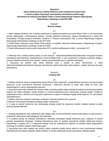 Regulamin naboru deklaracji wraz z ankietą składanych przez mieszkańców miasta Chełm w ramach projektu dotyczącym wykorzystania odnawialnych źródeł energii planowanym do realizacji przez Miasto Chełm w ramach Regionalnego Programu Operacyjnego Województwa Lubelskiego na lata 2014-2020 Rozdział 1 Warunki wstępne §1 1. Nabór wstępnej deklaracji wraz z ankietą uczestnictwa w projekcie prowadzony jest przez Miasto Chełm w celu opracowania wniosku aplikacyjnego o dofinansowanie dostawy i montażu kolektorów słonecznych, instalacji fotowoltaicznych w ramach Osi Priorytetowej 4 Energia przyjazna środowisku, Działanie 4.1 Wsparcie wykorzystania OZE, w ramach Regionalnego Programu Operacyjnego Województwa Lubelskiego na lata 2014-2020. 2. Projekt będzie realizowany przez Miasto Chełm jedynie w przypadku otrzymania dofinansowania z Regionalnego Programu Operacyjnego Województwa Lubelskiego na lata 2014-2020. 3. Poziom dofinansowania może wynieść maksymalnie 85 % kosztów kwalifikowanych (netto) – bez podatku VAT. §2 1. Deklaracja wraz z ankietą zbierana będzie od osób chętnych – właścicieli/współwłaścicieli/użytkowników wieczystych budynku mieszkalnych jednorodzinnych, zlokalizowanych na terenie Miasta Chełm, w celu uczestnictwa w projekcie w zakresie: dostawy i montażu kolektorów słonecznych lub dostawy i montażu paneli fotowoltaicznych w systemie zamkniętym. 2. Dopuszcza się złożenie tylko jednej deklaracji wraz z ankietą na jedną nieruchomość, w której właściciel/współwłaściciel/użytkownik wieczysty nieruchomości wybiera tylko jeden rodzaj instalacji – kolektor słoneczny lub panel fotowoltaiczny. Rozdział 2 Instalacje OZE §3 1. Kolektory słoneczne służą do podgrzewania zimnej wody do celów użytkowych w gospodarstwie domowym za pomocą energii słonecznej. Liczba montowanych kolektorów słonecznych i pojemność zbiornika na ciepłą wodę zależy od liczby osób zamieszkujących w danym gospodarstwie domowym. 2. Szacunkowy koszt netto instalacji oraz wartość udziału uczestnika projektu będzie zależała od wielkości zamontowanej instalacji solarnej oraz miejsca lokalizacji i będzie określony w umowie podpisywanej przed rozpoczęciem realizacji projektu. Grzałka do podgrzewania wody w zbiorniku oraz druga górna wężownica do wpięcia w instalację drugiego źródła ciepła np: CO jest kosztem niekwalifikowanym. 3. Kolektory słoneczne mogą być montowane na dachach i elewacji budynków oraz na gruncie. 4. Budynek musi posiadać wewnętrzną instalację ciepłej i zimniej wody. 5. Z uwagi na warunki techniczne oraz obowiązujące przepisy projekt nie dopuszcza montażu instalacji solarnej na połaci dachowej pokrytej eternitem. §4 1. Instalacja fotowoltaiczna służy wytwarzaniu prądu stałego, który za pomocą falownika zostaje przekształcony na prąd zmienny o parametrach elektrycznych odpowiadających sieci publicznej. 2. W projekcie planuje się instalacje fotowoltaiczne zamknięte produkujące energię elektryczną tylko i wyłącznie na własne potrzeby gospodarstwa domowego. Instalacja fotowoltaiczna służy do zasilania wewnętrznej instalacji elektrycznej budynku mieszkalnego o napięciu 230 V a wytworzona energia może być przeznaczona wyłącznie na potrzeby własne gospodarstwa domowego do zasilania urządzeń codziennego użytku 3. Szacunkowy koszt netto instalacji oraz wartość udziału uczestnika projektu będzie zależał od mocy zamontowanej instalacji fotowoltaicznej oraz miejsca lokalizacji i będzie określony w umowie podpisywanej przed rozpoczęciem realizacji projektu. 1z5 4. Podstawą do obliczenia zapotrzebowania na produkcję energii z instalacji fotowoltaicznej będą kopie rachunków za energię elektryczną za 2015 rok. 5. Panele fotowoltaiczne mogą być montowane na dachu lub gruncie. 6. Instalacje fotowoltaiczne będą montowane na tych budynkach mieszkalnych, w których roczne zużycie energii elektrycznej wynosi przynajmniej około 2000 kWh, wtedy moc instalacji fotowoltaicznej wynosi 2 kW i jest to najmniejsza instalacja, która będzie montowana w ramach projektu. 7. Moc instalacji fotowoltaicznej dobieramy do mocy zużywanej w budynku mieszkalnym, moc zainstalowanej instalacji fotowoltaicznej nie może przekroczyć mocy przyłączeniowej wynikającej z umowy na dostawę energii elektrycznej oraz wartości 5 kW. Instalacja fotowoltaiczna musi być tak dobrana, aby całkowita wartość energii elektrycznej wyprodukowanej przez tę instalację nie mogła przekroczyć całkowitej wartości energii elektrycznej zakupionej z sieci energetycznej przez użytkownika w ostatnim rocznym okresie rozliczeniowym. Podanie zawyżonych wartości zużytej energii będzie skutkowało zwrotem dotacji. Rozdział 3 Warunki udziału w projekcie §5 1. Właściciel/współwłaściciel/użytkownik wieczysty budynku zobowiązuje się do podpisania umowy nieodpłatnego użyczenia nieruchomości, w celu montażu instalacji, na czas realizacji projektu i na okres trwałości projektu tj. 5 lat po dacie jego zakończenia określonej w umowie o dofinansowanie projektu. 2. Wykonane instalacje przez okresu trwałości projektu (5 lat od zakończenia projektu) stanowić będą własność Miasta Chełm i przez ten czas zostaną użyczone do bezpłatnego użytkowania właścicielom/współwłaścicielom/użytkownikom wieczystym budynku. 3. Po upływie okresu trwałości projektu, właścicielem instalacji zostanie właściciel/współwłaściciel/użytkownik wieczysty nieruchomości. 4. Właściciel/współwłaściciel/użytkownik wieczysty budynku zobowiązuje się do wykonania wszystkich prac dostosowujących pomieszczenia budynku do montażu elementów instalacji OZE na własny koszt. §6 1. W sytuacji zmiany przez Instytucję Wdrażającą Regionalny Program Operacyjny Województwa Lubelskiego zasad naboru projektów, dopuszcza się możliwość wprowadzenie zmian w Regulaminie, dotyczących m.