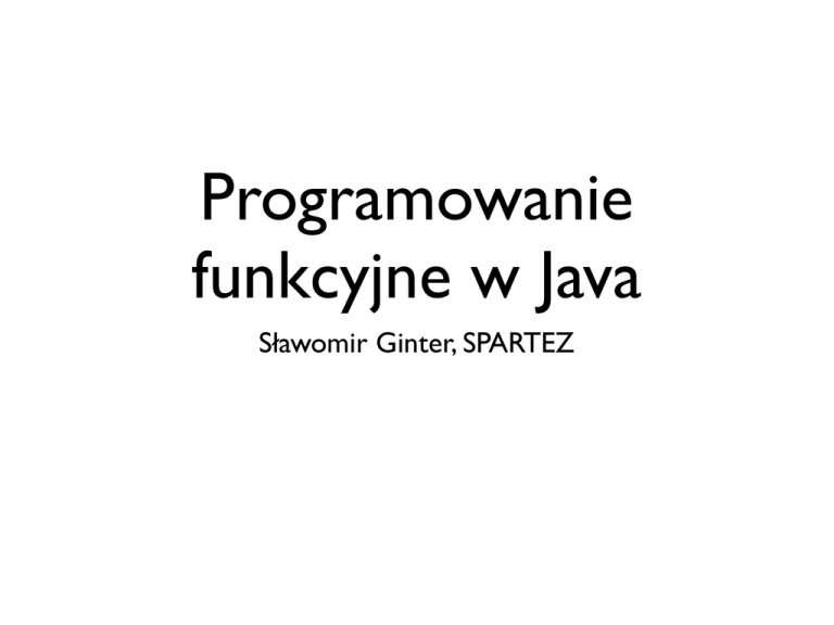 Programowanie funkcyjne w Java Sławomir Ginter, SPARTEZ O mnie... • Inżynier, nie naukowiec-teoretyk • Zawodowiec czas = pieniądz -1 • Obecnie: core i pluginy dla Atlassian JIRA web based Issue Tracker • Hobby: jak przepisać klasę w Java na 1 linijkę w Scali :-) Programowanie Obiektowe • Obiekt Pola (stan) Metody (logika) • • • Przekazywanie komunikatów - side effects Enkapsulacja GoF Strategy,Visitor, Command, Iterator, Template... Programowanie Funkcyjne • Wartości • Funkcje pure: no side effects = referential transparency funkcje wyższego poziomu częściowa aplikacja • Rekurencja zamiast pętli • Udajemy że nie ma stanu Jaki kod chcemy? • Kod ma być poprawny włącznie z wydajnością w skali makro • Ma sie go dać czytać i utrzymywać! • Ma się łatwo pisać reużycie testowanie Co możemy poświęcić? • Wyniki microbenchmarków • Czas na naukę języka / paradygmatu • Parę megabajtów RAMu i dysku Co nas wiąże? • Kompatybilność z istniejącym kodem API servera biblioteki - Jersey, Soy, ORM • Koledzy :-) • Terminy czas do pierwszej linijki produkcyjnego kodu big-bang nie przejdzie Biblioteki funkcyjne • Guava • Fugue (Either, Option, fold) • Functional Java? • Scala! Czemu weszliśmy w Scalę • Guava i Fugue lokalnymi standardami • Statyczne typowanie, compile-time checks • Nic na siłę - dobre wsparcie dla “normalnej” Javy • Trendy :-) Czego się baliśmy? • Problemów z OSGi i Springiem nie zarejestrowano • Problemów z Reflection-based APIs Soy, ORM, Jersey - do obejścia • Brak wsparcia narzędzi Maven współpracuje (lifecycle) Idea trochę gorzej (debugger, refactoring) Czego się baliśmy ? c.d. • Problemów wydajnościowych na razie OK • Problemów z wdrażaniem kolegów spora część nowego kodu jest w Javie • Obsunięcia terminów z powodu użycia Scali Nie golić jaków! Wnioski? • Miesiąc na wyrównanie wydajności • Zużycie GC w normie • Łatwiej przeoczyć złożoność (profiler!) • Mniej Unit Testów, drastycznie mniej Mockito • Business as Usual - większość problemów niezależna od języka i paradygmatu. • No more Java :-) Jak to zrobić w Javie • Wartości public final String nazwa; konstruktor kopiujący builder pattern • Może projekt Lombok? • A może po prostu case class ;-) Jak to zrobić w Javie Funkcje Jak to zrobić w Javie Funkcje - zwijamy boilerplate Jak to zrobić w Javie Funkcje - częściowa aplikacja (closure!) Jak to zrobić w Javie Funkcje - jak użyć? Jak to zrobić w Javie A może nie w Javie? Przydatne funktory • Iterables.transform(collection, function) • Iterables.filter(collection, predicate) • Maps.transformValues(map, function) • Iterables.reverse(list) • fugue.Functions.fold(func, zero, collection) • fugue.Options.flatten(collection) Kodujemy Pytania? Sławek Ginter, SPARTEZ