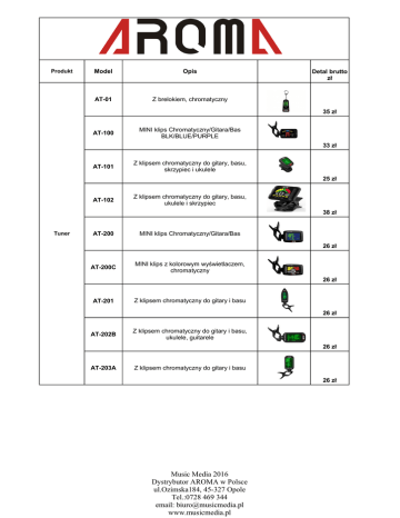 Produkt Model Opis AT-01 Z brelokiem, chromatyczny Detal brutto zł 35 zł AT-100 MINI klips Chromatyczny/Gitara/Bas BLK/BLUE/PURPLE 33 zł AT-101 Z klipsem chromatyczny do gitary, basu, skrzypiec i ukulele 25 zł AT-102 Z klipsem chromatyczny do gitary, basu, ukulele i skrzypiec 38 zł Tuner AT-200 MINI klips Chromatyczny/Gitara/Bas 26 zł AT-200C MINI klips z kolorowym wyświetlaczem, chromatyczny 26 zł AT-201 Z klipsem chromatyczny do gitary i basu 26 zł AT-202B Z klipsem chromatyczny do gitary i basu, ukulele, guitarele 26 zł AT-203A Z klipsem chromatyczny do gitary i basu 26 zł Music Media 2016 Dystrybutor AROMA w Polsce ul.Ozimska184, 45-327 Opole Tel.:0728 469 344 email: [email protected] www.musicmedia.pl AT-203B Z klipsem chromatyczny do gitary i basu 33 zł AT-300B Z klipsem chromatyczny do gitary i basu 34 zł AT-301 Z klipsem chromatyczny do gitary i basu 49 zł AT-320B Z klipsem chromatyczny do gitary i basu, ukulele 34 zł AT-350 Z klipsem uniwersalny do instrumentów smyczkowych i dętych 45 zł Tuner AT-355 Z klipsem chromatyczny do gitary i basu, skrzypce, altówka 34 zł AT-600 Z klipsem chromatyczny do gitary, basu, ukulele i instr. dętych 59 zł AT-601A Z klipsem chromatyczny do gitary i basu, skrzypce, ukulele 38 zł AT-601B Z klipsem chromatyczny do gitary i basu, skrzypce, ukulele 45 zł AT-3000A Z klipsem chromatyczny do basu, ukulele i skrzypiec 30 zł AT-3000B Z klipsem chromatyczny do gitary, basu, ukulele i skrzypiec 33 zł Music Media 2016 Dystrybutor AROMA w Polsce ul.Ozimska184, 45-327 Opole Tel.:0728 469 344 email: [email protected] www.musicmedia.pl AM-703 Stojący kwadratowy 79 zł AM-705 Duży stojący metronom 95 zł Metronom AM-706 Metronom mechaniczny, duży 139 zł AM-707 Metronom mechaniczny, duży 129 zł AMT-100 AMT-500 Metronom i tuner z klipsem, chromatyczny do gitary, basu, skrzypiec i ukulele z akumulatorem do ładowania 75 zł Metronom, tuner i generator dźwięku 3 w 1, chromatyczny 49 zł AMT-510 Metronom i tuner z klipsem, chromatyczny do gitary, basu, skrzypiec i ukulele 34 zł AMT-530 Metronom i tuner z klipsem, chromatyczny do gitary, basu, ukulele i skrzypiec 55 zł Metro/tuner AMT-550B AMT-560 AMT-580 Metronom, tuner i generator dźwięku 3 w 1, chromatyczny, do gitary, basu, ukulele i skrzypiec Metronom, tuner, generator dźwięku. Chromatyczny do gitary, basu, ukulele i smyczkowych 79 zł 49 zł Metronom, tuner i generator dźwięku 3 w 1, chromatyczny 85 zł AMT-703H Metronom, tuner, mierzy wilgotność i temperaturę 99 zł Music Media 2016 Dystrybutor AROMA w Polsce ul.Ozimska184, 45-327 Opole Tel.:0728 469 344 email: [email protected] www.musicmedia.pl AC-01 Kapodaster do akustyka, mix kolorów 39 zł AC-01N Kapodaster do akustyka i elektryka 45 zł AC-02 Kapodaster do klasyka, srebrny 45 zł AC-03 Kapodaster do ukulele, srebrny 39 zł AC-05 Kapodaster z wbudowanym tunerem 89 zł AC-11 Kapodaster do akustyka, ukulele antique brass 44 zł Kapodaster AC-11 Kapodaster do akustyka, ukulele matte/glossy silver 38 zł AC-20 Kapodaster do akustyka i elektyka 25 zł AC-20C Kapodaster do klasyka 26 zł AC-20U Kapodaster do ukulele 24 zł AC-21 Kapodaster do akustyka antique brass 40 zł AC-21 Kapodaster do akustyka matte/glossy silver 34 zł Music Media 2016 Dystrybutor AROMA w Polsce ul.Ozimska184, 45-327 Opole Tel.:0728 469 344 email: [email protected] www.musicmedia.pl AH-81 Hak gitarowy 25 zł AGS-01 Statyw gitarowy, składany 47 zł AGS-02 Statyw gitarowy, basowy,składany z pokrowcem 49 zł AUS-02 Statyw do ukulele, skrzypiec, mandoliny, składany 45 zł Statywy AH-85 Hak gitarowy z automatyczną blokadą 49 zł AGS-08 Metalowy statyw do akustyka, elektryka,basu, mandoliny, składany, regulowany 75 zł AGS-03 Statyw gitarowy, basowy,składany z pokrowcem 38 zł AL-1 Lampka LED 119 zł ACR-3A Jack łączący efekty 39 zł ADC-M5 Rozdzielacz zasilania na 5 efektów 30 zł Akcesoria ADC-M8 Rozdzielacz zasilania na 8 efektów 44 zł AHF-03 Przyrząd do ćwiczenia – Hand exerciser grip 39 zł AHF-05 Przyrząd do ćwiczenia – Hand exerciser grip 45 zł Music Media 2016 Dystrybutor AROMA w Polsce ul.Ozimska184, 45-327 Opole Tel.:0728 469 344 email: [email protected] www.musicmedia.pl AG-03M Mini wzmacniacz gitarowy z playerem MP3/AUX/mic./nagrywanie 159 zł AG-10 10W wzmacniacz do gitary elektrycznej 215 zł AG-10A 10W wzmacniacz do gitary akustycznej 269 zł Wzmacniacze AG-10AM 10W wzmacniacz do gitary 425 zł TM-20A 20W wzmacniacz do gitary akustycznej 839 zł TM-30A 30W wzmacniacz do gitary akustycznej 949 zł Music Media 2016 Dystrybutor AROMA w Polsce ul.Ozimska184, 45-327 Opole Tel.:0728 469 344 email: [email protected] www.musicmedia.pl