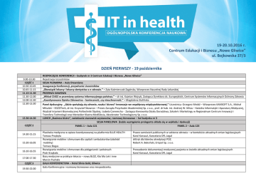 19-20.10.2016 r. Centrum Edukacji i Biznesu „Nowe Gliwice” ul. Bojkowska 37/3 DZIEŃ PIERWSZY - 19 października 9.00-10.30 CZĘŚĆ 1 10.30-10.45 10.45-11:15 11.15-11.30 11.30-12.00 12.00-12.30 12.30-13.30 13.30-14.30 CZĘŚĆ 2 14.30-15.15 15.20-16.05 16.10-16.55 17.00-17.30 CZĘŚĆ 3 19.30-22.00 ROZPOCZĘCIE KONFERENCJI – budynek nr 3 Centrum Edukacji i Biznesu „Nowe Gliwice” Rejestracja Uczestników SESJA PLENARNA – Aula Drewniana Inauguracja Konferencji, przywitanie Uczestników „Obowiązki lekarzy i lekarzy dentystów a e-zdrowie.” – Zyta Kaźmierczak-Zagórska, Wiceprezes Naczelnej Rady Lekarskiej PRZERWA KAWOWA „Wkład CSIOZ w przemianę systemu informacyjnego państwa.” – dr inż. Kajetan Wojsyk, Zastępca Dyrektora ds. Europejskich, Centrum Systemów Informacyjnych Ochrony Zdrowia „Koordynowana Opieka Zdrowotna – konieczność, czy nieuchronność.” – Magdalena Stafińska Panel dyskusyjny: „Gdzie spotykają się zdrowie, nauka i biznes? Innowacje we współpracy międzysektorowej.” Uczestnicy: Grzegorz Mródź – Wiceprezes KAMSOFT S.A., Michał Mikulski – EGZOTech, dr inż. Krzysztof Skowron – Prezes Zarządu Przychodni Akademickiej Sp. z o.o., prof. dr hab. inż. Andrzej W. Mitas – Katedra Informatyki i Aparatury Medycznej, Wydział Inżynierii Biomedycznej Politechniki Śląskiej, Izabela Czeremcha - Zastępca Kierownika Działu Doradztwa, Szkoleń i Marketingu w Regionalnym Centrum Innowacji i Transferu Technologii oraz Menedżer Klastra MedSilesia, Akcelerator Technologiczny Sp. z o.o. LUNCH „Business bistro”, zwiedzanie stanowisk wystawców, rozmowy biznesowe – hol budynku nr 3 SESJA PANELOWA (każde wystąpienie prelegenta składa się w wykładu i dyskusji) PANEL 1 – Aula 121 PANEL 2 – Aula 123 Placówka medyczna w opiece koordynowanej na platformie BLUE HEALTH Tomasz Przybyła Rozwiązanie mobilne i chmurowe dla szpitali i ambulatoriów (obchód mobilny) Tomasz Bogus Rozwiązania mobilne i chmurowe dla pielęgniarek i położnych Piotr Krząkała Bazy medyczne w praktyce lekarza – nowy BLOZ, Kto Ma Lek i inne Marcin Puchała GALA KONFERENCYJNA – Hotel Silvia Gold, Gliwice Gala Konferencyjna i rozmowy biznesowe oraz niespodzianka. Prawo zamówień publicznych w sektorze zdrowia – w kontekście aktualnych zmian legislacyjnych Karol Korszuń, Kancelaria DFL Legal drEryk dla liderów akredytacji POZ. Robert A. Beksiński, Ericpol Sp. z o.o. Prowadzenie dokumentacji medycznej pacjenta w świetle aktualnych zmian legislacyjnych Karol Korszuń, Kancelaria DFL Legal DZIEŃ DRUGI - 20 października CZĘŚĆ 1 09.00-09.30 09.30-10.00 10.00-10.30 10.30-11.00 11.00-11.30 11.30-12.00 12.00-13.00 CZĘŚĆ 2 SESJA PLENARNA – Aula Drewniana, budynek nr 3 Centrum Edukacji i Biznesu „Nowe Gliwice” „MedSilesia – Śląska Sieć Wyrobów Medycznych - branżowa współpraca sieciowa – szansą na rozwój przedsiębiorstwa.” – Alicja Michalik, Sylwia Pietrzyk, GAPR sp. z o.o. Koordynator klastra: MedSilesia Śląska Sieć Wyrobów Medycznych Znaczenie dużych baz danych w codziennej praktyce klinicznej - punkt widzenia informatyka – Mgr Daniel Cieśla punkt widzenia lekarza – Dr med. Michał Hawranek, Śląskie Centrum Chorób Serca „Breast Unit – rola IT we wsparciu podejmowania decyzji w onkologii i zapewnieniu jakości diagnostyki i leczenia.” – dr Marek Kentnowski, Centrum Onkologii – Instytut im. Marii Skłodowskiej-Curie Oddział w Gliwicach PRZERWA KAWOWA „Długotrwały telemonitoring w Projekcie NOMED-AF - NCBIR/Strategmed II” – Adam Konka, Prezes Kardio-Med Silesia Sp. z o.o, prof. dr hab. n. med. Beata Średniawa, Śląskie Centrum Chorób Serca „Dylematy zarządzania współczesnym podmiotem leczniczym – studium przypadku.” – dr inż. Krzysztof Skowron, Prezes Zarządu Przychodni Akademickiej Sp. z o.o. LUNCH „Business bistro”, zwiedzanie stanowisk wystawców, rozmowy biznesowe – hol budynku nr 3 SESJA PANELOWA PANEL 1 – Aula 121 PANEL 2 – Aula 123 13.00-13.30 Koordynowana Opieka Farmaceutyczna – moda, czy konieczność Magdalena Stafińska Jak automatyzować fizjoterapię i diagnostykę ruchową z wykorzystaniem robotów rehabilitacyjnych Michał Mikulski, EGZOTech 13.35-14.05 Zarządzanie polityką asortymentową w aptekach i sieciach aptek Tomasz Pawlik Wirtualna Rzeczywistość – technologia dla człowieka Piotr Łój, Fundacja Virtual Dream / LojKe 14.10-14.40 Interaktywne zamawianie leków w hurtowniach Tomasz Wojakowski 14.45-15.15 Elektroniczna faktura w aptekach i sieciach aptek Tomasz Pawlik 15.20-15.50 Serwisy farmaceutyczne dla aptek i pacjentów – Nowy BLOZ Marcin Puchała Plan Narodowa Służba Zdrowia - jak przygotować szpital do bezpiecznego wejścia do sieci Anna Banaszewska, Fundacja Centrum Inicjatyw Gospodarka i Zdrowie Trendy w oprogramowaniu do prowadzenia Elektronicznej Dokumentacji Medycznej Piotr Staniec Country Manager, Ericsson / Ericpol Sp. z o.o. i Roland Fojcik, GuardLogic S.C. Nowości w systemie KS-Apteka Łukasz Bek 09:00 – 14:00 Konsultacje indywidualne: Mobilny Punkt Informacyjny Funduszy Europejskich. Pozyskiwanie Funduszy Europejskich na działania jednostek ochrony zdrowia w perspektywie finansowej 2014 – 2020 Sala 117
