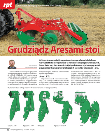 Talerzowe agregaty uprawowe Unii Group Grudziądz Aresami stoi Krzysztof Płocki Zdjęcia: firmowe, autor Obecnie linia talerzowych agregatów Ares reprezentowana jest przez typoszeregi: L, XL, P, HP i Roller Up. Montowane są w nich talerze o średnicach wynoszących od 500 do 660 mm (informuje o tym liczba podana przy nazwie). Mogą one mieć zabezpieczenie poprzez amortyzatory gumowe lub sprężynę. Ponadto dostępne są Od tego roku nasz największy producent maszyn rolniczych Unia Group wprowadził kilka istotnych zmian w ofercie swoich agregatów talerzowych. Znana do tej pory linia Mars nie jest już produkowana, a jej następcy zostali przypisani do flagowej grupy grudziądzkich agregatów z talerzami – Ares. wersje ze słupicą, na której zamontowane są talerze podwójne. Ares L i XL Najtańszy Ares L o szerokości roboczej 2,5 m kosztuje 13 900 zł netto (kwoty w artykule są cenami sugerowanymi przez producenta). Za takie pieniądze otrzy- mamy narzędzie zawieszane na TUZ-ie ciągnika z dwoma rzędami talerzy oddalonych od siebie o 64 cm. Podstawowe dyski robocze Classic L 500 są uzębione, a standardowym wałem jest wersja rurowa o średnicy 500 mm. Zapotrzebowanie mocy dla tego agregatu producent określił na 75-90 KM. Wybrane rodzaje talerzy możliwe do zamontowania na agregatach Ares. Classic L 500 60 Agressive L 500 Rolniczy Przegl¹d Techniczny marzec 2015 nr 3 (193) Vibro 560 Agressive TX 660 Twix Ares tylko na talerzach Warto wiedzieć, że do 2015 r. Ares L był sprzedawany pod nazwą TL, a Ares XL pod nazwą TXL. Oznaczenie literą T zniknęło, gdyż obecnie agregaty Ares obejmują tylko narzędzia talerzowe. Natomiast agregaty zębowe Unii Group oferowane wcześniej pod nazwą Ares L i XL nazywają się teraz Ceres L i XL. Do Aresa L można również zamontować talerze Agressive L 500. Mają one zdecydowanie większe wcięcia niż wersja Classic, co przekłada się na intensywniejszą pracę. Z bogatej listy wyposażenia opcjonalnego na uwagę zasługuje sprzęg do zawieszenia na nim siewnika oraz tylne koła montowane zamiast wału. W tym ostatnim przypadku otrzymamy agregat przyczepiany z dyszlem o długości 1800 mm. Unia Group określa takie narzędzia jako wersje drive. Koła wykorzystywane są w czasie pracy na polu do dogniatania gleby, a na drogach pełnią rolę transportową. Poza Aresem L o szerokości roboczej 2,5 m dostępne są jeszcze wersje: 3-, 3,5- i 4-metrowa. Jeżeli poszukujemy agregatu talerzowego z masywniejszą ramą i szerzej rozstawionymi rzędami talerzy, to możemy rozważyć zakup Aresa XL. Jego podstawowe talerze Classic XL mają średnicę 560 mm, a oddalone są od siebie w rzędach o 80 cm. Talerze Vibro 560 montowane na słupicy sprężynowej w czasie pracy wpadają w wibracje, co przekłada się na ich intensywną pracę. Można również zamówić talerze Agressive XL 560 lub Vibro 560. Te ostatnie montowane są na słupicy sprężynowej. Dzięki temu w czasie pracy wpadają w wibracje, co przekłada się na ich intensywną pracę. Tak jak w typoszeregu Ares L na bogatej liście wyposażenia dodatkowego znajduje się m.in. system drive. Ponadto dostępne są komplet przednich kół podporowych oraz hydrauliczna regulacja głębokości pracy. Standardowo przed wałem występuje rząd zgrzebeł sprężystych. Wersje o szerokości roboczej 3, 3,5 i 4 m mają ramę nieskładaną. Dostępne są również Aresy XL składane do transportu hydraulicznie. Są wśród nich agregaty 4-, 4,5i 6-metrowe. Najtańszy Ares XL z wałem rurowym o średnicy 500 mm kosztuje 23 000 zł netto. Ares P i HP Zupełnie inny rozmiar agregatów reprezentują Aresy typoszeregów P i HP. Rozstaw pomiędzy rzędami montowanych w nich talerzy wynosi aż 120 mm. To prawie dwukrotnie więcej niż w Aresach L. W agregatach Ares P mogą być montowane talerze ze słupicami zabezpieczonymi amortyzatorami gumowymi lub sprężyną. Z pierwszego sposobu ochrony przed nagłymi przeciążeniami korzystają talerze Classic XXL 660 i Agressive XXL 660. Natomiast solidne zabezpieczenie sprężynowe dostępne jest dla talerzy: Classic TX 660, Agressive TX 660 i Twix. Ostatnia nazwa oznacza zestaw podwójnych talerzy Agressive 660/610 zamontowanych na jednej słupicy. Taka budowa pozwala Rolniczy Przegl¹d Techniczny marzec 2015 nr 3 (193) 61 PREZENTACJE pracować tym agregatem na polach z dużą ilością resztek pożniwnych. Wszystkie agregaty typoszeregu Ares P to narzędzia półzawieszane z kołami umieszczonymi pomiędzy zespołem uprawowym składającym się z dwóch rzędów talerzy i wałem. W czasie transportu to na nich i tyle ciągnika opiera się agregat. Oczywiście pracując na polu, koła uniesione są do góry, aby nie ugniatać gleby. Dlaczego Aresy typoszeregu P są oferowane tylko jako wersje półzawieszane? Odpowiedź zawarta jest w ich masie. Najwęższy trzymetrowy z wałem rurowym o średnicy 600 mm ma tę wartość na poziomie prawie 3000 kg. Natomiast najcięższa jest oczywiście wersja z talerzami Twix – 3420 kg. Dostępne są również Aresy P o szerokościach roboczych: 3,5 i 4 m. Na Agregaty Ares mają montowane piasty bezobsługowe. Posiadają one labiryntowe uszczelnienie, które zapobiega wnikaniu do łożyska wody i brudu. Ta zmiana ma olbrzymie znaczenie nie tylko z powodu wygody użytkowania agregatu. Eliminuje również ryzyko wypchania przez smar uszczelnienia, co może przydarzyć się podczas smarowania łożysk w tradycyjnych piastach ze smarowniczkami. Nowe po prostu ich nie mają. liście wyposażenia dodatkowego znajduje się m.in. system drive, ale tylko dla wersji trzy- i czterometrowej. W typoszeregu Aresów P wyróżnia się hybryda o nazwie long. Agregat ten po- Ostatnim elementem roboczym agregatów Ares HP są ciężkie wały o średnicy 700 mm. między rzędami talerzy ma zamontowany rząd zębów ustawionych obok siebie w odstępie 70 cm. Głębokość ich pracy wynoszącą maksymalnie 30 cm można regulować ni