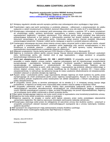 REGULAMIN CZARTERU JACHTÓW Regulamin wypożyczalni jachtów WIKING Andrzej Kowalski 11-500 Giżycko, Gajewo ul. Jałowcowa 7 www.e-wiking.com.pl [email protected] tel. 694-486-246 z dnia 01.05.2013r. § 1 Niniejszy regulamin określa warunki wynajmu jachtów oraz zobowiązania stron wynikające z tego tytułu. § 2 Przedmiotem najmu jest jacht wymieniony w protokole zdawczo - odbiorczym z przeznaczeniem do użytku wyłącznie w celach turystycznych na Wielkich Jeziorach Mazurskich przy sile wiatru do 6° w skali Beauforta . § 3 Wynajmujący zobowiązuje się przekazać jacht pierwszego dnia czarteru o godzinie 1500 w stanie przydatnym do umówionego użytku, sprawny technicznie, wyposażony w sprawny silnik przyczepny, z kompletnym wyposażeniem żeglarskim i sprzętem ratunkowym. Przy odbiorze jachtu należy posiadać dwa dokumenty potwierdzające tożsamość w tym jednym z dokumentów powinien być dowód osobisty lub paszport oraz dokument uprawniający do prowadzenia jachtu. Członkowie załogi powinni również posiadać dokumenty potwierdzające tożsamość. Wydanie i odbiór jachtu następuje w oparciu o protokół zdawczo-odbiorczy. § 4 Czarterujący zobowiązuje się przez okres trwania umowy najmu utrzymać jacht w takim samym stanie, używać go zgodnie z przeznaczeniem, dobrymi zasadami sztuki żeglarskiej oraz zwrócić wynajmującemu w dniu określonym w protokole zdawczo – odbiorczym do godziny 1000 jacht sprawny, czysty, sklarowany z wyposażeniem wyszczególnionym w protokóle zdawczo-odbiorczym. § 5 Miejscem przekazania i zwrotu jachtu jest port COS Giżycko w Giżycku przy ul. Moniuszki 22. § 6 Najemca w momencie odbioru jachtu uiszcza kaucję. Kaucja stanowi zabezpieczenie drobnych uszkodzeń stanu technicznego jachtu, jak również strat w jego wyposażeniu i ulega zwrotowi w przypadku bezszkodowego rozliczenia jachtu. § 7 Jacht jest ubezpieczony w zakresie OC, NW i JACHT-CASCO. W przypadku awarii lub innej szkody powstałej w czasie objętym umową czarteru, najemca zobowiązany jest do niezwłocznego powiadomienia wynajmującego i sporządzenia "protokołu awaryjnego" ("protokołu wypadku") będącego podstawą dla wynajmującego do wystąpienia o odszkodowanie do firmy ubezpieczeniowej. Najemca ponosi odpowiedzialność materialną za jacht, silnik zaburtowy, i wyposażenie wg protokołu zdawczo-odbiorczego w okresie objętym umową najmu. Jeżeli szkody kwalifikują się do likwidacji w zakresie OC i Casco polisy ubezpieczeniowej, to wstrzymuje się wpłaconą kaucję do czasu uzyskania odszkodowania od ubezpieczyciela. Udziałem własnym w szkodzie obciąża się najemcę. § 8 Ryzyko utraty i uszkodzenia jachtu i jego wyposażenia obciąża najemcę od chwili wydania mu jachtu przez wynajmującego do chwili przekazania jachtu przez najemcę wynajmującemu. Ryzyko to nie dotyczy szkód, które zostaną pokryte (wypłacone) przez towarzystwo lub zakład ubezpieczeń, z którym wynajmujący zawarł polisę ubezpieczeniową. § 9 W przypadku zwrotu jachtu w terminie późniejszym niż to określa § 2 i 4 niniejszej umowy kaucja ulega przepadkowi, a najemca za każdą nowo rozpoczętą dobę czarteru uiszcza opłatę w wysokości 500zł. § 10 W przypadku zaistnienia awarii w okresie trwania rejsu powodującej wyłączenie jachtu z eksploatacji, niesprzyjających warunków atmosferycznych utrudniających lub uniemożliwiających żeglugę, ewentualnie innych zdarzeń powodujących przerwy w rejsie, za które Wynajmujący nie ponosi odpowiedzialności, Najemcy nie przysługuje zwrot opłaty czarterowej w dniach przestoju jachtu. § 11 Bez zgody wynajmującego najemca nie może czynić zmian w wyposażeniu oraz konstrukcji przedmiotu umowy. § 12 Najemca nie może oddać przedmiotu czarteru w podnajem. § 13 Najemca zapewnia, że przyjęty w czarter jacht będzie używany przez osoby posiadające odpowiednie uprawnienia żeglarskie. Na najemcy spoczywa obowiązek zachowania należytej ostrożności. § 14 Wynajmujący zastrzega sobie prawo do odstąpienia od warunków umowy bez skutków cywilno – prawnych w przypadku poważnych zdarzeń losowych uniemożliwiających wywiązanie się z umowy /zatonięcie, kradzież, spalenie się jachtu/. § 15 W sprawach nie uregulowanych mają zastosowanie przepisy Kodeksu cywilnego. § 16 Ewentualne spory rozstrzygane będą przez Sąd Rejonowy w Giżycku. Giżycko, dnia 2013-05-01 Andrzej Kowalski