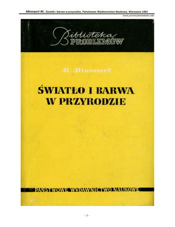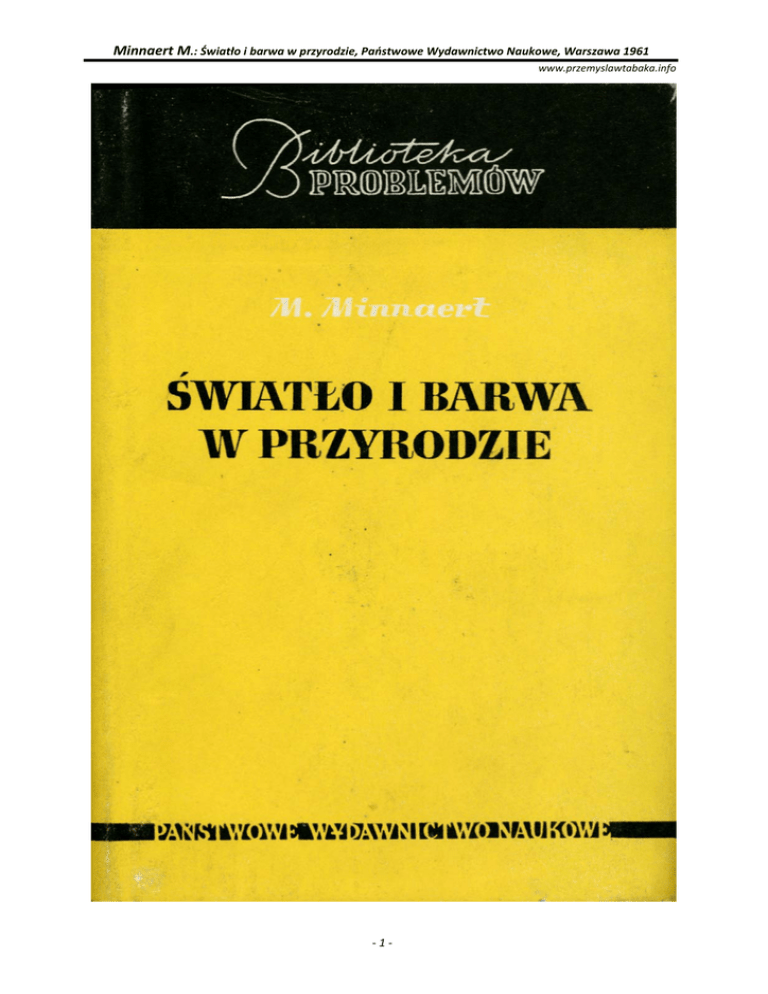 Minnaert M.: Światło i barwa w przyrodzie, Państwowe Wydawnictwo Naukowe, Warszawa 1961 www.przemyslawtabaka.info ‐1‐ Minnaert M.: Światło i barwa w przyrodzie, Państwowe Wydawnictwo Naukowe, Warszawa 1961 www.przemyslawtabaka.info Przemysław Tabaka SPIS TREŚCI Przedmowa autora do wydania polskiego Przedmowa tłumacza Wstęp Słoneczne światło i cienie 1. Obraz Słońca 2. Cienie 3. Obrazy Słońca i cienie podczas zaćmień słonecznych i zachodów Słońca 4. Cienie podwójne 13 15 19 23 26 27 28 31 32 33 36 37 39 39 41 43 44 45 46 47 54 56 58 61 62 63 63 63 65 Załamanie światła 27. Załamanie światła przy przejściu z powietrza do wody 28. Załamanie na wypukłej powierzchni wody 29. Załamanie w nierównym szkle 30. Podwójne odbicia od szkła lustrzanego 31. Wielokrotne odbicia w szkle lustrzanym, w świetle przechodzącym 32. Odbicia korony drzew w szkle okiennym 68 70 71 72 75 77 Odbicie światła 5. Prawo odbicia 6. Odbicie od drutów telegraficznych 7. Różnica między przedmiotem a jego odbiciem 8. Promienie światła odbite w kanałach i rzekach 9. Niezwykłe odbicia 10. Strzelanie do odbić 11. Heliotrop Gaussa 12. Odbicie w zwierciadlanej kuli ogrodowej 13. Odbicia w bańkach mydlanych 14. Nierówności na powierzchni wody 15. Szkło okienne i lustrzane 16. Lustra drogowe 17. Nieregularne odbicie na z lekka pomarszczonej wodzie 18. Szczegółowe badania słupów świetlnych 19. Odbicie od pasma wody o pomarszczonej powierzchni 20. Odbicia od dużej powierzchni wodnej pokrytej falami 21. Warunki widzialności bardzo słabego falowania 22. Plamy świetlne na powierzchni zanieczyszczonej wody 23. Plamy świetlne na śniegu 24. Plamy świetlne na drogach 25. Odbicie w kałużach podczas deszczu 26. Świetlne okręgi w gałęziach drzew ‐2‐ Minnaert M.: Światło i barwa w przyrodzie, Państwowe Wydawnictwo Naukowe, Warszawa 1961 www.przemyslawtabaka.info 33. Ślady po wycieraczce samochodowej 34. Krople wody jako soczewki 35. Barwy tęczy w kroplach rosy i kryształach szronu 78 79 80 81 82 86 86 95 96 100 106 107 114 114 115 118 121 122 123 124 126 129 131 131 132 133 133 135 137 138 139 142 145 147 148 149 150 152 154 155 158 160 Zakrzywienie promieni świetlnych w atmosferze 36. Ziemskie zakrzywienie promieni 37. Anomalne zakrzywienie promienia bez odbicia 38. Miraż w miniaturze 39. Duże miraże nad powierzchniami rozgrzanymi („dolne miraże") 40. Miraże nad zimną wodą („górne miraże") 41. Zamki powietrzne 42. Deformacje Słońca i Księżyca przy wschodzie i zachodzie 43. Wielokrotne obrazy Słońca i Księżyca 44. Zielony promień 45. Zielony przypływ 46. Czerwony promień 47. Migotanie ziemskich źródeł światła 48. Migotanie gwiazd 49. Jak się mierzy migotanie gwiazd? 50. Kiedy gwiazdy migocą najsilniej? 51. Migotanie planet 52. Latające cienie Natężenie i jasność światła 53. Gwiazdy jako źródła światła o znanym natężeniu 54. Wygaszanie światła przez atmosferę 55. Porównanie gwiazdy ze świecą 56. Porównanie dwóch latarń ulicznych 57. Porównanie Księżyca z latarnią uliczną 58. Jasność tarczy Księżyca 59. Stosunki jasności niektórych przedmiotów w krajobrazie 60. Zdolność odbijająca 61. Przejście światła przez siatkę drucianą 62. Stopnień nieprzezroczystości lasu 63. Prześwity w podwójnej palisadzie 64. Fotometria fotograficzna Oko 65. Widzenie pod wodą 66. Jak można zobaczyć wnętrze swego oka? 67. Ślepa plama 68. Nocna krótkowzroczność 69. Wady obrazów powstających w oku 70. Pęki promieni, które widzimy jako wychodzące z jasnych źródeł światła 71. Zjawiska powstające w okularach 72. Ostrość widzenia 73. Czułość widzenia na wprost i z ukosa 74. Doświadczenie Fechnera ‐3‐ Minnaert M.: Światło i barwa w przyrodzie, Państwowe Wydawnictwo Naukowe, Warszawa 1961 www.przemyslawtabaka.info 75. Krajobraz w świetle księżycowym 76. Krajobraz w jasnym świetle dziennym 77. Wartość graniczna (próg) stosunku jasności 78. Białe przedmioty w nocy 79. Rola zasłony okiennej 80. Kolorowe szyby okienne 81. Gwiazdy o zmierzchu i w noc księżycową 82. Widzialność gwiazd podczas dnia 83. Irradiacja 84. Oślepiające działanie światła Barwy 85. Mieszanie się barw 86. Odbicie i gra barw 87. Barwa roztworów koloidalnych metali. Fioletowe szyby okienne 88. Barwa rurek świecących; pochłanianie światła w gazach 89. Efekt Purkinjego. Czopki i pręciki 90. Barwa bardzo jasnych źródeł światła zbliża się do białej 91. Wrażenie przy oglądaniu krajobrazu przez kolorowe szyby 92. Obserwacja barw ze spuszczoną głową Obrazy wtórne i zjawiska kontrastów 93. Czas trwania wrażeń świetlnych 94. Zjawisko „sztachet" 95. Migocące źródła światła 96. Graniczna częstość migotania dla widzenia centralnego i peryferyjnego 97. „Nieruchome" koło rowerowe 98. „Nieruchome" koło samochodowe 99. „Nieruchome" śmigło samolotu 100. Obserwacje wirującego koła rowerowego 101. Obrazy wtórne 102. Zjawisko Elżbiety Linne 103. Zmiana barwy w obrazach wtórnych 104. Kontrast otrzymywany przy „porównaniu jednoczesnym" 105. Obwódka kontrastowa na pograniczu różnych jasności 106. Obwódka kontrastowa wzdłuż granic cienia 107. Czarny śnieg 108. Biały śnieg i szare niebo 109. Kontrasty barwne 110. Kolorowe cienie 111. Barwne cienie powstające od kolorowych odbić 112. Trójkąt powstający przez kontrast 161 161 162 163 163 164 164 166 166 169 170 171 172 172 174 175 175 176 177 178 182 184 185 186 187 188 191 193 194 196 196 197 199 199 200 202 206 206 Ocena kształtu i ruchu 113. Złudzenie optyczne co do położenia i kierunku 114. Jakim widzimy ruch 115. Poruszające się gwiazdy 116. Wirujący krajobraz i towarzyszący nam Księżyc ‐4‐ 208 210 211 213 Minnaert M.: Światło i barwa w przyrodzie, Państwowe Wydawnictwo Naukowe, Warszawa 1961 www.przemyslawtabaka.info 117. Złudzenia wywołane spoczynkiem lub ruchem 214 118. Huśtające s