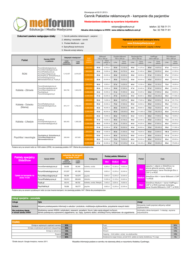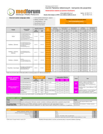 Obowiązuje od 02.01.2012 r. Cennik Pakietów reklamowych - kampanie dla pacjentów Niestandardowe działania są wyceniane indywidualnie [email protected] Aktualna oferta dostępna na WWW: www.reklama.medforum.com.pl Dokument zawiera następujące działy: telefon: 32 700 71 71 fax: 32 700 71 81 1. Cennik pakietów reklamowych - pacjenci 2. eMailing i newsletter - cennik Największa społeczność edukacyjna lekarzy 3. Portale Medforum - opis www.EdukacjaMedyczna.pl 4. Specyfikacja techniczna Ponad 16.000 kont lekarskich, zapytaj o ofertę! 5. Warunki emisji reklamy Statystyki miesięczne* Serwisy WWW w pakiecie Pakiet Liczba Unikalnych Użytkowników ForumGinekologiczne.pl, ForumDermatologiczne.pl, ForumPediatryczne.pl, ForumNeurologiczne.pl, Psychiatria.pl, Schizofrenia.pl, ForumOnkologiczne.pl, Memowiadomosci.pl, Fozik.pl RON Kobieta - Zdrowie Kobieta - Dziecko (Mama) Kobieta - Lifestyle Psychika i neurologia ForumGinekologiczne.pl, ForumDermatologiczne.pl, ForumNeurologiczne.pl, Psychiatria.pl, ForumOnkologiczne.pl ForumPediatryczne.pl, ForumGinekologiczne.pl, Fozik.pl 1,312,057 904,746 874,117 Fozik.pl, ForumGinekologiczne.pl, ForumDermatologiczne.pl Psychiatria.pl, Schizofrenia.pl, ForumNeurologiczne.pl, Memowiadomosci.pl 660,493 308,049 Liczba odsłon 2,619,027 Billboard 750 x 100 px Ilość odsłon (pakiet) CPM 250,000 500,000 Double billboard 750 x 200 px Rectangle Box 300 x 250 px HalfPage 300 x 600 px TRI billboard 750 x 300 px Cena pakietu w zł CPM Cena pakietu CPM Cena pakietu CPM Cena pakietu CPM Cena pakietu 35 zł 8,750 zł 53 zł 13,125 zł 46 zł 11,375 zł 60 zł 14,875 zł 67 zł 16,625 zł 33 zł 16,500 zł 50 zł 24,750 zł 43 zł 21,450 zł 56 zł 28,050 zł 63 zł 31,350 zł 1,000,000 30 zł 30,000 zł 45 zł 45,000 zł 39 zł 39,000 zł 51 zł 51,000 zł 57 zł 57,000 zł 2,000,000 25 zł 50,000 zł 38 zł 75,000 zł 33 zł 65,000 zł 43 zł 85,000 zł 48 zł 95,000 zł 250,000 38 zł 9,500 zł 57 zł 14,250 zł 49 zł 12,350 zł 65 zł 16,150 zł 72 zł 18,050 zł 500,000 36 zł 18,000 zł 54 zł 27,000 zł 47 zł 23,400 zł 61 zł 30,600 zł 68 zł 34,200 zł 1,000,000 34 zł 34,000 zł 51 zł 51,000 zł 44 zł 44,200 zł 58 zł 57,800 zł 65 zł 64,600 zł 2,000,000 31 zł 62,000 zł 47 zł 93,000 zł 40 zł 80,600 zł 53 zł 105,400 zł 59 zł 117,800 zł 250,000 53 zł 13,250 zł 80 zł 19,875 zł 69 zł 17,225 zł 90 zł 22,525 zł 101 zł 25,175 zł 500,000 50 zł 25,000 zł 75 zł 37,500 zł 65 zł 32,500 zł 85 zł 42,500 zł 95 zł 47,500 zł 1,000,000 46 zł 46,000 zł 69 zł 69,000 zł 60 zł 59,800 zł 78 zł 78,200 zł 87 zł 87,400 zł 2,000,000 43 zł 86,000 zł 65 zł 129,000 zł 56 zł 111,800 zł 73 zł 146,200 zł 82 zł 163,400 zł 250,000 40 zł 10,000 zł 60 zł 15,000 zł 52 zł 13,000 zł 68 zł 17,000 zł 76 zł 19,000 zł 500,000 37 zł 18,500 zł 56 zł 27,750 zł 48 zł 24,050 zł 63 zł 31,450 zł 70 zł 35,150 zł 1,000,000 34 zł 34,000 zł 51 zł 51,000 zł 44 zł 44,200 zł 58 zł 57,800 zł 65 zł 64,600 zł 2,000,000 31 zł 62,000 zł 47 zł 93,000 zł 40 zł 80,600 zł 53 zł 105,400 zł 59 zł 117,800 zł 250,000 56 zł 14,000 zł 84 zł 21,000 zł 73 zł 18,200 zł 95 zł 23,800 zł 106 zł 26,600 zł 500,000 53 zł 26,500 zł 80 zł 39,750 zł 69 zł 34,450 zł 90 zł 45,050 zł 101 zł 50,350 zł 1,000,000 50 zł 50,000 zł 75 zł 75,000 zł 65 zł 65,000 zł 85 zł 85,000 zł 95 zł 95,000 zł 2,000,000 47 zł 94,000 zł 71 zł 141,000 zł 61 zł 122,200 zł 80 zł 159,800 zł 89 zł 178,600 zł 1,843,818 1,750,531 1,365,026 637,650 Podane ceny sa cenami netto za 1000 odsłon (CPM), nie zawierają podatku VAT. Oferta dla przedsiębiorców. Pakiety specjalny SlideShow statystyka dla kampanii na okres 14 dni* Serwis WWW ForumDermatologiczne.pl Liczba Unikalnych Użytkowników Liczba odsłon 54,438 95,349 Rodzaj pakietu Slideshow Kategoria kobieta, uroda Pakiet Mini Medium Maxi 8,290 zł 10,363 zł 18,653 zł Mini ForumGinekologiczne.pl Opłata za kampanie na okres 14 dni 213,537 451,392 kobieta ForumNeurologiczne.pl 58,339 120,270 ForumPediatryczne.pl 150,913 269,449 Fozik.pl 30,312 Psychiatria.pl 78,058 9,800 zł 12,250 zł 22,050 zł psyche 9,800 zł 12,250 zł 22,050 zł dziecko 10,500 zł 13,125 zł 23,625 zł 69,722 kobieta, uroda, lifestyle 7,400 zł 9,250 zł 16,650 zł 156,777 psyche 9,800 zł 12,250 zł 22,050 zł Opis zajawka + zdjęcie w SlideShow na stronie głównej serwisu, artykuł sponsorowany, baner Rectangle Box z CAP 2 w ROS Medium SlideShow Mini + baner Billboard z CAP 1 w ROS Maxi SlideShow Medium + baner HalfPage z CAP 2 w ROS (zamiast rectangle), baner Double Billboard z CAP 1 w ROS Podane ceny sa cenami ryczałtowymi netto za czas trwania kampanii, nie zawierają podatku VAT. Oferta dla przedsiębiorców. Usługi specjalne - pozostałe Usługa Opis Uwagi Konkurs Aktywne przekazywanie informacji o usłudze / produkcie, mobilizacja użytkowników, pozyskanie nowych treści lokowanie marki poprzez aktywny udział użytkowników Site produktowy klienta w ramach serwisu WWW Wydzielony serwis WWW z artykułami, newsami, poradami, forum i jako opcja ekspert na forum. Serwis poświęcony wybranemu zagadnieniu, np. ciąży, żywieniu dzieci, anoreksji.Formy reklamowe: do uzgodnienia. minimalny okres kampanii: 1 miesiąc, wycena indywidualna Dopłaty Emisja w wybranych częściach serwisu 30% Push 50% Emisja w wybranych godzinach (dayparting) 30% Audio 10% Emisja w sekwencji 15% Stream 10% Expand 20% Capping - limit odsłon emisji na użytkownika 15% Scroll 50% Zwiększona waga kreacji, ponad limit, opłata za każdy dodatkowy 1% wagi 1% *Źródło danych: Google Analytics, marzec 2011. Wszelkie informacje podane w cenniku nie stanowią oferty w rozumieniu Kodeksu Cywilnego. Obowiązuje od 02.01.2012 r. eMailingi i newsletter - cennik, kampanie dla pacjentów Niestandardowe działania są wyceniane indywidualnie [email protected] telefon: 32 700 71 71 Aktualna oferta dostępna na WWW: www.reklama.medforum.co