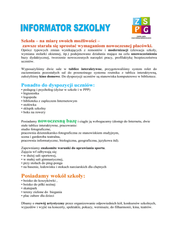 Szkoła – na miarę swoich moŜliwości – zawsze starała się sprostać wymaganiom nowoczesnej placówki. Oprócz typowych zmian wynikających z remontów i modernizacji (elewacja szkoły, wymiana stolarki okiennej, itp.) podejmowano działania mające na celu unowocześnienia bazy dydaktycznej, tworzenie nowoczesnych narzędzi pracy, profilaktykę bezpieczeństwa uczniów. WyposaŜyliśmy dwie sale w tablice interaktywne, przygotowaliśmy system rolet do zaciemniania pozostałych sal do przenośnego systemu rzutnika z tablica interaktywną, załoŜyliśmy kino domowe. Do dyspozycji uczniów są stanowiska komputerowe w bibliotece. Ponadto do dyspozycji uczniów: • pedagog i psycholog (dyŜur w szkole i w PPP) • higienistka • logopeda • biblioteka z zapleczem Internetowym • stołówka • sklepik szkolny • boks na rowery Posiadamy nowoczesną bazę i ciągle ją wzbogacamy (dostęp do Internetu, dwie stałe tablice interaktywne, pracowanie: studio fotograficzne, pracownia dziennikarsko-fotograficzna ze stanowiskiem studyjnym, scena i garderoba teatralna, pracownia informatyczne, biologiczna, geograficzna, językowa itd). Zapewniamy znakomite warunki do uprawiania sportu. Zajęcia wf odbywają się: • w duŜej sali sportowej, • w małej sali gimnastycznej, • przy stołach do ping-ponga • na basenie, lodowisku i stokach narciarskich dla chętnych Posiadamy wokół szkoły: • boisko do koszykówki , • boisko do piłki noŜnej • skatepark • tereny zielone do biegania • plac zabaw dla dzieci Dbamy o rozwój artystyczny przez organizowanie odpowiednich kół, konkursów szkolnych, wyjazdów i wyjść na koncerty, spektakle, pokazy, wernisaŜe, do filharmonii, kina, teatrów. Wydajemy własną gazetkę, ksiąŜkę, organizujemy własne spektakle i akademie, bierzemy z powodzeniem udział w konkursach. Koło Foto Dziś dysponuje wysokiej klasy sprzętem do pracy: studiem fotograficznym wyposaŜonym w lampy studyjne z softboksem, plastrem miodu, filtrami, parasolki, blendy, statywy, stół bezcieniowy, strumienice, system teł, wyzwalacze radiowe i nadajniki do aparatów, wysokie krzesła, przebieralnię i szafę ze strojami, torby i plecak fotograficzny. Mamy lustrzankę cyfrową z dwoma obiektywami, aparat kompaktowy i kamerę. Ponadto kilkanaście aparatów analogowych o róŜnej historii w naszym stanowisku muzealnym oraz ksiąŜki na temat fotografii. Oprócz zdjęć cyfrowych, wciąŜ moŜliwa jest nauka fotografii analogowej. ToteŜ przygotowaliśmy stanowisko ciemniowe, które jest na etapie doposaŜenia. Koło dziennikarskie Od około pięciu lat pręŜnie rozwija się nasze koło. Wydajemy gazetkę na wysokim poziomie estetycznym merytorycznym. Jeździmy na warsztaty (w siedzibie Dziennika Zachodniego, dziennikarstwo sportowe na stadionie Ruchu Chorzów, odwiedzamy redakcję, drukarnię, publikujemy w Internecie, prasie lokalnej, wygrywamy konkursy. Pracujemy na platformie JUNIORMEDIA. Innowacyjny projekt klasy fotograficzno-dziennikarskiej • • • • • • • • • • • • • • • • • 2-3 opiekunów – wychowawca i opiekun warsztatowy (dziennikarstwo i fotografia) 3 godziny tygodniowo zajęć dziennikarskich i fotograficznych całodniowe plenery (Kraków, Wrocław, Świerklaniec i in.) zagraniczny plener (np. Praga, Lwów, Wilno, Wiedeń) obóz warsztatowy dodatkowe zajęcia fotograficzne po angielsku spotkania z dziennikarzami, fotografami odwiedziny w redakcji radiowej, prasowej, telewizyjnej, drukarni tworzenie gazetki szkolnej (wersja papierowa i elektroniczna) udział w ogólnopolskich konkursach dziennikarskich, literackich i fotograficznych tworzenie radia i telewizji szkolnej współpraca z programem JUNIOR MEDIA warsztaty JUNIOR MEDIA kontakt z liceami fotograficznymi, szkołami policealnymi wystawy zdjęć uczniów w szkole i poza nią wyjścia na wernisaŜe uczeń redakcji otrzymuje koszulkę, legitymację i identyfikator prasowy. W programie m.in.: • • • • • • • • kompozycja zdjęć fotografia analogowa zajęcia w studiu fotograficznym fotografia portretowa, krajobrazowa, architektury, modowa, produktowa rozbieranie i budowanie aparatu profesjonalna edycja tekstu i przygotowanie do publikacji zajęcia z grafiki komputerowej korelacja z innymi przedmiotami Co za nami? • • • • • • • • kilka lat działania szkolnej redakcji, odwiedziny w redakcji Dziennika Zachodniego oraz drukarni prasowej, wywiady ze znanymi ludźmi, m. in. Beatą Tadlą, udział w warsztatach dziennikarskich, warsztaty fotograficzne udział w sondach ulicznych, wygrane konkursy dziennikarskie, profesjonalny druk szkolnej gazetki przez drukarnię prasową W szkole istnieje system zabezpieczeń – mamy kilka kamer na terenie całej szkoły. WciąŜ wzbogacana jest baza pomocy i narzędzi dydaktycznych od klasycznych po multimedialne. Pamiętać jednak naleŜy, Ŝe najlepszy sprzęt i najnowocześniejsze zdobycze techniki nie wyręczą ucznia w jego obowiązkach. Uczymy języków: języka angielskiego, niemieckiego. Odbywały się u nas warsztaty języka włoskiego. Mamy w ofercie dodatkowe zajęcia z języka rosyjskiego dla chętnych. Szczycimy się wysokimi wynikami egzaminów zewnętrznych z języka angielskiego. Koła sportowe: • Koło turystyczno - rowerowe (organizowane: wycieczki piesze i rowerowe, wyjazdy na narty i łyŜwy) • SKS (siatkówka, koszykówka, piłka noŜna, lekkoatletyka, tenis ziemny) Koła językowe: • Języka angielskiego • Języka niemieckiego Koła przedmiotowe języka polskiego matematyczne informatyczne fizyczne historyczne chemiczne biologiczne geograficzne wiedzy o społeczeństwie Koła artystyczne: teatralne fotograficzne plastyczne Inne koła: dziennikarskie (zbieranie i opracowanie informacji na temat Ŝycia szkoły, współczesnych problemów i wydarzeń) koło wolontariatu CARITAS PowyŜej przedstawiamy bieŜącą ofertę kół, ale pamiętaj, Ŝe jesteśmy otwarci na wszystki