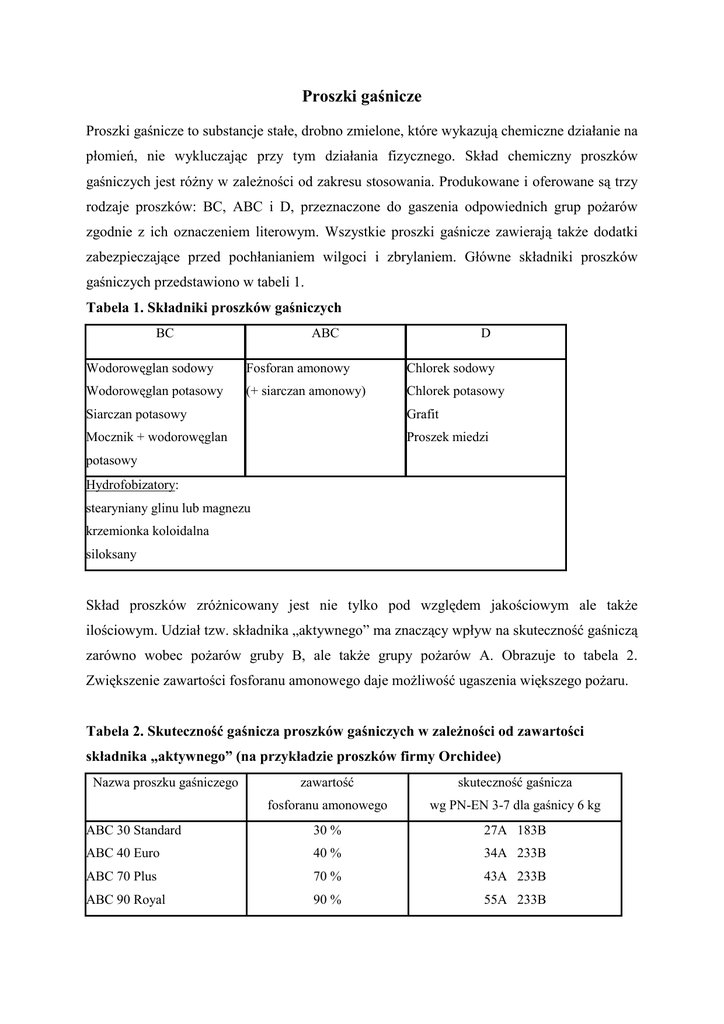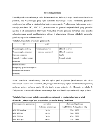 Proszki gaśnicze Proszki gaśnicze to substancje stałe, drobno zmielone, które wykazują chemiczne działanie na płomień, nie wykluczając przy tym działania fizycznego. Skład chemiczny proszków gaśniczych jest różny w zależności od zakresu stosowania. Produkowane i oferowane są trzy rodzaje proszków: BC, ABC i D, przeznaczone do gaszenia odpowiednich grup pożarów zgodnie z ich oznaczeniem literowym. Wszystkie proszki gaśnicze zawierają także dodatki zabezpieczające przed pochłanianiem wilgoci i zbrylaniem. Główne składniki proszków gaśniczych przedstawiono w tabeli 1. Tabela 1. Składniki proszków gaśniczych BC ABC D Wodorowęglan sodowy Fosforan amonowy Chlorek sodowy Wodorowęglan potasowy (+ siarczan amonowy) Chlorek potasowy Siarczan potasowy Grafit Mocznik + wodorowęglan Proszek miedzi potasowy Hydrofobizatory: stearyniany glinu lub magnezu krzemionka koloidalna siloksany Skład proszków zróżnicowany jest nie tylko pod względem jakościowym ale także ilościowym. Udział tzw. składnika „aktywnego” ma znaczący wpływ na skuteczność gaśniczą zarówno wobec pożarów gruby B, ale także grupy pożarów A. Obrazuje to tabela 2. Zwiększenie zawartości fosforanu amonowego daje możliwość ugaszenia większego pożaru. Tabela 2. Skuteczność gaśnicza proszków gaśniczych w zależności od zawartości składnika „aktywnego” (na przykładzie proszków firmy Orchidee) Nazwa proszku gaśniczego zawartość skuteczność gaśnicza fosforanu amonowego wg PN-EN 3-7 dla gaśnicy 6 kg ABC 30 Standard 30 % 27A 183B ABC 40 Euro 40 % 34A 233B ABC 70 Plus 70 % 43A 233B ABC 90 Royal 90 % 55A 233B Dokładne określenie typu i nazwy proszku gaśniczego, podczas jego użytkowania, ma niezwykle istotne znaczenie, gdyż w grę wchodzi najważniejszy z parametrów określanych podczas badań - skuteczność gaśnicza. Z przykrością należy stwierdzić, że fakt ten jest powszechnie bagatelizowany przez konserwatorów podręcznego sprzętu gaśniczego, np. podczas wymiany proszku gaśniczego. Regułą jest, że zbiornik gaśnicy jest zasypywany dowolnym proszkiem gaśniczym BC lub ABC. Podkreślić należy, że zgodnie z zapisami normy PN-EN 3-7, środek gaśniczy (a więc także proszek gaśniczy) jest elementem konstrukcyjnym gaśnicy i podczas konserwacji nie może podlegać wymianie na inny, np. pochodzący od innego producenta lub nawet o „podobnym” składzie. Zadania tego nie ułatwiają producenci gaśnic, którzy stosują w swoich produktach wiele różnych proszków. Np. wg stanu na czerwiec 2014 roku w oferowanych gaśnicach z proszkiem ABC jedna z polskich firm stosowała 4 różne proszki gaśnicze typu ABC. Coraz powszechniejsze staje się również nadawanie proszkom nazw „roboczych” różniących się od pierwotnych nadawanych przez ich producentów, co utrudnia w znacznym stopniu ich identyfikację. Proszki gaśnicze wprowadzane do stosowania, w zależności od sposobu ich wykorzystania, muszą spełniać wymagania różnych norm. Proszki gaśnicze przeznaczone do stosowania w podręcznym sprzęcie gaśniczym (gaśnice przenośne i przewoźne) nie są poddawane oddzielnym badaniom i powinny spełniać wymagania określone w normach: PN-EN 3-7 i PN-EN 1866-1. Natomiast proszki gaśnicze, które miałby być stosowane w agregatach gaśniczych będących mobilnymi (np. samochody proszkowe) lub stacjonarnymi urządzeniami gaśniczymi, muszą spełniać wymagania normy PN-EN 615. Pomiędzy tymi normami istnieje pewien związek. Np. w zakresie testowania skuteczności gaśniczej proszku norma PN-EN 615 odsyła do normy PN-EN 3-7. Norma PN-EN 3-7 w zakresie stosowania proszków gaśniczych wprowadza szereg ograniczeń. Nowelizacje ww. normy mogą wprowadzać ograniczenia w zakresie stosowania poszczególnych typów gaśnic, także proszkowych. Pierwszym z takich ograniczeń jest zawężenie obszaru stosowania gaśnic na dwutlenek węgla powszechnie nazywanych śniegowymi. Wg zapisów normy: „Odniesienia dotyczące przydatności gaśnicy do gaszenia pożarów gazów (grupy C) podane są na odpowiedzialność producenta, ale dotyczą tylko gaśnic proszkowych”. Oznacza to, że produkowane od kilku lat gaśnice na CO2 nie mogą być oznaczane piktogramem „C”. W powszechnym użyciu znajdują się jednak także „stare” gaśnice o oznaczeniu „BC”, obecnie produkowane posiadają na etykiecie wyłącznie oznaczenie „B”. Ograniczenie to warto skonfrontować z zapisem w rozporządzeniu ministra gospodarki z dnia 21.111.2005r. (Dz.U. 243/2005), które mówi: „Magazyn, w którym składowane są butle z gazem płynnym: ... wyposaża się w gaśnice proszkowe o masie 9 kg ... dopuszcza się stosowanie 2 gaśnic śniegowych CO2 o masie 5 kg każda zamiast gaśnicy proszkowej...”. Gaśnice proszkowe nie są gaśnicami „uniwersalnymi”. Norma PN-EN 3-7 zabrania stosowania tych gaśnic do gaszenia pożarów grupy F, dotyczy to także gaśnic na CO2: „Stosowanie gaśnic proszkowych i na dwutlenek węgla do gaszenia pożarów grupy F uważa się za niebezpieczne ... gaśnic proszkowych i na dwutlenek węgla nie należy ... znakować piktogramem F”. Inne ograniczenie w stosowaniu proszków gaśniczych dotyczy pożarów metali. Ze względu na całkowicie odmienny mechanizm gaśniczy, skład chemiczny proszku i sposób podawania, stosowanie proszków BC i ABC oraz D jest wyraźnie rozdzielone: „Gasnice przenośne z deklarowaną przydatnością do gaszenia pożarów grupy D nie powinny mieć oznaczenia przydatności do żadnej innej grupy” oraz „Gaszenie pożaru metalu jest na tyle specyficzne, że nie jest możliwe zdefiniowanie reprezentatywnego standardowego pożaru do celów badawczych. Efektywność gaśnic w pożarach grupy D można oceniać na bazie studiów poszczególnych przypadków”. Oznacza to, że nie znajduje się na rynku produkt w postaci uniwersalnej gaśnicy proszkowej ABCD. Gaśnica proszkowa powszechni