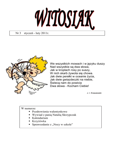 Nr 3 styczeń - luty 2011r. We wszystkich mowach i w języku duszy Nad wszystkie są dwa słowa, Jak w kroplach rosy po suszy, W nich skarb żywota się chowa. Jak dwie perełki w oceanie życia, Jak dwie gwiazdeczki na niebie, Świecą nam do powicia Dwa słowa - Kocham Ciebie! J. I. Kraszewski W numerze: Pozdrowienia walentynkowe Wywiad z panią Natalią Skrzypczak Kalendarium Krzyżówka Sprawozdanie z „Nocy w szkole” Kalendarium 22 XII 2010r. - Szkolne święto – Wigilia 3 I 2011r. - Wielki powrót do szkoły po przerwie świątecznej. 15 I 2011r. – Zabawa karnawałowa organizowana w naszej szkole przez Radę Rodziców 25 I 2011r. – Konkurs polonistyczno-sportowy dla szkoły podstawowej „Bieg po wiedzę” 27 I 2011r. – Odwiedzili nas górale. Każdy pamięta przyśpiewkę „Cztery kozy, jeden cap” 28 I 2011r. – W piątkowy wieczór odbył się „Gimbal” 29 I – 13 II 2011r. – FERIE!!! Godne polecenia Gorąco zachęcam do przeczytania książki pt. „Wrota czasu” napisaną przez Ulyssesa Moore'a . Jest to pierwszy z dwunastu tomów, które dotychczas się ukazały, lecz cała saga jest podzielona na na dwie odrębne części, w których występują ci sami bohaterowie ale przygody są inne. Polskie wydanie powieści zostało opublikowane w 2006 przez wydawnictwo Firma Księgarska. Książka liczy 222 strony i jest napisana dużą czcionką. Głównymi bohaterami opowieści są nastoletnie bliźniaki- Julia i Jason oraz ich przyjaciel Rick. Rodzeństwo wraz z rodzicami przeprowadza się z Londynu do miasteczka Kilmore Cove. Okazuje się, że miasteczka nie ma na żadnej mapie, Internet tu nie działa, a pociągi w ogóle tu nie dojeżdżają. Tam właśnie cała rodzina zamieszkuje w położonej wysoko nad urwiskiem ogromnej Willi Argo pełnej tajemniczych pomieszczeń. Po paru dniach pobytu w Kilmore Cove poznają Ricka. Razem z nim próbują odkryć tajemnicę starych, drewnianych drzwi, które stały zasłonięte przez szafę. Wrota są zamknięte na cztery zamki, do których niestety nie mają kluczy. Po jakimś czasie odkrywają na plaży list, który jest zapisany starożytnym pismem. Co oznacza zagadkowy tekst w liście? Czy uda im się zdobyć klucze do tajemniczych wrót i odkryć ich tajemnicę? Czy w końcu dowiedzą się dlaczego to miasteczko nie ma kontaktu ze światem zewnętrznym? Z czym będą musieli się zmierzyć? Jak to wszystko się skończy? Książka ta jest idealna dla młodzieży. Jest połączeniem przygody z fantastyką. Idealnie nadaje się na długie wieczory. Szczęśliwy numerek Kto nam ten numerek wykręcił i dopływ tak fantastycznych możliwości zakręcił??? Czyżby zapomniał i może nie wiedział, że NIEPYTANY NUMEREK to źródło naszych nadziei już od pradawnych dni! A więc wołamy WRÓĆ MÓJ LUBY i niechaj już wśród szkolnej gawiedzi się nie zgubi!!! Wywiad z panią Natalią Skrzypczak 1. Jakie to uczucie nauczać w szkole, w której się kiedyś samemu uczyło? Przyznaje się oczywiście, że skończyłam Szkołę Podstawową w Biezdrowie i mam nawet pewien sentyment. Nie ma to jednak dla mnie większego znaczenia patrząc pod kątem tego, że teraz w niej pracuje jako nauczyciel. Bycie uczniem, a nauczycielem to dwie zupełnie odmienne role, tym bardziej, że tą pierwszą pełniłam 10 lat temu. Są jednak dobre strony tego, że kiedyś już w tej szkole przebywałam i znam trochę „te mury”. Plusem było np. to, że wchodząc na początku roku szkolnego do szkoły wiedziałam, gdzie znajdują się poszczególne klasy, gabinety, choć najważniejsze dla mnie pomieszczenie, a mianowicie sala gimnastyczna była dla mnie zupełnie nieznana, bo choć mieszkam w niedalekiej odległości od szkoły nigdy prywatnie przed 1 września w niej nie byłam. Z czasów kiedy ja się Tu uczyłam to pamiętam tą małą salę gimnastyczną zwaną „piekiełkiem”. Było mi też chyba trochę łatwiej przebywać na początku w pokoju nauczycielskim, zamienić kilka słów z nauczycielami których znam, bo mnie też uczyli poszczególnych przedmiotów czy porozmawiać z pozostałymi pracownikami. Tak, więc na początku było mi łatwiej się zaaklimatyzować w nowej pracy, ale teraz nie mam jakiś przywilejów z tego powodu, że byłam uczniem tej szkoły. 2. Dobrze się pani pracuje z naszą młodzieżą? Na to pytanie łatwiej było by pewnie odpowiedzieć nauczycielowi z pewnym doświadczeniem, który uczył też w innej szkole i ma jakieś porównanie. Ja takiego nie mam. Na dzisiaj mogę powiedzieć, że „daję radę” (ale nie wiem jak długo jeszcze), i że „da się z Wami wytrzymać”. 3. Co spowodowało, że poszła pani na AWF? Od zawsze mój świat kręcił się wokół sportu. Nie pamiętam, żebym kiedykolwiek zapomniała stroju na w-f, bądź specjalnie z jakiś wymyślonych powodów nie ćwiczyła (co Wam się niestety zdarza ). Chętnie grałam we wszystkie gry drużynowe, nawet w piłkę nożną, a w podstawówce nawet codziennie. Koło mojego domu było kiedyś boisko do piłki nożnej i popołudniami jak tylko usłyszałam, że chłopaki grają to biegłam tam, żeby na początku tylko popatrzeć i podawać im piłkę wybitą za bramkę, a z czasem pozwalali mi też grać – jako jedynej dziewczynie, bo innych chętnych nie było. I pewnie jakby 14 lat temu nie zaczęła się moja przygoda z kręglami i byłaby w okolicy szkółka piłki nożnej dla dziewczyn to trenowałabym w niej. Drugim powodem podjęcia decyzji o studiach na AWF było to, że w pewnym momencie życia spodobał mi się zawód nauczyciela (ale tylko w-f). No i myślałam, że fajnie jest studiować na uczelni, na której przede wszystkim są zajęcia ruchowe i nie ma za dużo teorii, którą trzeba „wykuć na blachę”. Ale tu życie niestety zweryfikowało szybko tę kwestię. Bo owszem fajnie było mieć na zajęciach takie dyscypliny sportu jak np. golf, judo, taniec czy pływanie, ale z każdej z nich oprócz prak