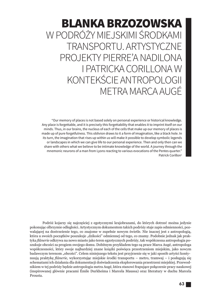 BLANKA BRZOZOWSKA W PODRÓŻY MIEJSKIMI ŚRODKAMI TRANSPORTU. ARTYSTYCZNE PROJEKTY PIERRE’A NADILONA I PATRICKA CORILLONA W KONTEKŚCIE ANTROPOLOGII METRA MARCA AUGÉ “Our memory of places is not based solely on personal experience or historical knowledge. Any place is forgettable, and it is precisely this forgettability that enables it to imprint itself on our minds. Thus, in our brains, the nucleus of each of the cells that make up our memory of places is made up of pure forgetfulness. This oblivion draws to it a form of imagination, like a black hole. In its turn, the imagination that rises up within us will make it possible to develop symbolic legends or landscapes in which we can give life to our personal experience. Then and only then can we share with others what we believe to be intimate knowledge of the world. A journey through the mnemonic neurons of a man from Lyons reacting to various evocations of the Pentes quarter.” Patrick Corillon1 Podróż kojarzy się najczęściej z egotycznymi krajobrazami, do których dotrzeć można jedynie pokonując olbrzymie odległości. Artystycznym dokumentem takich podróży staje zapis odmienności, pozwalającej na dostrzeżenie tego, co znajome w zupełnie nowym świetle. Nie inaczej jest z antropologią, która u swoich początków poszukuje „dzikości” odmiennej od tego, co znamy. Podobnie jednak jak praktyka flânerie odkrywa na nowo miasto jako teren egzotycznych podróży, tak współczesna antropologia poszukuje obcości za progiem swojego domu. Dobitnym przykładem tego są prace Marca Augé, antropologa współczesności, który swoje najbardziej znane książki poświęca przestrzeniom miejskim, jako nowym badawczym terenom „obcości”. Celem niniejszego tekstu jest przyjrzenie się w jaki sposób artyści kontynuują praktykę flânerie, wykorzystując miejskie środki transportu – metro, tramwaj – i posługują się schematami ich działania dla dokumentacji doświadczenia eksplorowania przestrzeni miejskiej. Przewodnikiem w tej podróży będzie antropologia metra Augé, która stanowi frapujące połączenie pracy naukowej (inspirowanej głównie pracami Émile Durkheima i Marcela Maussa) oraz literatury w duchu Marcela Prousta. 63 Antropologia metra W pracach Augé, paryskie metro pełni funkcję maszyny pamięci, która dzięki nieoczekiwanym skojarzeniom, jakie niosą ze sobą nazwy kolejnych stacji, otwiera sferę „wewnętrznej geologii”. „Podziemna geografia” miasta splata się z intymnym wymiarem pamięci indywidualnej, przywołując na zasadzie nagłych odkryć dawno zapomniane wydarzenia. Pod tym względem metro przypomina album ze zdjęciami – każda stacja przywołuje konkretne obrazy związane z przeszłymi trajektoriami ruchu. Mapa metra jest zatem dla Augé medium pozwalającym na czytanie przeszłości. Konkretne stacje składają się na swego rodzaju curriculum vitae, tworząc obraz kolejnych etapów życia zawodowego i uczuciowego1. Podejmując się trudu antropologicznej wyprawy, badacz nie stara się zanegować tego osobistego wymiaru doświadczenia, zdając sobie w pełni sprawę z dwuznacznej roli obserwatora zanurzonego w obserwowanej rzeczywistości. Przygląda się jednocześnie innym podróżnym, starając się dostrzec podobieństwa i specyfikę kolektywnego doświadczenia podróżowania metrem. Porównuje codziennych pasażerów do starych żeglarzy, którzy dzięki zdobywanemu latami doświadczeniu dokładnie umieją przewidzieć i wykorzystać wiatr oraz prądy morskie do żeglugi. Codzienne podróżowanie metrem jest zatem rodzajem rzemiosła, którego opanowanie pozwala usłyszeć dźwięk zbliżającego się pociągu (nie dając się oszukać złudnemu echu) i przewidzieć, w których fragmentach podziemnych korytarzy należy przyspieszyć. W dalszej kolejności wiedza taka umożliwia przyjęcie stosownych taktyk korzystania z przestrzeni w wagoniku, wybierając dla siebie najbardziej optymalną pozycję i miejsce podróży. Wreszcie, „podziemne rzemiosło” przekłada się również na eksplorację nadziemnego sąsiedztwa metra: pasażer wysiadając na tych samych stacjach dokładnie wie, jakich punktów orientacyjnych się spodziewać, aby przyspieszyć dalszą podróż, nie poświęcając kolejnym etapom drogi zbędnej refleksji. Z bezrefleksyjności codziennej rutyny wyrywa niekiedy pasażera nieoczekiwane skojarzenie przywołujące dawne, nieużywane już trasy. Mapa metra staje się również medium pozwalającym na zmianę punktu widzenia, wyrwanie się z automatyzmu, na jaki pozwala znajomość „rzemiosła” (Augé nie bez przyczyny przyrównuje doświadczenie podróży metrem do artystycznej praktyki André Bretona i surrealistów). Zatem, jak pisze autor, konfrontowanie się z metrem, to konfrontowanie się z własnym życiem, którego historia ulega zwielokrotnieniu, dzięki połączeniom (correspondances) z różnymi liniami i stacjami2. Czytanie metra jest dla badacza również formą kartografii. Tworzone w toku tej praktyki mapy prezentują różne wymiary indywidualnej i zbiorowej historii. „Atlas metra” odkrywa tajniki Francji z różnych momentów jej historii oraz Francji „geologicznej” czy „przemysłowej”, wpisując w jej punkty charakterystyczne indywidualne mapy życia miłosnego, rodzinnego, zawodowego3. Geografia „oficjalna” splata się w tym miejscu z bardziej „sekretną”, intymną, dla której istnieje jeden tylko czytelnik posiadający wiedzę do odczytania zakamuflowanych wskazówek. Metro widziane w ten sposób jest również narzędziem zmiany, pozwala nie tylko przemieszczać się pomiędzy sferami życia prywatnego i zawodowego, ale również zgłębiać nieznane obszary każdego z nich. Zmiany linii metra umożliwiają poruszanie się pomiędzy różnymi systemami symbolicznymi i praktykami4, czego symbolem staje się dla Augé przyrównanie planu metra do planszy gry Monopoly5. Nietrudno znaleźć analogię p