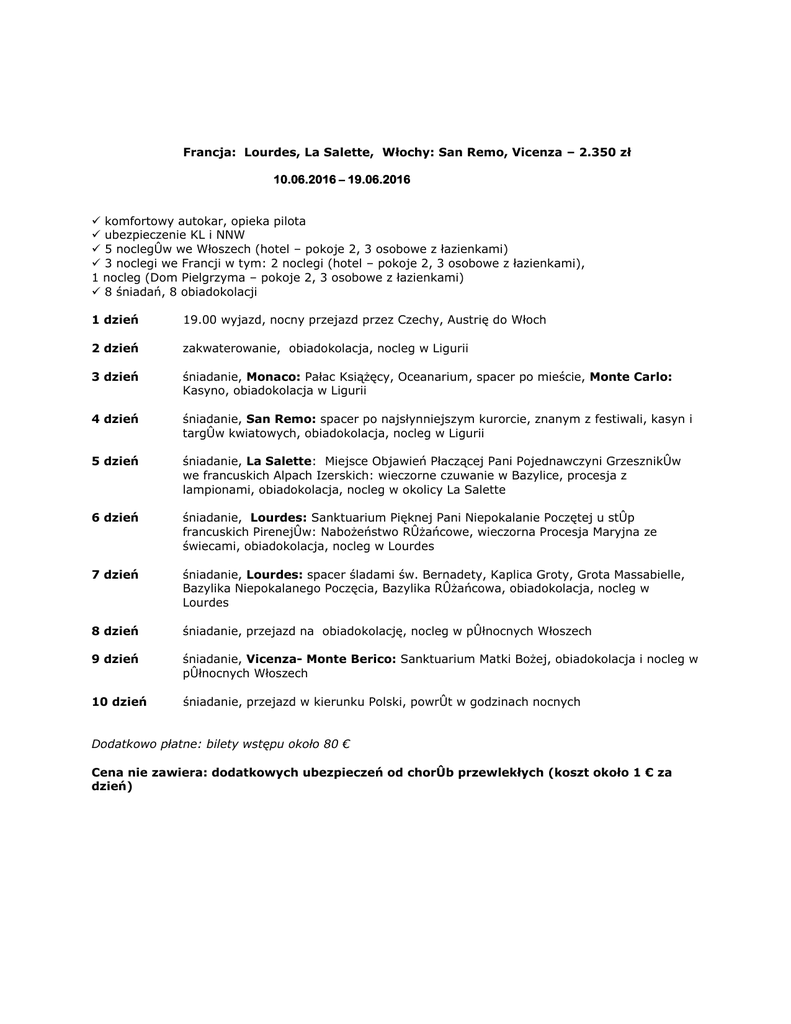 Francja: Lourdes, La Salette, Włochy: San Remo, Vicenza – 2.350 zł 10.06.2016 – 19.06.2016 komfortowy autokar, opieka pilota ubezpieczenie KL i NNW 5 noclegÛw we Włoszech (hotel – pokoje 2, 3 osobowe z łazienkami) 3 noclegi we Francji w tym: 2 noclegi (hotel – pokoje 2, 3 osobowe z łazienkami), 1 nocleg (Dom Pielgrzyma – pokoje 2, 3 osobowe z łazienkami) 8 śniadań, 8 obiadokolacji 1 dzień 19.00 wyjazd, nocny przejazd przez Czechy, Austrię do Włoch 2 dzień zakwaterowanie, obiadokolacja, nocleg w Ligurii 3 dzień śniadanie, Monaco: Pałac Książęcy, Oceanarium, spacer po mieście, Monte Carlo: Kasyno, obiadokolacja w Ligurii 4 dzień śniadanie, San Remo: spacer po najsłynniejszym kurorcie, znanym z festiwali, kasyn i targÛw kwiatowych, obiadokolacja, nocleg w Ligurii 5 dzień śniadanie, La Salette: Miejsce Objawień Płaczącej Pani Pojednawczyni GrzesznikÛw we francuskich Alpach Izerskich: wieczorne czuwanie w Bazylice, procesja z lampionami, obiadokolacja, nocleg w okolicy La Salette 6 dzień śniadanie, Lourdes: Sanktuarium Pięknej Pani Niepokalanie Poczętej u stÛp francuskich PirenejÛw: Nabożeństwo RÛżańcowe, wieczorna Procesja Maryjna ze świecami, obiadokolacja, nocleg w Lourdes 7 dzień śniadanie, Lourdes: spacer śladami św. Bernadety, Kaplica Groty, Grota Massabielle, Bazylika Niepokalanego Poczęcia, Bazylika RÛżańcowa, obiadokolacja, nocleg w Lourdes 8 dzień śniadanie, przejazd na obiadokolację, nocleg w pÛłnocnych Włoszech 9 dzień śniadanie, Vicenza- Monte Berico: Sanktuarium Matki Bożej, obiadokolacja i nocleg w pÛłnocnych Włoszech 10 dzień śniadanie, przejazd w kierunku Polski, powrÛt w godzinach nocnych Dodatkowo płatne: bilety wstępu około 80 € Cena nie zawiera: dodatkowych ubezpieczeń od chorÛb przewlekłych (koszt około 1 € za dzień)