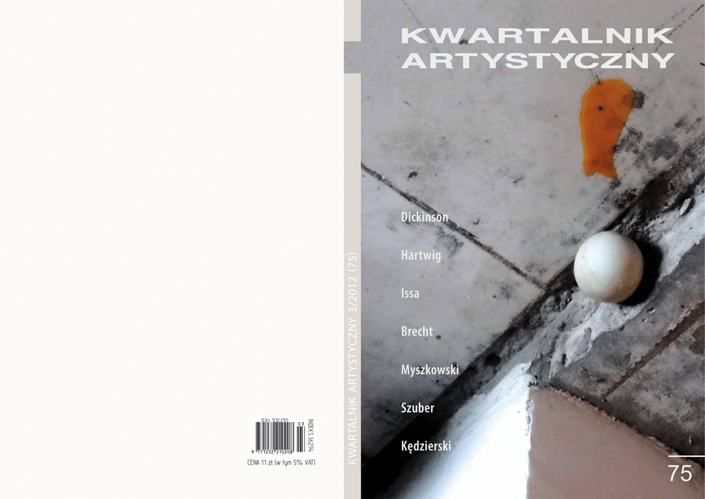 INDEKS 36294 CENA 1 1 zł (w tym 5% VAT) KWARTALNIK AR TYSTYCZNY 3/2012 (75) Dickinson Hartwig Issa Brecht Myszkowski Szuber Kędzierski 75 REDAKCJA: Krzysztof Myszkowski – redaktor naczelny Grzegorz Kalinowski – sekretarz redakcji ZESPÓŁ: Adam Bednarek, Jan Błoński , Stefan Chwin, Aleksander Fiut, Michał Głowiński, Marek Kędzierski, Julian Kornhauser, Leszek Szaruga ABSE ACHMATOWA ADAMIEC ADCOCK AJVAZ ALOCHIN ALTIEV AMICHAJ ANCET ANDERMAN ANDRZEJEWSKI ANTONIUK APOLLINAIRE APPEL ARP ASMUS ASPENSTRÖM ATWOOD AUSLANDERAUSTER AWIDAN BACHMANN BACON BACZAK BADZIĄG BAGIŃSKI BAJSIĆ BAKEVSKI BALANTIC BALCERZAN BALIŃSKI BANACH BANVILLE BARAN BARANOWSKA BAREŁKOWSKA BARRAL BARTCZAK BARTOSZEWSKI BATHELIER BECKETT BEDNARCZYK BE’ER BELMONT BENKA BENN BERLIN BERNACKI BERNADAC BERNHARD BESANCON BESZCZYŃSKA BEYER BIAŁOSZEWSKI BIELSKA-KRAWCZYK BIEŃKOWSKA BIEŃKOWSKI BIGA BLIN BLOOM BŁASIAK BŁOŃSKI BOBKOWSKI BOCHEŃSKI BOCZKOWSKI BOLECKA BOLECKI BOLEWSKI BORGES BORKOWSKA BOROWIEC BORUŃ BOURGEOIS BRAKONIECKI BRAUN BRAUTIGAN BRAY BRECHT BRKA BRODA BRODSKI BRONIEWSKI BROWN BRZOSKA BUKOWSKI BUNIN BUREK BURIAN BURYŁA BUSZA CALDER CELAN CELINE CENDRARS CHALFI CHETWYND CHEVILLARD CHLEBNIKOW CHOJNOWSKI CHOLIN CHWIN CIELECKI CIELESZ CIESIELSKA CISŁO CLAUDEL CLUCHEY CRONIN CUMMINGS CVETKOVSKI CYRANOWICZ CZARKOWSKI CZAYKOWSKI CZĘSTOCHOWSKI CZUCHNOWSKI CZUKU ĆWIKLIŃSKI ČEGEC DANILEWICZZIELIŃSKA DĄBROWSKA DĄBROWSKI DEHNEL DELEUZE DERDOWSKI DEVILLE DĘBICZ DICKINSON DŁUSKI DOBIES DOMARUS DOOLITTLE DORN DRAWERT DRIVER DUBOWIK DUKES DUNIN DUPIN DURAKOWIĆ DURAS DYAKOWSKI DZIEŃ DZIURZYŃSKI ECHENOZ T.S.ELIOT ENGELKING ENRIGHT ENZENSBERGER ESSLIN FABJAN FALARSKI FERENC FERRINI FIETT FILIPIAK FIUT FLAUBERT FLEISCHMANN FLETCHER FRAJLICH FRANASZEK FRANIA FRÉNAUD FRIEDELÓWNA FUCHS GAILLY GALAS GARDZIELWSKA GARLICKA GASPAROW GENET GEORGIEW GIACOMETTI GIDLECKA GIEDROYC GILBOA GINSBERG GIERSZEWSKI GIZELLA GLONDYS GŁOWIŃSKI GOERKE GOMORI GORCZYŃSKA GRABOWSKI GROSSMAN GRUCHAŁA GRUDZIŃSKA GRUNBEIN GRZEBALSKI GRZESIAK GRUSE GRYKO GRYNBERG GURI GUTOROW GUTOWSKI HALAS HAMKAŁO HANDKE HARRIS HARTWIG HASS HASSEK HAVEL HEDLUND HELLIKES HERBERT HERLING-GRUDZIŃSKI HERTZ HETMAN HIEBEL HOFFMAN HOFFMANN HOLUB HONET HÖLDERLIN HRYNACZ HUNKELER HUNTER IONESCO IWANIUK JACCOTTET JAKUBOWSKAFIJAŁKOWSKA JANKOWSKI JANKO JAN PAWEŁ II JARNIEWICZ JARZĘBSKI JASEK JASPERS JASTRUN JASTRZĘBIEC-MOSAKOWSKI JELINEK JEDLIŃSKI JELLOUN JENTYS JONATAN JOYCE JUARROZ JULIET JUREWICZ J. JUREWICZ JURKOWSKA JURZYSTA KAJAK KAKAREKO KALANDYK KALB KALISZERHAZAZ KALINOWSKI KALOTA-SZYMAŃSKA KANTOR KAPUŚCIŃSKI KARASEK KAROLAK KASTEL-BLUM KAWAFIS KĘDZIERSKI KIBIROW KIELAR KIEPUSZEWSKI KIERC KIJOWSKI KITSCH KIZNY KLEJNOCKI KŁOCZOWSKI KOBIERSKI KOHLER KOLBE KOLTES KOŁACKA KONWICKI KOVILOVSKI KORNHAUSER KORZENIOWSKI KOSIŃSKA KOŚCIAŁKOWSKA KOTAŃSKI KOTLARCZYK KOZIOŁ KOŹMIŃSKI KRASIŃSKI KRAUSS KREMER KRÓL KRYNICKI KRYSZAK KRZYŻAN KUBIAK KUCIAK KURAŚ KUREK KURYLAK KURYLUK KUŚ KUŹMIŃSKI KÜSTER KWIATKOWSKI LALIĆ LASECKI LASKER-SCHULER LATAWIEC LE LEZIO LEFCOWITZ LEKSZYCKI LEM LEMPP LENOIR LEOCIAK LESZKOWICZ LEWANDOWSKI LEVERTOV LEVINE LIBERA LIGĘZA LINDON LIPKA LIPSKA LIPSKI LIRA-ŚLIWA LISOWSKI LORD LOVELL LUBIŃSKA LUDWIKOWSKA LUPA ŁUKASIEWICZ MACIERZYŃSKI MACKIEWICZ MADEJSKI MAJ MAJERSKI MAKOVI MALISZEWSKI MARCZEWSKI MAGEN MARJAŃSKA MASIANIS MASOŃ MATUSZEWSKI MATYWIECKI MAUVIGNIER MacCAIG MCMULLAN MELBECHOWSKA-LUTY MELECKI MENASSE MESCHONNIC MICHAŁ ANIOŁ MICHAŁOWSKI MIELHORSKI MIESZKO MIĘDZYRZECKI MIKOŁAJCZAK MIKOŁAJEWSKI MIŁOSŁAWSKI MIŁOSZ MISIAK MITTERMAYER MITZNER MIZERKIEWICZ MLADENOSKI MOCARSKA-TYCOWA MOCZKODAN MOCZULSKI MORAWIEC MOŚCICKI MOYER MUSIAŁ MUSZYŃSKI MYSZKOWSKI NAPIÓRKOWSKI NASIŁOWSKA NDIAYE NIEMIEC NIXON NOWACKI NOWAKOWSKA NOWICKI NOWOSIELSKI OLEK OLĘDZKA-FRYBESOWA ONDAATJE ORDAN ORŁOŚ ORSKI OSTER OSTI OSZAJCA OZKOK PACHOCKI PACHOLSKI PANCZENKO PANKOWSKI PAWLUŚ PAWŁOWSKA PAŹNIEWSKI PENDERECKI PETRESKI PIASZCZYŃSKI PIECHOCKA PIECHOWICZ PIECZYŃSKI PIETRYK PILCH PINGET PINTER PINTILIE PIRIE PIWKOWSKA PJECUCH PLATH PLUTOWICZ POLKOWSKI POLLAKÓWNA POMORSKI POTOKAR POUND PRAŻMO PROCKI PRUSS PRZYBYLAK PRZYBYSŁAWSKI PUCIATA QUADFLIEG RABINOVICI RADZIEJOWSKI RAWIKOWICZ REŠICKI REUBNER REVERDY REXROTH RIEGEL RIEGER ROBBE-GRILLET ROBERTS RODOWSKA ROGUSKI ROMANOW ROSENTHAL ROSSET ROTH ROTHMANN ROUAUD RÓŻEWICZ RÓŻEWICZ RÓŻYCKI RUBINSTEIN RUTKOWSKI J.M.RYMKIEWICZ RZĘDZIAN SACHS SADECKI SALAMUN SALMONOWICZ SALSKA SARAJLIĆ SARNA SARRAUTE SARTRE SCHILLER SCHEIDEGGER SCHNEIDER SCHUBERT SEIFERT SEJFAS SENKTAS SEXTON SIEGEL SIEMASZKO SIENKIEWICZ SIMIĆ SIMON SINGER SIWCZYK SIWIEC SKRENDO SKWARNICKI SŁAWIŃSKA SŁAWNIKOWSKI SMALCERZ SMOLKA SNYDER SOBKOWIAK SOBOLCZYK SOBOLEWSKI SOCHOŃ SOKOŁOWSKI SOLIŃSKI SOMMER SONNENBERG STACHURA STANIŁKO STANKOWSKA STARCZAK-KOZŁOWSKA STASIUK STAŚKIEWICZ STEFKO STERN STERNA-WACHOWIAK STOJIĆ STREERUWITZ STROIŃSKI STRUMIŁŁO-MIŁOSZ STRUMYK STYCZEŃ SULEJMAN SUSLIN SYLVESTER SYNDER SYNORADZKA SZARMACH SZARUGA J.J.SZCZEPAŃSKI SZEWC SZKŁOWSKI SZLOSAREK SZUBA SZUBER SZWALBE SZYMAŃSKA B. SZYMAŃSKA SZYMANOWSKI SZYMBORSKA ŚMIEJA TABORSKI TAŃSKI TERC THOMAS TISCHNER TKACZYSZYN-DYCKI TOCINOVSKI TOMASIK TOUSSAINT TRAKL TRIECHEL TRZECIAKOWSKI TUNNER TUSZYŃSKA TWARDOWSKI TYRANKIEWICZ VARGA VIEL VODUSEK WAJDA WALC WALSER WANIEK WANTUCH WARTA WEBER WENCEL WENDORFF WHIETELAW WHITMAN WIECZOREK WILDE WILLIAMS WINIARSKI WIRPSZA WIŚNIEWSKI WITKOWSKI WOHN WOJCIECHOWSKA WOJCIECHOWSKI WOLSKI WOŁOSZYN WOROSZYLSKI WÓJCIK WRÓBLEWSKI WYKA WYCZÓŁKOWSKA YEATS ZACH ZADURA ZAGAJEWSKI ZAJC ZAMIARA ZARĘBIANKA ZAWADA ZAWISTOWSKI ZEGARLIŃSKI ZETTINGER ZIELENKIEWICZ ŻAKIEWICZ ŻYŁKO ŽAGAR 3/2012 75 K K W U A J A R T A W Y L N I I K P A O M O R R Z T Y S E T R Y O C K EMILY DICKINSON 3 Wiersze JULIA HARTWIG 7 8 Głosy Radości ty idziesz naprzód // Co to za czas JULIA HARTWIG w rozmowie Z RENATĄ GORCZYŃSKĄ JACQUELINE APOLLINAIRE 9 25 Nie umiem rymowa