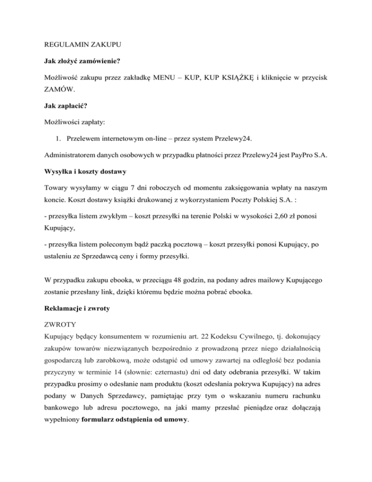 REGULAMIN ZAKUPU Jak złożyć zamówienie? Możliwość zakupu przez zakładkę MENU – KUP, KUP KSIĄŻKĘ i kliknięcie w przycisk ZAMÓW. Jak zapłacić? Możliwości zapłaty: 1. Przelewem internetowym on-line – przez system Przelewy24. Administratorem danych osobowych w przypadku płatności przez Przelewy24 jest PayPro S.A. Wysyłka i koszty dostawy Towary wysyłamy w ciągu 7 dni roboczych od momentu zaksięgowania wpłaty na naszym koncie. Koszt dostawy książki drukowanej z wykorzystaniem Poczty Polskiej S.A. : - przesyłka listem zwykłym – koszt przesyłki na terenie Polski w wysokości 2,60 zł ponosi Kupujący, - przesyłka listem poleconym bądź paczką pocztową – koszt przesyłki ponosi Kupujący, po ustaleniu ze Sprzedawcą ceny i formy przesyłki. W przypadku zakupu ebooka, w przeciągu 48 godzin, na podany adres mailowy Kupującego zostanie przesłany link, dzięki któremu będzie można pobrać ebooka. Reklamacje i zwroty ZWROTY Kupujący będący konsumentem w rozumieniu art. 22 Kodeksu Cywilnego, tj. dokonujący zakupów towarów niezwiązanych bezpośrednio z prowadzoną przez niego działalnością gospodarczą lub zarobkową, może odstąpić od umowy zawartej na odległość bez podania przyczyny w terminie 14 (słownie: czternastu) dni od daty odebrania przesyłki. W takim przypadku prosimy o odesłanie nam produktu (koszt odesłania pokrywa Kupujący) na adres podany w Danych Sprzedawcy, pamiętając przy tym o wskazaniu numeru rachunku bankowego lub adresu pocztowego, na jaki mamy przesłać pieniądze oraz dołączają wypełniony formularz odstąpienia od umowy. Prawo odstąpienia od umowy nie przysługuje w przypadku następujących towarów: - nagrań audialnych i wizualnych oraz zapisanych na nośnikach programów komputerowych, jeśli opakowanie zostało otwarte po dostarczeniu; - o właściwościach określonych przez Kupującego w Zamówieniu lub ściśle związanych z jego osobą (przykładowo książka lub gadżet z dedykacją). Zwrot w przypadku e-booków możliwy jest tylko przed użyciem przez kupującego linku umożliwiającego pobranie towaru. UWAGA! Przed zakupem plików sprawdź, czy są one obsługiwane przez urządzenie, na którym zamierzasz odczytywać publikacje elektroniczne. W przypadku e-booków brak możliwości odtworzenia pliku nie może być podstawą reklamacji. UWAGA! Kwota zwrotu będzie równa cenie zakupu towaru. Zwrot wyślemy najpóźniej w terminie 14 dni roboczych od otrzymania przez nas zwracanych towarów w stanie nienaruszonym i pozwalającym na dalszą sprzedaż wraz z informacją o numerze rachunku lub adresie na który ma być przesłany przekaz pieniężny. REKLAMACJE W przypadku stwierdzenia, że przesłany towar nie jest zgodny z zamówieniem lub posiada wady, Kupującemu przysługuje prawo reklamacji. Uprawnienia Kupującego są przewidziane w ustawie z dnia 23 kwietnia 1964 r. - Kodeks cywilny, w szczególności dotyczące umowy sprzedaży (art. 535-555 k.c.), rękojmi za wady rzeczy (art. 556-5764 k.c.), gwarancji (art. 577582 k.c.) (Dz.U. 1964, nr 16, poz. 93 ze zm.). Wątpliwości Kupującego będą dokładnie rozpatrywane, ponieważ zależy nam na utrzymaniu jak najlepszej jakości obsługi i samych produktów. Prosimy o zgłaszanie reklamacji drogą mailową pod adres [email protected] i podanie koniecznie danych Kupującego, datę wpłaty za zamówienie i opisanie zastrzeżenia oraz podanie numeru telefonu kontaktowego do Kupującego. Najpóźniej w ciągu 14 dni od dnia otrzymania wiadomości skontaktujemy się telefonicznie lub mailowo, aby zawiadomić o uznaniu lub odrzuceniu reklamacji. Jeżeli reklamacja będzie zasadna – naprawimy towar lub wymienimy towar na nowy. Jeśli nie będziemy mogli dokonać naprawy lub wymiany lub okażą się one zbyt kosztowne - zwrócimy wpłaconą cenę produktu, a także dokonamy zwrotu poniesionych kosztów przesyłki, ewentualnie obniżmy cenę za towar jeżeli będziecie chcieli go zachować i zwrócimy Wam różnicę. Szczegóły dotyczące formy i miejsca zwrotu pieniędzy ustalimy po uznaniu reklamacji. Jeżeli zakupiony towar był dostarczany przesyłką poleconą bądź paczką pocztową podczas przyjmowania przesyłki prosimy o rozpakowanie jej w obecności listonosza lub kuriera. Jeżeli w tym czasie okaże się, że towar jest uszkodzony należy sporządzić protokół szkody wraz z kurierem lub listonoszem. Najlepiej jest wykonać zdjęcia uszkodzonego towaru i razem z protokołem lub jego kopią przesłać do nas drogą mailową. Dane sprzedawcy Strona www.mojapasjamojafirma.pl prowadzona jest przez Fundację z Inicjatywą wpisaną do Krajowego Rejestru Sądowego, Rejestru Stowarzyszeń, innych organizacji społecznych i zawodowych, fundacji oraz samodzielnych publicznych zakładów opieki zdrowotnej, posiadającą adres miejsca wykonywania działalności i adres do doręczeń: ul. Polinezyjska 6/53, 02-777 Warszawa, NIP 9512391304, REGON 361309752, adres poczty elektronicznej: [email protected], numer telefonu: +48 881 244 679. Załącznik 1. Formularz odstąpienia od umowy Miejscowość………………………………………., data………………… Imię i nazwisko konsumenta Adres zamieszkania Fundacja z Inicjatywą/ Moja Pasja Moją Firmą ul. Polinezyjska 6/53 02-777 Warszawa, Polska [email protected] Oświadczenie o odstąpieniu od umowy zawartej poza lokalem przedsiębiorstwa Oświadczam, że odstępuję od umowy kupna/sprzedaży towaru (proszę wpisać nazwę towaru i format – książka/e-book) ……………………………………………….. zawartej dnia (proszę wpisać datę przelewu) ............................................... Proszę o zwrot kwoty .................. zł (słownie ...............................................................złotych) na konto nr ................................................................................................................................ Jednocześnie o