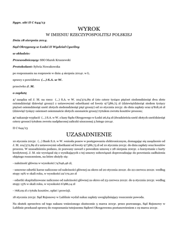 Sygn. akt II C 644/13 WYROK W IMIENIU RZECZYPOSPOLITEJ POLSKIEJ Dnia 18 sierpnia 2014. Sąd Okręgowy w Łodzi II Wydział Cywilny w składzie: Przewodniczący: SSO Marek Kruszewski Protokolant: Sylwia Nowakowska po rozpoznaniu na rozprawie w dniu 4 sierpnia 2014r. w Ł. sprawy z powództwa (...) S.A. w W. przeciwko J. M. o zapłatę 1/ zasądza od J. M. na rzecz (...) S.A. w W. 104’572,89 zł (sto cztery tysiące pięćset siedemdziesiąt dwa złote osiemdziesiąt dziewięć groszy) z ustawowymi odsetkami od kwoty 97’586,75 zł (dziewięćdziesiąt siedem tysięcy pięćset osiemdziesiąt sześć złotych siedemdziesiąt pięć groszy) od 10 stycznia 2013r. do dnia zapłaty oraz 9’818,16 zł (dziewięć tysięcy osiemset osiemnaście złotych szesnaście groszy) tytułem zwrotu kosztów procesu; 2/ nakazuje wypłacić (...) S.A. w W. z kasy Sądu Okręgowego w Łodzi 26,64 zł (dwadzieścia sześć złotych sześćdziesiąt cztery grosze) tytułem zwrotu nadpłaconej zaliczki uiszczonej 5 lutego 2014r. II C 644/13 UZASADNIENIE 10 stycznia 2013r. (...) Bank S.A. w W. wniosła pozew w postępowaniu elektronicznym, domagając się zasądzenie od J. M. 104’572,89 zł z ustawowymi odsetkami od kwoty 97’586,75 zł od 10 stycznia 2013r. do dnia zapłaty oraz kosztów procesu. W uzasadnieniu podano, że pozwany zawarł z powodem umowę z 28 sierpnia 2003r. o korzystanie z karty kredytowej. J. M. nie wywiązał się z wynikających z tej umowy zobowiązań doprowadzając do powstania zadłużenia objętego roszczeniem, na które złożyły się: - należność główna w wysokości 74’646,46 zł, - umowne odsetki karne naliczone od należności głównej za okres od 20 stycznia 2012r. do 22 czerwca 2012r. według stopy 19% w skali roku, w wysokości 22’172,20 zł - odsetki skapitalizowane naliczone od należności głównej za okres od 23 czerwca 2012r. do 9 stycznia 2013r. według stopy 13% w skali roku, w wysokości 6’986,14 zł - 768,09 zł z tytułu kosztów, opłat i prowizji. 18 stycznia 2013r. Sąd Rejonowy w Lublinie wydał nakaz zapłaty uwzględniający roszczenie powoda. Na skutek sprzeciwu od tego nakazu wniesionego skutecznie 5 marca 2013r. przez pozwanego, Sąd Rejonowy w Lublinie przekazał sprawę do rozpoznania tutejszemu Sądowi Okręgowemu postanowieniem z 19 marca 2013r. Powód podtrzymał żądanie zawarte w pozwie w całości. Pozwany wniósł o oddalenie powództwa i zasądzenie kosztów procesu według norm. W uzasadnieniu swojego stanowiska J. M. podniósł zarzut nieudowodnienia długu oparty na fakcie, iż jedynym dowodem przedstawionym przez Bank jest wyciąg z ksiąg bankowych, który nie ma waloru dokumentu urzędowego, a jedynie prywatnego. Ponadto, pozwany podniósł zarzut przedawnienia w zakresie odsetek naliczonych za okres trzech lat wstecz przed wytoczeniem powództwa. Na rozprawie w dniu 10 października 2013r. pozwany przyznał, że strony łączyła umowa rachunku do karty kredytowej, która została wypowiedziana J. M. przez Bank, jednakże nie wypowiedział się co do daty dokonania tego wypowiedzenia. Ponadto, strona pozwana potwierdziła fakt dokonywania obrotów na rachunku związanym z kartą kredytową, przedstawionych na wydrukach załączonych przez powoda do pisma złożonego w Sądzie 13 września 2013r. (k 57-81), zakwestionował wysokość zadłużenia wskazanego przez bank w złożonym do sprawy wyciągu z ksiąg, potwierdził, że istnieje zadłużenie pozwanego względem powoda, jednakże nie potrafił określić wysokości tego długu. Stan faktyczny: 28 sierpnia 2003r. między (...) Bank S.A. w W. i J. M. została zawarta umowa mocą której pozwanemu wydano kartę kredytową systemu VISA uprawniająca do dysponowania środkami udostępnionymi przez Bank w postaci kredytu do kwoty 70’000,00 zł. Kredyt został oprocentowany według zmiennej stopy procentowej szczegółowo opisanej co do zasad naliczania i zmiany w Regulaminie, która w dniu zawarcia umowy wynosiła 23% w stosunku rocznym. Zgodnie z Regulaminem wydawania i korzystania z kart kredytowych, będącym załącznikiem do tej umowy, wszystkie transakcje dokonywane przy użyciu karty kredytowej rozliczane były w cyklach miesięcznych, których końcowy termin został określony przez posiadacza karty na 23 dzień każdego miesiąca. Posiadacz rachunku związanego z kartą kredytową zobowiązał się dokonywać spłaty kwoty nie mniejszej niż minimalna kwota spłaty podana w wyciągu sporządzanym na koniec każdego cyklu rozliczeniowego, w terminie podanym w tym wyciągu. W przypadku braku takiej spłaty w określonym terminie Bank był uprawniony do wypowiedzenia umowy oraz odzyskania swoich wierzytelności przez zaliczenie na jej poczet każdej wpłaty dokonywanej na rachunek posiadacza karty. Kwota przeterminowanego zadłużenia podlegała zwiększeniu o odsetki od należności przeterminowanych w przypadku wypowiedzenia umowy karty kredytowej. Stopa ta wynosiła w 2012r. 19% w stosunku rocznym. Bank był uprawniony do obciążania rachunku posiadacza karty kwotą wszystkich transakcji dokonanych przy użyciu tej karty, opłatami i prowizjami związanymi z wykorzystaniem kredytu, opłatami i prowizjami związanymi z użyciem karty oraz korzystaniem z usług dodatkowych oraz odsetkami z tytułu wykorzystania kredytu. Posiadacz karty był uprawniony do złożenia reklamacji obciążeń uwidocznionych w comiesięcznych wyciągach. / umowa wraz z wnioskiem o jej zawarcie – k 20-21, regulaminy wydawania i używania kart kredytowych – k 180 / W okresie od 5 września 2003r. do 29 lipca 2010r. J. M. dokonał szeregu transakcji przy użyciu karty wydanej mu przez powodowy Bank. W wyniku tego na rachunku pozwanego powstało zadłużenie z tytułu kredytu, odsetek, opłat i prowizji, wynoszące na dzień 18 stycznia 2012r. kwotę 90’301,05 zł. / wyciąg z rachunku pozwanego – k 57-81 oraz 93-105, opinia biegłej z zakresu księgowości – k 143-167 / J. M. 