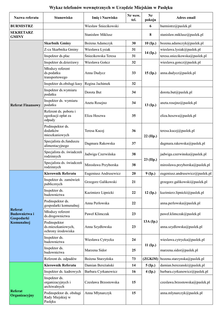 Wykaz telefonów wewnętrznych w Urzędzie Miejskim w Pasłęku Nazwa referatu Stanowisko Imię i Nazwisko Nr wew. tel. Nr pokoju Adres email BURMISTRZ Wiesław Śniecikowski 6 [email protected] SEKRETARZ GMINY Stanisław Miklusz 8 [email protected] 10 (Ip.) [email protected] Skarbnik Gminy Bożena Adamczyk 30 Z-ca Skarbnika Gminy Wiesława Łysiak 31 Inspektor ds.płac Śniecikowska Teresa 31 Inspektor ds.dzierżawy Wiesława Gończ 32 Młodszy referent ds.podatku transportowego Anna Dudycz 33 Referat Organizacyjny [email protected] [email protected] [email protected] 15 (Ip.) [email protected] Inspektor ds.obsługi kasy Regina Jachimek 32 Inspektor ds.wymiaru podatku Dorota But 34 Aneta Rosejno 34 Referent ds. poboru i egzekucji opłat za odpady Eliza Hoszwa 35 [email protected] Podinspektor ds. dodatków mieszkaniowych Teresa Kucej 36 [email protected] Specjalista ds.funduszu alimentacyjnego Dagmara Rakowska 37 Specjalista ds. świadczeń Jadwiga Czerwińska rodzinnych 38 Specjalista ds. świadczeń Mirosława Przyborska rodzinnych 38 Kierownik Referatu Eugeniusz Andrusewicz 20 Inspektor ds. zamówień publicznych Grzegorz Galikowski 21 Inspektor ds. budownictwa Kazimierz Lipnicki 22 Podinspektor ds. gospodarki komunalnej Anna Perłowska 22 [email protected] Młodszy referent ds.drogownictwa Paweł Klimczak 23 [email protected] Podinspektor ds.mieszkaniowych, ochrony środowiska Anna Szydłowska 23 [email protected] Inspektor ds. budownictwa Wiesława Cytrycka 24 [email protected] Inspektor ds. budownictwa Marzena Sidor 25 Referent ds. odpadów Bożena Starzyńska 73 Kierownik Referatu Damian Bereżański 14 5 (Ip.) [email protected] Inspektor ds. kadrowych Barbara Cyrkanowicz 16 4 (Ip.) [email protected] Inspektor ds. organizacyjnych i archiwalnych Czesława Brzostowska 15 [email protected] Anna Młynarczyk 15 [email protected] Inspektor ds. wymiaru Referat Finansowy podatku Referat Budownictwa i Gospodarki Komunalnej 14 (Ip.) Podinspektor ds. obsługi Rady Miejskiej w Pasłęku [email protected] 13 (Ip.) [email protected] 22 (IIp.) [email protected] [email protected] 23 (IIp.) [email protected] 9 (Ip.) [email protected] [email protected] 12 (Ip.) [email protected] 13A (Ip.) 11 (Ip.) [email protected] (ZGKiM) [email protected] Referat Organizacyjny Referat Spraw Obywatelskich Inspektor ds. informatyki Marcin Andrusewicz 18 Sekretarka ds. obsługi sekretariatu 11 Młodszy referent ds.obsługi sekretariatu Diana Stefanowska Urząd Stanu Cywilnego Radcy Prawni [email protected] 7 (Ip.) Magdalena Strzelecka Biuro Obsługi Interesanta 10 [email protected] 17 PARTER 26 (IIp.) [email protected] Kierownik Referatu Patryk Kwieciński 40 Młodszy referent ds. dowodów osobistych Joanna Pielech 42 Podinspektor ds. ewidencji ludności Joanna Gliniewicz 41 Strażnik Miejski Jörgen Hinz 43 Strażnik Miejski Jerzy Kulon 43 Strażnik Miejski Jerzy Oryl 43 Strażnik Miejski Tadeusz Zarudzki 43 Strażnik Miejski Sławomir Stando 43 Kierownik Referatu Piotr Szczepkowski 50 [email protected] 28 (IIp.) Referent ds. oświaty Joanna Łopacka Referat Edukacji, Promocji i Rozwoju Podinspektor Jolanta Stankiewicz ds.stypendiów Gminy Podinspektor ds. Małgorzata Krasińska działalności gospodarczej Referat Rolnictwa i Gospodarki Gruntami 30 (IIp.) [email protected] 50 [email protected] 29 (IIp.) [email protected] 25 (IIp.) 52 [email protected] [email protected] [email protected] 21 (IIp.) 51 [email protected] [email protected] Kierownik Referatu Grzegorz Orłowski 60 Podinspektor ds. rolnictwa i geodezji Eugeniusz Ośka 61 Inspektor ds.rolnictwa i wycinki drzew Deonizy Krasiński 61 Inspektor ds. sprzedaży nieruchomości Irena Misiun 62 17 (IIp.) [email protected] Kierownik USC Andrzej Pągowski 70 Z-ca Kierownika USC Agnieszka Pawłowska 70 [email protected] 2 PARTER [email protected] Radca prawny Jolanta Skuratowicz 54 Radca prawny Andrzej Korzeniowski 54 20 (IIp.) [email protected] [email protected] 24 (IIp.)