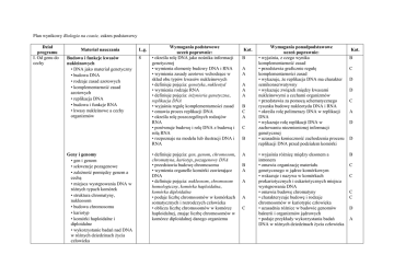 Plan wynikowy Biologia na czasie, zakres podstawowy Dział programu I. Od genu do cechy Materiał nauczania Budowa i funkcje kwasów nukleinowych • DNA jako materiał genetyczny • budowa DNA • rodzaje zasad azotowych • komplementarność zasad azotowych • replikacja DNA • budowa i funkcje RNA • kwasy nukleinowe a cechy organizmów Geny i genomy • gen i genom • sekwencje pozagenowe • zależność pomiędzy genem a cechą • miejsca występowania DNA w różnych typach komórek • struktura chromatyny, nukleosom • budowa chromosomu • kariotyp • komórki haploidalne i diploidalne • wykorzystanie badań nad DNA w różnych dziedzinach życia człowieka L.g. 8 Wymagania podstawowe uczeń poprawnie: • określa rolę DNA jako nośnika informacji genetycznej • wymienia elementy budowy DNA i RNA • wymienia zasady azotowe wchodzące w skład obu typów kwasów nukleinowych • definiuje pojęcia: genetyka, nukleotyd • wymienia rodzaje RNA • definiuje pojęcia: inżynieria genetyczna, replikacja DNA • wyjaśnia regułę komplementarności zasad • omawia proces replikacji DNA • określa rolę poszczególnych rodzajów RNA • porównuje budowę i rolę DNA z budową i rolą RNA • rozpoznaje na modelu lub ilustracji DNA i RNA • definiuje pojęcia: gen, genom, chromosom, chromatyna, kariotyp, pozagenowy DNA • przedstawia budowę chromosomu • wymienia organelle komórki zawierające DNA • definiuje pojęcia: nukleosom, chromosom homologiczny, komórka haploidalna, komórka diploidalna • podaje liczbę chromosomów w komórkach somatycznych i rozrodczych człowieka • oblicza liczbę chromosomów w komórce haploidalnej, znając liczbę chromosomów w komórce diploidalnej danego organizmu Kat. B A A A A A B C A C B A B A A A C Wymagania ponadpodstawowe uczeń poprawnie: • wyjaśnia, z czego wynika komplementarność zasad • przedstawia graficznie regułę komplementarności zasad • wykazuje, że replikacja DNA ma charakter semikonserwatywny • wykazuje związek między kwasami nukleinowymi a cechami organizmów • przedstawia za pomocą schematycznego rysunku budowę nukleotydu DNA i RNA • określa rolę polimerazy DNA w replikacji DNA • wykazuje rolę replikacji DNA w zachowaniu niezmienionej informacji genetycznej • uzasadnia konieczność zachodzenia procesu replikacji DNA przed podziałem komórki • wyjaśnia różnicę między eksonem a intronem • omawia organizację materiału genetycznego w jądrze komórkowym • wskazuje i nazywa w komórkach prokariotycznych i eukariotycznych miejsca występowania DNA • omawia budowę chromatyny • charakteryzuje budowę i rodzaje chromosomów w kariotypie człowieka • uzasadnia różnice w budowie genomów bakterii i organizmów jądrowych • podaje przykłady wykorzystania badań DNA w różnych dziedzinach życia człowieka Kat. B C D D C A D D B C C C C D A Kod genetyczny • sposób zapisu informacji genetycznej w DNA • właściwości kodu genetycznego • znaczenie kodu genetycznego • definiuje pojęcia: kod genetyczny, kodon • wymienia cechy kodu genetycznego • omawia sposób zapisania informacji genetycznej w DNA • wyjaśnia znaczenie kodu genetycznego • charakteryzuje cechy kodu genetycznego Ekspresja genów • etapy realizacji informacji genetycznej • transkrypcja • translacja • ekspresja genów w różnych typach komórek • modyfikacja białka po zakończeniu translacji • związek między przestrzenną strukturą białka a pełnioną przez nie funkcją • wymienia etapy ekspresji genów • określa cel transkrypcji i translacji • omawia poszczególne etapy transkrypcji i translacji • wyjaśnia rolę tRNA w translacji • rozróżnia etapy ekspresji genów Podstawowe reguły dziedziczenia genów • zależność między genotypem a fenotypem • allele jako różne wersje genu • dominacja i recesywność alleli • homozygoty i heterozygoty • cechy dominujące i recesywne • definiuje pojęcia: genotyp, fenotyp, allel, homozygota, heterozygota, dominacja, recesywność • wymienia i rozpoznaje cechy dominujące i recesywne u ludzi • zapisuje genotypy: homozygoty dominującej, homozygoty recesywnej i heterozygoty • wykazuje zależność między genotypem a B A C B C A B C B B A A C D • analizuje schemat przepływu informacji genetycznej • odczytuje kolejność aminokwasów kodowanych przez dany fragment mRNA przy pomocy tabeli kodu genetycznego • nazywa cechy kodu genetycznego na podstawie schematów • oblicza liczbę nukleotydów i kodonów kodujących określoną liczbę aminokwasów oraz liczbę aminokwasów kodowaną przez określoną liczbę nukleotydów i kodonów • zapisuje sekwencję nukleotydów mRNA oraz sekwencję kodującej nici DNA, znając skład aminokwasowy krótkiego odcinka białka • wskazuje i nazywa poszczególne etapy ekspresji genów w komórce • określa znaczenie struktury przestrzennej dla funkcjonalności białek • omawia budowę cząsteczki tRNA • omawia rolę rybosomów w ekspresji genu • uzasadnia konieczność modyfikacji białka po translacji • omawia różnicę w ekspresji genów kodujących RNA i białka • omawia rolę polimerazy RNA w transkrypcji D • omawia badania Mendla • wyjaśnia mechanizm dziedziczenia cech zgodnie z I i II prawem Mendla • wykonuje krzyżówki genetyczne dotyczące dziedziczenia dwóch genów • interpretuje krzyżówki genetyczne, używając określeń: homozygota, heterozygota, cecha dominująca, cecha recesywna C B C B C C B B C C D C C C C u człowieka • badania Mendla • reguły dziedziczenia – prawo czystości gamet • reguły dziedziczenia – prawo niezależnej segregacji cech • przykłady dziedziczenia cech u ludzi • przykłady innych sposobów dziedziczenia cech fenotypem • omawia I i II prawo Mendla • na schemacie krzyżówki genetycznej rozpoznaje genotyp oraz określa fenotyp rodziców i pokolenia potomnego • wykonu