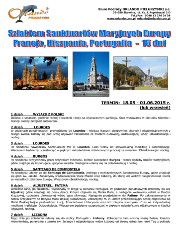 Biuro Podróży ORLANDO PIELGRZYMKI s.c. 32-050 Skawina, ul. Ks. J. Popiełuszki 2 D Tel./Fax: 0048 12 276 24 39 www.orlando.com.pl, [email protected] TERMIN: 18.05 - 01.06.2015 r. (lub wrzesień) 1 dzień WYJAZD Z POLSKI Zbiórka o ustalonej godzinie rannej (wcześnie rano) na wyznaczonym parkingu. Stąd wyruszamy w kierunku Niemiec i Francji. Nocny przejazd autokarem. 2 dzień LOURDES W godzinach południowych przyjedziemy do Lourdes - miejsca licznych pielgrzymek chorych i niepełnosprawnych z całego świata. Udamy się pod Grotę objawień Massabielle ze źródłem cudownej, uzdrawiającej wody. Obiadokolacja i nocleg. 3 dzień LOURDES Po śniadaniu nawiedzimy Sanktuarium MB w Lourdes. Czas wolny na indywidualną modlitwę i kontemplację. Wieczorem będziemy uczestniczyć w pięknym nabożeństwie różańcowym i procesji ze świecami. Obiadokolacja i nocleg. 4 dzień BURGOS Po śniadaniu przejedziemy przez terytorium Hiszpanii, krótkie zwiedzanie Burgos - starej siedziby Królów Kastylijskich, gdzie znajduje się imponująca, gotycka katedra. Następnie udamy się na obiadokolację i nocleg. 5 dzień SANTIAGO DE COMPOSTELA 6 dzień ALJUSTREL, FATIMA 7 dzień LIZBONA Po śniadaniu udamy się do Santiago de Compostela, jednego z najważniejszych Sanktuariów Europy, gdzie znajduje się grób św. Jakuba. Zobaczymy średniowieczne Stare Miasto oraz Katedrę, do której od wieków pielgrzymowali wierni ze wszystkich zakątków Europy. Wieczorem obiadokolacja, nocleg. Wcześnie rano, po śniadaniu, wyruszymy w drogę w kierunku Portugalii. W godzinach południowych dotrzemy do wsi Aljustrel, gdzie znajdują się domy dzieci, którym objawiła się Matka Boża, a następnie weźmiemy udział w Drodze Krzyżowej, cudownie ulokowanej wśród gaju oliwnego. Następnie przejedziemy do Fatimy. Po zakwaterowaniu w hotelu przejdziemy do Bazyliki Matki Boskiej Różańcowej. Zobaczymy m. in. ołtarz przedstawiający scenę objawienia się Matki Boskiej trójce pastuszków: Łucji, Franciszkowi i Hiacyncie oraz ich miejsca spoczynku. Czas na indywidualną modlitwę i refleksję. Obiadokolacja. Wieczorem będziemy uczestniczyć w pięknym nabożeństwie różańcowym w Kaplicy Objawień. Nocleg. Tego dnia po śniadaniu udamy się do stolicy Portugalii - Lizbony. Zobaczymy tam słynną wieżę Belem, klasztor Hieronimitów, panoramę z zamku św. Jerzego i najpiękniejszy widok Lizbony od strony estuarium rzeki Tag z pokładu statku. W godzinach wieczornych powrócimy do hotelu na obiadokolacja i nocleg. 8 dzień BATALHA, NAZARE 9 dzień MADRYT 10 dzień MONTSERRAT, COSTA BRAVA Około południa udamy się do Batalhi by zwiedzić Klasztor Santa Maria da Vitoria, pochodzący z XIV wieku. Jest to arcydzieło portugalskiego gotyku, uznane przez UNESCO za światowe dziedzictwo kultury. Następnie przejedziemy do miejscowości Nazare - odpoczynek nad Oceanem Atlantyckim. Powrót do hotelu na obiadokolacja, nocleg. Po śniadaniu przejedziemy do Madrytu, od XVI w. stolicy Hiszpanii. Spacer po centrum miasta: Plaza Mayor, Katedra, Pałac Królewski. Wieczorem przejedziemy do hotelu na obiadokolację, nocleg. Wcześnie rano, po śniadaniu wyruszymy w kierunku Katalonii na wzgórze Montserrat, do miejsca gdzie czczona jest niewielka figurka Madonny, nazwana La Morenta. Wieczorem dotrzemy do Hotelu zlokalizowanego na hiszpańskim wybrzeżu Costa Brava. Zakwaterowanie w Hotelu, obiadokolacja, Nocleg. 11 dzień WYPOCZYNEK - COSTA BRAVA Całodniowy wypoczynek w uroczej nadmorskiej miejscowości na Wybrzeżu Costa Brava. Plażowanie, czas wolny. Możliwość kąpieli w morzu lub w basenie hotelowym. Śniadanie i obiadokolacja w hotelu. Nocleg. 12 dzień BARCELONA Rano, po śniadaniu przejedziemy do Barcelony. Zwiedzimy Barcelonę stolicę Katalonii, w której tworzył swe dzieła niepowtarzalny artysta - Gaudi, zobaczymy więc Park Guell oraz słynną Sagradę Familię a także najpiękniejszą ulicę świata - Las Ramblas i w miarę możliwości Oceanarium, następnie przejdziemy do Dzielnicy Gotyckiej ponad którą góruje Katedra św. Eulalii. Następnie powrócimy do Hotelu. Obiadokolacja. Nocleg. 13 dzień LA SALETTE 14 dzień LA SALETTE Rano, po śniadaniu wyjazd z Costa Brava w kierunku Francji. W godzinach popołudniowych przyjazd do La Salette, gdzie nawiedzimy Sanktuarium Maryjne. Msza Św. Zakwaterowanie w hotelu, kolacja i nocleg. Rano, po śniadaniu ponownie nawiedzimy Sanktuarium Maryjne w La Salette. Msza Św. Czas wolny na indywidualną modlitwę. W godzinach popołudniowych wyruszymy w drogę powrotną do Polski. Nocny przejazd autokarem. 15 dzień POWRÓT DO POLSKI Powrót do Polski w godzinach południowych. CENA: 3250 zł/osoby CENA ZAWIERA: PRZEJAZD KOMFORTOWYM AUTOKAREM 12 NOCLEGÓW W HOTELACH **/*** WYŻYWIENIE 2 RAZY DZIENNIE (12 śniadań, 12 obiadokolacji) UBEZPIECZENIE NW + KL OPIEKA DOŚWIADCZONEGO PILOTA PODATEK VAT. CENA NIE ZAWIERA: BILETÓW WSTĘPÓW DO ZWIEDZANYCH OBIEKTÓW, PRZEWODNIKÓW LOKALNYCH, PRZEJAZDÓW KOMUNIKACJĄ MIEJSKĄ itp. (około 90 euro/osoby – płatne u pilota w autokarze), napojów do obiadokolacji, świadczeń niewymienionych w ofercie. Cena została skalkulowana dla grupy min. 44 osób płatnych. B.P. ORLANDO PIELGRZYMKI ZASTRZEGA SOBIE MOŻLIWOŚĆ ZMIANY KOLEJNOŚCI ZWIEDZANYCH OBIEKTÓW.