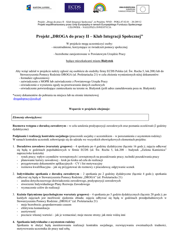 Projekt: „Droga do pracy II – Klub Integracji Społecznej”, nr Projektu: WND – POKL.07.02.01 – 20-289/12 Projekt współfinansowany przez Unię Europejską w ramach Europejskiego Funduszu Społecznego CZŁOWIEK – NAJLEPSZA INWESTYCJA Projekt „DROGA do pracy II – Klub Integracji Społecznej” W projekcie mogą uczestniczyć osoby: - niezatrudnione, korzystające ze świadczeń pomocy społecznej i - bezrobotne zarejestrowane w Powiatowym Urzędzie Pracy będące mieszkańcami miasta Białystok Aby wziąć udział w projekcie należy zgłosić się osobiście do siedziby firmy ECDS Polska (ul. Św. Rocha 5, lok.208) lub do Stowarzyszenia Pomocy Rodzinie DROGA (ul. Proletariacka 21) w celu złożenia wymienionych niżej dokumentów: - formularz zgłoszeniowy - zaświadczenie z MOPR lub zaświadczenie z Powiatowego Urzędu Pracy - oświadczenie o wyrażeniu zgody na przetwarzanie danych osobowych - oświadczenie potwierdzające zamieszkanie na terenie m. Białystok (jeśli adres zameldowania poza m. Białystok) *wzory dokumentów do pobrania na miejscu lub na stronie internetowej [email protected] Wsparcie w projekcie obejmuje: Elementy obowiązkowe: Rozmowa wstępna z doradcą zawodowym – w celu ustalenia predyspozycji zawodowych oraz poznania oczekiwań (2 godziny dydaktyczne) Podpisanie i realizację kontraktu socjalnego (pracownik socjalny z uczestnikiem – w porozumieniu z asystentem rodziny) W ramach kontraktu uczestnik zobowiązuje się do udziału we wszystkich obowiązkowych elementach projektu: 1. Doradztwo zawodowe (warsztaty grupowe) – 4 spotkania po 4 godziny dydaktyczne (łącznie 16 godz.); zajęcia odbywać się będą w godzinach popołudniowych w firmie ECDS (ul. Św. Rocha 5, lok.208 – budynek „Zielona Kamienica” naprzeciwko kościoła) - rynek pracy; wpływ czynników wewnętrznych i zewnętrznych na poszukiwanie pracy; techniki poszukiwania pracy - planowanie kariery zawodowej – krok po kroku od celu do realizacji - przygotowanie dokumentów aplikacyjnych – CV i list motywacyjny - rozmowa kwalifikacyjna – jak się przygotować do rozmowy z pracodawcą; odgrywanie scenek 2. Indywidualne spotkania z doradcą zawodowym – 2 spotkania po 2 godziny dydaktyczne (łącznie 4 godz.); spotkania odbywać się będą w Stowarzyszeniu Pomocy Rodzinie „DROGA” (ul. Proletariacka 21) - analiza dotychczasowego doświadczenia zawodowego, predyspozycji zawodowych - stworzenie Indywidualnego Plany Rozwoju Zawodowego - wyznaczenie celów do realizacji 3. Kuźnia Optymizmu (psychologiczne warsztaty grupowe) – 4 spotkania po 5 godzin dydaktycznych (łącznie 20 godz.); po każdych zajęciach jest możliwość zjedzenia obiadu; zajęcia odbywać się będą w godzinach przedpołudniowych w Stowarzyszeniu Pomocy Rodzinie „DROGA” (ul. Proletariacka 21) - moje bezrobocie; gospodarowanie czasem - efektywna komunikacja - asertywność - poczucie własnej wartości – jak je wzmacniać; moje mocne strony; jak mnie widzą inni 4. Spotkania indywidualne z asystentem rodziny Spotkania te służyć będą monitorowaniu realizacji kontraktu socjalnego, rozwiązywaniu ewentualnych trudności, motywowaniu uczestnika do pracy nad sobą. Projekt: „Droga do pracy II – Klub Integracji Społecznej”, nr Projektu: WND – POKL.07.02.01 – 20-289/12 Projekt współfinansowany przez Unię Europejską w ramach Europejskiego Funduszu Społecznego CZŁOWIEK – NAJLEPSZA INWESTYCJA Elementy nieobowiązkowe: Szkolenia podnoszące umiejętności i kwalifikacje (ustalone na spotkaniach indywidualnych z doradcą zawodowym – w ramach bonu szkoleniowego przeznaczonego dla każdego uczestnika projektu) Do wyboru spośród następujących szkoleń: 1. Asystent ds. księgowości 2. Pomoc kuchenna 3. Sprzedawca w branży spożywczej z modułem komputerowym 4. Operator koparko-ładowarki 5. Kierowca operator wózków jezdniowych 6. Elektromonter urządzeń elektroenergetycznych 7. Opiekunka środowiskowa 8. Sprzedawca z modułem komputerowym 9. Pracownik obsługi biurowej z modułem komputerowym 10. Fryzjer 11. Kosmetyczka / wizażystka Staże zawodu W ramach Projektu przewidziane są staże dla uczestników i uczestniczek. Staż – to zdobycie umiejętności i doświadczeń w wybranym zawodzie; odbywane będą u pracodawców, którzy wyrażą zgodę na przyjęcie uczestników projektu - czas pracy: średnio 6 godz. dziennie (od 3 do 6 miesięcy) - w okresie odbywania stażu stażyście przysługuje stypendium (wypłacane przez firmę ECDS w ramach projektu) - na wniosek odbywającego staż pracodawca jest zobowiązany do udzielenia dni wolnych w wymiarze 2 dni za każde 30 dni kalendarzowych odbywania stażu; za dni wolne przysługuje stypendium - w okresie odbywania stażu zapewnione są bilety miesięczne, ubezpieczenie, książeczka zdrowia. Konsultacje indywidualne ze specjalistami – psychologiem, pedagogiem, doradcą zawodowym, mediatorem, prawnikiem Odbywać się będą w Stowarzyszeniu Pomocy Rodzinie „DROGA” (ul. Proletariacka 21); wcześniej należy zgłosić chęć udziału w konsultacjach i uzgodnić termin Grupy wsparcia Spotkania grupowe zmierzające do podniesienia samooceny i samoświadomości. Prowadzenie „Centrum Darów” Samopomoc lokalna na rzecz osób potrzebujących (w tym uczestników projektu) poprzez przekazywanie darów od ludzi dla ludzi, udzielanie pomocy i wsparcia – w tym w formie odzieży, żywności, sprzętu AGD, mebli, obuwia. Opiekę nad dziećmi od 3 do 10 lat (w godzinach uczestnictwa rodzica w projekcie) Dane kontaktowe i teleadresowe realizatorów projektu: Lider: Partner: ECDS Polska Sp. z o.o. ul. Św. Rocha 5, lok.208 15-879 Białystok tel. fax. (85) 744 39 35 e-mail: [email protected] Stowarzyszenie Pomocy Rodzinie „ DROGA” Białystok, ul. Proletariacka 21 tel. (85) 67-56-411 e-mail: [email protected] (z dopiskiem w temacie – projekt) Strony internetowe: www.ecds.pl www.stowarzyszeniedroga.pl