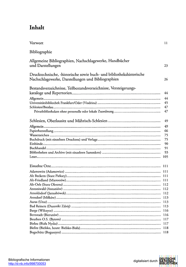 Inhalt Vorwort 11 Bibliographie Allgemeine Bibliographien, Nachschlagewerke, Handbücher und Darstellungen 23 Drucktechnische, -historische sowie buch- und bibliothekshistorische Nachschlagewerke, Darstellungen und Bibliographien 26 Bestandsverzeichnisse, Teilbestandsverzeichnisse, Versteigerungskataloge und Repertorien 44 Allgemein Universitätsbibliothek Frankfurt/Oder (Viadrina) Schlesien/Breslau Privatbibliotheken ohne personelle oder lokale Zuordnung 44 45 47 47 Schlesien, Oberlausitz und Mährisch-Schlesien 49 Allgemein Papierherstellung Wasserzeichen Buchdruck (mit einzelnen Druckern) und Verlage Einbände.: Buchhandel Bibliotheken und Archive (mit einzelnen Sammlern) Leser 49 66 75 75 90 91 93 105 Einzelne O r t e 111 Adamowitz (Adamowice) Alt Beckern (Stare Piekary) Alt-Friedland (Mieroszów) Alt-Oels (Stara Oleszna) Antoniwald (Antoniów) Arnoldsdorf (Jarnohowek) Arnsdorf(MiHców) Auras (Uraz) Bad Reinerz (Duszniki Zdrój) Barge (Wilczyce) Bernstadt (Bierutów) Beuthen O.S. (Bytom) Bielau (Biata Nyska) Bielitz (Bielsko, heute: Bielsko-Biala) Bogschütz (Boguszyce) 111 111 Ill 112 112 112 113 113 113 116 116 117 117 118 118 Bibliografische Informationen http://d-nb.info/998700053 digitalisiert durch 6 Inhalt Breslau (Wrociaw) Allgemein Papierherstellung Buchdruck (mit einzelnen Druckern) Allgemein Drucker der Sermones Leos I Elyan, Kaspar Baumgarten, Konrad Dyon, Adam Libisch, Kaspar Winkler, Andreas Logau, Georg von Scharffenberg, Familie Scharffenberg, Crispin Scharffenberg, Johann Baumann, Familie Baumann d. Ä., Georg Baumann d. J., Georg und Baumanns Erben Fellgiebel, Esaias Seidel, Georg Korn, Familie und Firma Grass, Barth & Comp Einbände Buchhandel Allgemein Grass, Carl Wilhelm Korn Bibliotheken und Archive (mit einzelnen Sammlern) Allgemein Domkapitel St. Elisabeth/Elisabeth-Gymnasium (Rehdiger'sche Bibliothek) St. Maria Magdalena/Maria-Magdalena-Gymnasium St. Bernhardin St. Christoph St. Dorothea St.Vincenz Corpus-Christi-Kirche Dominikanerkloster Jesuitenkolleg Priesterseminar und Päpstlich Theologische Fakultät Jüdisch-theologisches Seminar Verein „Jüdisches Museum Breslau" Jüdisches Gemeindearchiv Stadtbibliothek Stadtarchiv Staatsarchiv (Archiwum Panstwowe we Wroclawiu) Königliche Universitätsbibliothek/Staats- und Universitätsblibliothek/ Biblioteka Uniwersytecka ZaWad Narodowy im. Ossoliñskich Biblioteka (Ossolineum) Schlesische Gesellschaft für vaterländische Kultur Königliches Friedrichs-Gymnasium Leseanstalten von Karl Konrad Streit Leihbibliothek von Johann Gottlieb Adolph Schleyermacher jjg Hg J21 122 122 I33 I35 141 I47 I50 I5I 152 152 152 154 154 I56 157 158 159 159 166 168 170 170 172 173 173 173 178 181 188 203 207 207 208 208 208 209 210 211 211 212 212 216 217 217 232 233 234 234 236 Inhalt Leihbibliothek von Ernst Gabriel Woltersdorf Leihbibliothek von Carl Philipp Brämer Bibliotheken einzelner Besitzer Leser Brieg(Brzeg) Papierherstellung Buchdruck (mit einzelnen Druckern) Einbände Buchhandel Bibliotheken und Archive (mit einzelnen Sammlern) St. Nicolai Jesuitenbibliothek Piastenbibliothek Tschirschky, Carl Siegmund Leser Buckowine (Bukowina Sycowska) Bunzlau (Bolestawiec) Buschvorwerk (Krzaczyna, heute zu Kowary) Czarnowanz (Czarnowa^y) Dieban (Dziewin) Domanze (Domanice) Dyhernfurth (Brzeg Dolny) Egelsdorf (Mroczkowice) Eichberg (Dabrowica) Frankenstein (Z^bkowice Slaskie) Freiwaldau (Frywaldov, jetzt Jesenik) Friedeck (Frydek, jetzt Frydek-Mistek) Friedland (Frydland nad Moravia', jetzt Bridlicná) Fürstenstein, Schloß (Zamek Ksi^z) Giersdorf (Podgórzyn) Gleiwitz (Gliwice) Glatz (Ktodzko) Glogau (Gtogów) Görlitz (Zgorzelec) Papierherstellung Buchdruck (mit einzelnen Druckern) Allgemein Scharffenberg, Crispin Fritsch, Ambrosius Rambau, Johannes Zipper d. Ä., Christoph Zipper, Jakob Einbände Buchhandel Bibliotheken und Archive (mit einzelnen Sammlern) Allgemein St. Peter und Paul Milich, Johann Gottlieb Gymnasium Oberlausitzische Gesellschaft der Wissenschaften Armenbibliothek Bibliotheken einzelner Besitzer GohlsdorfíGoíocin) 7 236 236 237 275 279 279 279 281 281 281 281 281 282 288 288 289 289 290 290 290 291 291 297 297 297 298 298 299 299 301 301 302 303 306 306 307 307 309 310 311 311 312 312 313 313 313 314 314 323 323 328 328 330 8 Inhalt Goldberg (Zfotoryja) Goschütz (Goszcz) Gräflich Hernsdorf (Lçczyna) Grätz (Hradec nad Moravici) Greifenberg (Gryfów Slaski) Groß Wartenberg (Syców) Grünberg (Zielona Gòra) Grüssau (Krzeszów) Guhrau (Gòra) Heinrichau (Henryków) Heinzendorf (Hyncice) Hermannsdorf (Jerzmanowo, jetzt zu Wrodaw) Herrndorf (Zukowice) Hirschberg (Jelenia Gòra) Hruschau (Hrusov nad Jizerou) Hundsfeld (Psie Pole, jetzt zu Wrodaw) Jägerndorf (Krnov) Jakobine (Jakubowice) Jakobskirche (Jakubów) Jakobswalde (Kotlarnia) Jannowitz (Janowice Wielkie) Jauer (Jawor) Jungferndorf (Kobylá nad Vidnavkou) Karlstal (Karlovice) Kattowitz (Katowice) Klein-Eulau (Itawka, jetzt zu Szprotawa) Klitschdorf (Kliczków) Kneja (Knieja) Königshütte (Chorzów) Königswille (Królewska Wola) Kosemitz (Kozmice) Krampe (Krçpa) Kreuzburg (Kluczbork) Kroischwitz (Kraszowice) Landeshut (Kamienna Gora) Lauban (Lubarì) Lauterbach (Mh/nów, jetzt zu Przemków) Leubus (Lubiaz) Liegnitz (Legnica) Papierherstellung Buchdruck (mit einzelnen Druckern) Allgemein Simprecht Sorg gen. Froschauer Schneider, Nikolaus Buchhandel Bibliotheken und Archive (mit einzelnen Sammlern) St. Peter und Paul St. Johann, Ritterakademie Städtisches Evangelisches Gymnasium Bibliotheken einzelner Besitzer Lobris (Luboradz) Löwenberg (Lwówek Slaski) Lorzendorf (Przysiólek Wawrzyrícowski) 331 332 332 332 333 334 334 335 336 336 337 337 338 338 342 342 342 343 343 343 344 344 345 345 346 348 348 348 349 349 349 349 350 351 351 352 355 355 356 356 356 356 359 359 360 361 361 364 367 368 369 371 372 Inhalt Marklissa (Lesna) Mazanzendorf (Mazañcowice) Medzibor (Miçdzybôrz) Meffersdorf(Uniecice) Messendorf (Mezina) Michelsdorf (Miszkowice) Muskau 