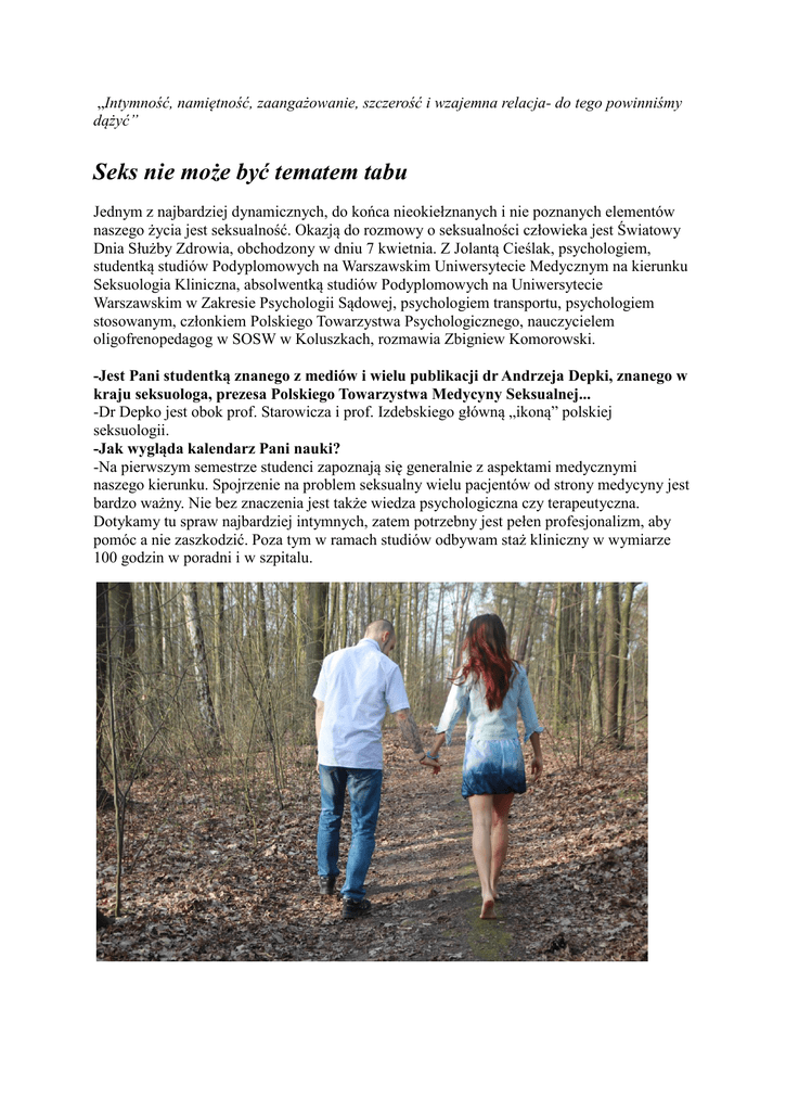 „Intymność, namiętność, zaangażowanie, szczerość i wzajemna relacja- do tego powinniśmy dążyć” Seks nie może być tematem tabu Jednym z najbardziej dynamicznych, do końca nieokiełznanych i nie poznanych elementów naszego życia jest seksualność. Okazją do rozmowy o seksualności człowieka jest Światowy Dnia Służby Zdrowia, obchodzony w dniu 7 kwietnia. Z Jolantą Cieślak, psychologiem, studentką studiów Podyplomowych na Warszawskim Uniwersytecie Medycznym na kierunku Seksuologia Kliniczna, absolwentką studiów Podyplomowych na Uniwersytecie Warszawskim w Zakresie Psychologii Sądowej, psychologiem transportu, psychologiem stosowanym, członkiem Polskiego Towarzystwa Psychologicznego, nauczycielem oligofrenopedagog w SOSW w Koluszkach, rozmawia Zbigniew Komorowski. -Jest Pani studentką znanego z mediów i wielu publikacji dr Andrzeja Depki, znanego w kraju seksuologa, prezesa Polskiego Towarzystwa Medycyny Seksualnej... -Dr Depko jest obok prof. Starowicza i prof. Izdebskiego główną „ikoną” polskiej seksuologii. -Jak wygląda kalendarz Pani nauki? -Na pierwszym semestrze studenci zapoznają się generalnie z aspektami medycznymi naszego kierunku. Spojrzenie na problem seksualny wielu pacjentów od strony medycyny jest bardzo ważny. Nie bez znaczenia jest także wiedza psychologiczna czy terapeutyczna. Dotykamy tu spraw najbardziej intymnych, zatem potrzebny jest pełen profesjonalizm, aby pomóc a nie zaszkodzić. Poza tym w ramach studiów odbywam staż kliniczny w wymiarze 100 godzin w poradni i w szpitalu. -Porozmawiajmy o libido. Klasyczny i dosyć częsty komunikat w stylu: „Kochanie, nie dziś, boli mnie głowa” albo „jestem zmęczony po pracy, może jutro”, co nam wróży? -Nie wróży nic dobrego, bardzo często to początek rozpadu wielu związków. Mamy z tym faktycznie spory problem, jeśli chodzi o libido. Nie ma co generalizować, bo dotyczy to obecnie zarówno kobiet jak i mężczyzn. -Z czego wynika nasz problem z libido? Dr Depko stwierdza w jednej ze swoich książek, że różni nas od zwierząt to, że one kopulują jedynie w celu prokreacji, człowiek współżyje prokreacyjnie, ale także w celu zawężenia relacji emocjonalnych. -Mimo wszystko doceniłabym aspekt zwierzęcy. W naszej hierarchii zaspokajania potrzeb, seks jest jednym z ważniejszych spraw. Chodzi nie tylko o zaspokajanie potrzeb fizycznych. Dla naszego dobrostanu psychicznego zaspokajanie potrzeb seksualnych jest niewątpliwie konieczne, jak powietrze do życia. Nie mówimy oczywiście o ludziach oziębłych i aseksualnych z natury. -Na podstawie wielu badan wynika, że 3% a nawet 1 % ludzi jest aseksualnych. Z czego wynika zupełny brak zainteresowania seksem u tych ludzi? -Oziębłość seksualna nie bierze się sama z siebie, jest najczęściej pochodną wielu schorzeń fizycznych. Może to być np. pochwica lub dyspareunia a czasem bardzo zaawansowana cukrzyca. Dobra diagnoza i następnie terapia lub farmakoterapia jeśli jest to konieczne, może doprowadzić do tego, że kobieta lub mężczyzna na nowo może rozbudzić w sobie potrzeby seksualne. -Czyli powodem oziębłości nie musi być jakieś traumatyczne przeżycie? -Może, ale nie musi. Faktycznie, doświadczenia psychiczne w sferze naszej seksualności rzutują na to, jak w życiu dorosłym podchodzimy do tego zagadnienia. Z drugiej strony może być tak, że nic dramatycznego nie wydarzyło się, a my mimo to nie mamy popędu płciowego. W tym przypadku koniecznie należy przyjrzeć się naszemu zdrowiu fizycznemu. Na pewno nie jest tak, że coś się bierze z niczego. Wszystkie badania dowodzą, że jest gdzieś jakaś jedna konkretna przyczyna aseksualności człowieka. To my musimy tę przyczynę odnaleźć. W tym miejscu bardzo ważna jest szczera współpraca pacjenta z seksuologiem czy terapeutą . -Wielu ludziom kompletnie nie mieści się jednak taka sytuacja w głowie, by ktoś był zupełnie niezainteresowany seksualnością. -Myślę, że każdy człowiek ma jednak w sobie jakieś pokłady tych potrzeb. Jeden oczywiście ma je w stopniu bardzo wysokim, ktoś inny niskim. -Od czego to może zależeć? Co mówi na ten temat seksuologia kliniczna? -Ogromne znaczenie ma model rodziny, w jakiej przyszło nam wzrastać. Należy samemu sobie odpowiedzieć na pytanie: czy temat seksu był w moim domu tematem tabu. Czy rozmawiało się o wzajemnych relacjach? Mogą być też inne jeszcze powody. -Na przykład ograniczanie dziecku kontaktów ze środowiskiem rówieśniczym lub stygmatyzowanie tych znajomości? -Na pewno tak. Na problemy z seksem może mieć wpływ szalenie wiele spraw. Panie redaktorze, o seksie tak naprawdę zaczynamy dopiero mówić. Mamy do czynienia z bardzo młodą gałęzią wiedzy medycznej. -Na rewelacyjne odkrycia w tym zakresie przyjdzie nam jeszcze poczekać? - Jest to dziedzina nowa, i rozwijająca się bardzo dynamicznie. Pojawiają się nowe badania, których wyniki przyniosą nam niejedno interesujące odkrycie. -Przenieśmy naszą rozmowę na lokalny teren. Ma Pani jakieś plany w związku ze swoim obecnym kształceniem? -Mnóstwo, ale przed wszystkim chciałabym zająć się zupełną niszą jaką jest seksualność osób niepełnosprawnych. –Dlaczego akurat ta grupa leży Pani na sercu? -Na co dzień pracuję w Specjalnym Ośrodku Szkolno -Wychowawczym w Koluszkach, mam przyjemność spotykania wielu rodziców, opiekunów prawnych borykających się z trudnościami w sferze seksualnej ich dzieci. Jeszcze do niedawna pokutowało wiele mitów na temat seksualności osób niepełnosprawnych od nadmiernego pobudzenia seksualnego do całkowitego braku, mam nadzieję, że kilka z tych mitów poprzez moją pracę i pracę moich koleżanek i kolegów z Ośrodka uda się obalić. Pragnę w tym miejscu pochwalić się, że w naszej placówce kadra się ciągle szkoli i dzieli pozyskaną wiedzą poprzez organizowanie specjalistycznych szkoleń, to bardzo ważne. -
