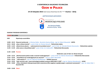 II KONFERENCJA NAUKOWO NAUKOWO-TECHNICZNA OZON W POLSCE 24-25 25 listopada 2016 Hotel Czarny Potok Resort & SPA **** Krynica – Zdrój pod honorowym patronatem: dra Dariusza Reśko, Burmistrza Krynicy - Zdroju RAMOWY PROGRAM KONFERENCJI I DZIEŃ 24.11.2016 8:00 Rejestracja uczestników 10:00 – 10:15 10:15 – 10:40 10:40 – 11:05 11:05 – 11:30 Otwarcie konferencji: dr Dariusz Reśko - Burmistrz Krynicy-Zdroju, mgr inż. Robert Muszański - WOFIL „Ozon a klimat ziemski” – prof. dr hab. inż. Roman Zarzycki - Politechnika Łódzka „Nietermiczna plazma – wykorzystanie zystanie do produkcji ozonu” – prof. dr hab. inż. Henryka Danuta Stryczewska - Politechnika Lubelska „Rola ozonu w dezynfekcji wody” – prof. dr hab. inż. Andrzej Biń – Politechnika Warszawska 11:30 – 12:00 Przerwa Moderator: prof. dr hab. inż. Roman Zarzycki 12:00 – 12:25 „Monitorowanie Monitorowanie jakości wody w sieciach wodociągowych wodociągowych.” - prof. dr hab. inż. Marian Kwietniewski – Politechnika Warszawska 12:25 – 12:45 „ Dezynfekcja sieci wodociągowych po awariach” – mgr inż. Robert Muszański 12:45 – 13:10 „ Alternatywy 4” – mgr inż. Marzena Gręźlikowska – MPWiK Jaworzno 13:10 – 13:35 „Jafar wczoraj a dziś , nowe technologie produkcji armatury WOD-KAN I P-POŻ” – mgr inż. Mariusz Nowakowski – JAFAR 13:35 – 14:00 „Filtry Filtry z drenażami niskooporowymi jako nowoczesne filtry węglowe współpracujące z systemami ozonowania” ozonowania – mgr inż. Adam Sitak – Dynamik Filtr 14:00 – 15:00 Obiad TECHNOLOGICZNE SESJE PANELOWE BLOK TECHNOLOGICZNY BLOK TECHNICZNY: Moderator: dr inż. Florian Piechurski „Wady i zalety stosowania ozonu na przykładach z istniejących obiektów” Moderator: prof. dr hab. inż. Henryka Danuta Stryczewska „Przegląd urządzeń wykorzystywanych w technologii ozonowania” 15:00 – 15:15 mgr inż. Grzegorz Zajkowski – Wodociągi Białostockie Sp. z o.o. 15:15 – 15:45 inż. Elżbieta Świeca – Wodociągi Sp. z o.o. w Głuchołazach 15:45 – 16:15 mgr inż. Maria Tendera – MPWiK Sp. z o.o. w Rzeszowie 16:15 – 16:45 inż. Stanisław Kowalski – Wodociągi Płockie Sp. z o.o. 16:45 – 17:00 mgr inż. Marcin Długosz – Urząd Miasta Mszana Dolna 17:00 – 17:30 „Projektowanie procesu ozonowania na podstawie wybranej stacji uzdatniania wody” mgr inż. Teresa Wójcik NBM Technologie 17:30 – 18:00 „Stacje pilotowe, a proces inwestycyjny” mgr inż. Rościsław Machnik 15:00 – 15:30 „ Przegląd urządzeń do pomiaru resztkowego w wodzie” dr hab. inż. Joanna Pawłat – Politechnika Lubelska 15:30 – 16:00 „Przegląd urządzeń pomiarowych” Alexander Becker – Tintometer GmbH 16:00 – 16:30 „ Budowa i konserwacja urządzeń do oznaczania ozonu resztkowego w wodzie firmy Dr Kuntze” – mgr inż. Łukasz Pustułka 16:30 – 17:00 „ Bloki plazmatyczne do wytwarzania ozonu – budowa i konserwacja” – mgr inż. Grzegorz Wróbel 17:00 – 17:15 „ Bezpieczeństwo stosowania ozonu. Budowa i zastosowanie destruktorów ozonu” – mgr inż. Jerzy Król 17:15 – 17:30 „ Wykrywanie nieszczelności na sieci ozonowej” – mgr Krzysztof Smyda 17:30 – 18:00 „Armatura do instalacji ozonowych” mgr Grzegorz Franiak – Product Manager RECTUS 19:30 – 03:00 Uroczysta kolacja integracyjna II DZIEŃ 25.11.2016 08:00 – 09:00 Śniadanie Moderator: prof. dr hab. inż. Andrzej Biń 09:00 – 09:25 „ Uwiarygodnienie sprawności technologii w ramach programu weryfikacji technologii środowiskowych Unii Europejskiej skutecznym narzędziem wsparcia wdrażania innowacyjnych rozwiązań w gospodarce wodno-ściekowej” – mgr Izabela Ratman - Kłosińska – ETV - Zakład Weryfikacji Technologii Środowiskowych 09:25 – 09:50 „Problemy z dezynfekcją przy naprawie i renowacji sieci wodociągowej, a możliwości wykorzystania w tym celu ozonu” - dr inż. Florian Piechurski - Politechnika Śląska 09:50 – 10:15 „Ozonowanie wody na sieć ” – mgr inż. Marcin Folwaczny – PWiK Częstochowa 10:15 – 10:40 „Możliwości techniczne wprowadzania ozonu do sieci wodociągowej” – mgr inż. Robert Muszański 10:40 – 11:05 „Uboczne produkty ozonowania wody – jak sobie z nimi radzić” - prof. dr hab. inż. Ewa Neczaj – Politechnika Częstochowska 11:05 – 11:30 „Zagadnienia związane z nadzorem sanitarnym nad materiałami, wyrobami kontaktującymi się z wodą przeznaczona do spożycia przez ludzi oraz nowymi technologiami uzdatniania wody w świetle § 21 oraz § 22 znowelizowanego rozporządzenia Ministra Zdrowia z dnia 13.11.2015r. w sprawie jakości wody przeznaczonej do spożycia przez ludzi (Dz. U. z 2015r., poz. 1989) ” mgr inż. Remigiusz Nowakowski – Wojewódzka Stacja Sanitarno – Epidemiologiczna w Katowicach 11:30 – 12:00 Dyskusja 12:00 – 13:00 Obiad Osoby wyjeżdżające 25.11.2016r. proszone są o wymeldowanie się z pokoi do godziny 12:00. Organizator zastrzega sobie prawo do wprowadzania zmian dot. programu i prelegentów, jak również odmowy przyjęcia zgłoszenia udziału w Konferencji.