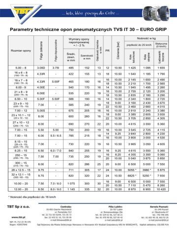 Parametry techniczne opon pneumatycznych TVS IT 30 – EURO GRIP Głębokość bieżnika w mm PR Średn. zewn. w mm Koła ładunkowe Koła skrętne Ładowarki boczne 5.00 – 8 3.00D 3.75I 485 152 13 12 10.50 1 425 1 095 1 655 16 x 6 – 8 4.33R - 422 155 13 18 10.50 1 540 1 185 1 790 4.33R 5.00F 465 180 16 6.00 - 9 4.00E - 540 170 16 21 x 8 – 9 6.00E - 535 220 19 6.50 – 10 5.00F 5.50F 588 190 16 23 x 9 – 10 7.00 - 585 240 19 7.00 – 12 5.00S - 675 205 16 23 x 10.1 – 12 8.00 - 600 260 16 16 18 14 16 18 14 18 22 16 18 22 10.00 10.50 10.50 10.00 10.50 10.00 9.00 10.50 10.00 9.00 10.50 2 145 2 210 1 945 2 755 2 835 2 340 3 160 3 460 2 910 3 385 3 705 1 650 1 700 1 495 2 120 2 180 1 800 2 430 2 660 2 240 2 605 2 850 2 490 2 565 2 260 3 200 3 290 2 720 3 670 4 015 3 380 3 935 4 305 27 x 10 – 12 (250 / 75 - 12) 8.00 - 690 270 22 20 10.00 4 615 3 550 5 360 7.00 – 15 5.50 5.00 750 200 19 7.50 – 15 6.00 5.5 / 6.5 785 215 18 16 14 16 10.00 9.25 10.00 3 545 3 640 3 900 2 725 2 800 3 000 4 115 4 230 4 530 (28 x 9 - 15) (225 / 75 - 15) 7.00 - 730 220 19 16 10.50 3 965 3 050 4 605 8.25 – 15 6.50 6.0 / 7.0 840 255 19 250 – 15 7.50 7.00 735 250 19 16 16 20 9.25 8.25 10.00 4 615 4 355 5 040 3 550 3 350 3 875 5 360 5 060 5 850 8.00 - 820 286 25 20 9.00 6 500 5 000 7 550 28 x 12.5 – 15 9.75 - 711 305 17 24 10.00 5055 * 3980 * 5 875 32 x 12.1 – 15 9.75 - 820 320 22 24 10.50 6825 * 5250 * 7 930 10.00 – 20 7.50 7.0 / 8.0 1 075 300 30 12.00 – 20 8.50 8.0 / 9.0 1 145 335 32 16 20 20 9.00 10.50 10.00 6 500 7 110 8 970 5 000 5 470 6 900 7 550 8 260 10 420 Rozmiar opony (150 / 75 - 8) 18 x 7 – 8 (180 / 70 - 8) (200 / 75 - 9) (225 / 75 - 10) (23 x 10 - 12) Szerokość w mm Ciśnienie [bar] Felga dopuszczalna Nośność w kg Felga zalecana Wymiary opony napompowanej +/-2% prędkość do 25 km/h Statyczna (0 km/h) 8.15 – 15 (250 / 70 - 15) 300 – 15 (315 / 70 - 15) (355 / 65 - 15) * Nośność dla prędkości do 16 km/h