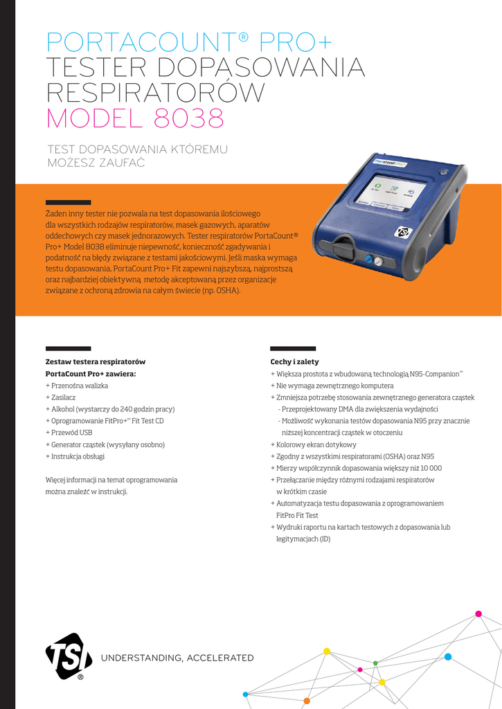 PORTACOUNT® PRO+ TESTER DOPASOWANIA RESPIRATORÓW MODEL 8038 TEST DOPASOWANIA KTÓREMU MOŻESZ ZAUFAĆ Zaden inny tester nie pozwala na test dopasowania ilosciowego dla wszystkich rodzajów respiratorów, masek gazowych, aparatów oddechowych czy masek jednorazowych. Tester respiratorów PortaCount® Pro+ Model 8038 eliminuje niepewnosc, koniecznosc zgadywania i podatnosc na błedy zwiazane z testami jakosciowymi. Jesli maska wymaga testu dopasowania, PortaCount Pro+ Fit zapewni najszybsza, najprostsza oraz najbardziej obiektywna metode akceptowana przez organizacje zwiazane z ochrona zdrowia na całym swiecie (np. OSHA). Zestaw testera respiratorów Cechy i zalety PortaCount Pro+ zawiera: + Wieksza prostota z wbudowana technologia N95-Companion™ + Przenosna walizka + Nie wymaga zewnetrznego komputera + Zasilacz + Zmniejsza potrzebe stosowania zewnetrznego generatora czastek + Alkohol (wystarczy do 240 godzin pracy) - Przeprojektowany DMA dla zwiekszenia wydajnosci + Oprogramowanie FitPro+™ Fit Test CD - Mozliwosc wykonania testów dopasowania N95 przy znacznie + Przewód USB nizszej koncentracji czastek w otoczeniu + Generator czastek (wysyłany osobno) + Kolorowy ekran dotykowy + Instrukcja obsługi + Zgodny z wszystkimi respiratorami (OSHA) oraz N95 + Mierzy współczynnik dopasowania wiekszy niz 10 000 Wiecej informacji na temat oprogramowania mozna znalezc w instrukcji. + Przełaczanie miedzy róznymi rodzajami respiratorów w krótkim czasie + Automatyzacja testu dopasowania z oprogramowaniem FitPro Fit Test + Wydruki raportu na kartach testowych z dopasowania lub legitymacjach (ID) UNDERSTANDING, ACCELERATED DANE TECHNICZNE PORTACOUNT® PRO+ TESTER DOPASOWANIA RESPIRATORÓW (MASEK) MODEL 8038 Zakres współczynnika dopasowania od 1 do ponad 10 000, od 1 do 200 dla masek N95 Cyklicznosc wykonywania kalibracji 1 rok Dokładnosc testu dopasowania ± 10% odczytu Gwarancja Dwa lata Rodzaje testowanych masek Maski pełno-twarzowe Półmaski NIOSH series-100 Maski jednorazowe NIOSH series-99 Maski jednorazowe NIOSH series-95 Maski jednorazowe P3 Maski jednorazowe P2 Maski jednorazowe P1 Maski jednorazowe Minimalne wymagania sprzetowe dla oprogramowania FitPro + Fit System operacyjny Windows® 7 (32 i 64 bit), Windows 8 (32 i 64 bit), lub Windows 10 (32 i 64 bit) Wersja oprogramowanie Microsoft.Net 4 (instalator zainstaluje Microsoft.Net jesli to konieczne) Uwaga – w celu instalacji Microsoft.NET wymagane jest połaczenie z Internetem Procesor ≥ 1 GHz ≥ rozdzielczosci monitora 1280 x 800 pikseli 500 MB wolnego miejsca na dysku twardym 1 wolny port USB czytnik CD-ROM lub połaczenie z Internetem (do instalacji oprogramowania) Współczynnik dopasowania Bezposredni pomiar współczynnika dopasowania (Cout/Cin)* Wymiary 17 cm x 22 cm x 24 cm (6,75 cala x 8,5 cala x 9,5 cala) Akcesoria opcjonalne Waga Miernik Miernik ze standardowymi akcesoriami i walizka *Szczelnosc jest mierzona gdy przedmiot badan porusza sie i oddycha. Zestaw adapterów do róznych rodzajów respiratorów/masek 3,1 kg Tester dopasowania respiratorów PortaCount® Pro+ Model 8038 jest chroniony prawem patentowym: U.S. Patent No. 6,125,845. 8,2 kg PortaCount, TSI oraz logo TSI sa zastrzezonymi znakami towarowymi, a FitPro i N95-Companion sa znakami towarowymi firmy TSI Incorporated. Zasilani Automatyczne wykrywanie 100 do 250 V, 50 do 60 Hz Windows jest zastrzezonym znakiem towarowym firmy Microsoft Corporation w Stanach Zjednoczonych i / lub innych krajach. Przepływ powietrza Przykładowe Przepływ całkowity 350 cm3/min 1000 cm3/min (wartosc nominalna) Zakres temperatury Praca Przechowywanie od 0 do 38 ° C -40 do 70 ° C Alkohol Godziny pracy na jednym cyklu Rodzaj alkoholu 6 godzin w temperaturze 21° C 99,5% + alkohol izopropylowy Pokrowiec Wymiary 23 cm x 34.8 cm x 49.5 cm Ustawienie poziomu testu Pass / Fail Wybierana przez uzytkownika: 0 do 10000 Dystrybutor TSI Incorporated w Polsce UNDERSTANDING, ACCELERATED TSI Incorporated - Visit our website www.tsi.com for more information. USA UK France Germany Tel: +1 800 874 2811 Tel: +44 149 4 459200 Tel: +33 1 41 19 21 99 Tel: +49 241 523030 India China Singapore P/N 5001729 Rev K (PL)©2016 TSI Incorporated Tel: +91 80 67877200 Tel: +86 10 8219 7688 Tel: +65 6595 6388 Printed in U.S.A. iBros technic ul. Aleksandra Fredry 2 30-605 Kraków Tel: +48 12 3767051 Fax: +48 12 3767052 Email: [email protected]