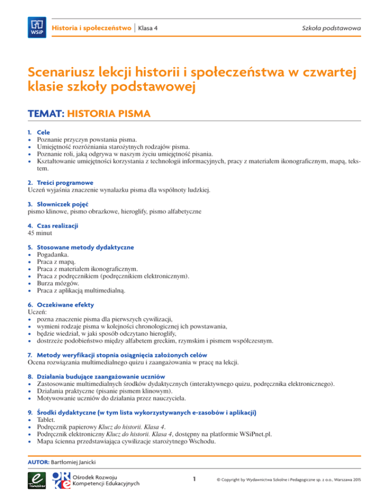 Historia i społeczeństwo | Klasa 4 Szkoła podstawowa Scenariusz lekcji historii i społeczeństwa w czwartej klasie szkoły podstawowej TEMAT: HISTORIA PISMA 1.Cele • • • • Poznanie przyczyn powstania pisma. Umiejętność rozróżniania starożytnych rodzajów pisma. Poznanie roli, jaką odgrywa w naszym życiu umiejętność pisania. Kształtowanie umiejętności korzystania z technologii informacyjnych, pracy z materiałem ikonograficznym, mapą, tekstem. 2. Treści programowe Uczeń wyjaśnia znaczenie wynalazku pisma dla wspólnoty ludzkiej. 3. Słowniczek pojęć pismo klinowe, pismo obrazkowe, hieroglify, pismo alfabetyczne 4. Czas realizacji 45 minut 5. Stosowane metody dydaktyczne • • • • • • Pogadanka. Praca z mapą. Praca z materiałem ikonograficznym. Praca z podręcznikiem (podręcznikiem elektronicznym). Burza mózgów. Praca z aplikacją multimedialną. 6. Oczekiwane efekty Uczeń: • pozna znaczenie pisma dla pierwszych cywilizacji, • wymieni rodzaje pisma w kolejności chronologicznej ich powstawania, • będzie wiedział, w jaki sposób odczytano hieroglify, • dostrzeże podobieństwo między alfabetem greckim, rzymskim i pismem współczesnym. 7. Metody weryfikacji stopnia osiągnięcia założonych celów Ocena rozwiązania multimedialnego quizu i zaangażowania w pracę na lekcji. 8. Działania budujące zaangażowanie uczniów • Zastosowanie multimedialnych środków dydaktycznych (interaktywnego quizu, podręcznika elektronicznego). • Działania praktyczne (pisanie pismem klinowym). • Motywowanie uczniów do działania przez nauczyciela. 9. Środki dydaktyczne (w tym lista wykorzystywanych e-zasobów i aplikacji) • • • • Tablet. Podręcznik papierowy Klucz do historii. Klasa 4. Podręcznik elektroniczny Klucz do historii. Klasa 4, dostępny na platformie WSiPnet.pl. Mapa ścienna przedstawiająca cywilizacje starożytnego Wschodu. AUTOR: Bartłomiej Janicki 1 © Copyright by Wydawnictwa Szkolne i Pedagogiczne sp. z o.o., Warszawa 2015 Historia i społeczeństwo | Klasa 4 Szkoła podstawowa • Multimedialny quiz (https://play.kahoot.it/#/?quizId=d7f95515-bfd9-441c-932d-1adfef717b43). • Plastelina i patyczki. • Ilustracja przedstawiająca wartość fonetyczną poszczególnych liter alfabetu ugaryckiego (http://szkolnictwo.pl/rysunkihasla/27/27627_1.png). • Ćwiczenia elektroniczne na platformie WSiPnet.pl. 10.Przebieg lekcji Przed lekcją upewnij się, że masz podłączony projektor multimedialny do komputera. Lp. Co robi nauczyciel? Co robią uczniowie? Czas Kształtowane umiejętności 1 Nauczyciel wita się z uczniami i wykonuje czynności organizacyjne. Uczniowie przygotowują się do zajęć, wyjmują potrzebne przybory. 2 min 2 Rekapitulacja wtórna Nauczyciel wydaje uczniom polecenia: wskaż na mapie rzeki Tygrys, Eufrat, Nil, wskaż na mapie obszar tzw. Żyznego Półksiężyca, wskaż na mapie obszar cywilizacji Sumerów, wskaż na mapie obszar cywilizacji Egipcjan, powiedz, jaką rolę w powstaniu pierwszych cywilizacji odegrały rzeki, wymień osiągnięcia Sumerów. Uczniowie odnajdują na mapie obiekty geograficzne wskazane przez nauczyciela. Udzielają odpowiedzi na pytania nauczyciela. 3 min Kształtowanie umiejętności pracy z mapą, formułowania krótkich wypowiedzi ustnych. 3 Historia pisma Nauczyciel zarządza burzę mózgów, dzięki której uczniowie będą mogli zastanowić się, po co ludziom potrzebne było (i jest) pismo. Nauczyciel poleca uczniom przeczytanie podrozdziału Historia pisma (podręcznik elektroniczny, lekcja 14, ekran 1; podręcznik papierowy, s. 88). Omawia z uczniami ten tekst, ogląda z nimi zamieszczone w podręczniku fotografie ukazujące pismo klinowe, hieroglificzne i fenickie. Pyta uczniów o różnice w wyglądzie poszczególnych rodzajów pisma. Następnie prosi ich, aby skorzystali z tabletów i wyszukali w internecie zdjęcia przedstawiające pismo greckie i łacińskie. Uczniowie porównują ze sobą wygląd pisma fenickiego, greckiego i łacińskiego. Nauczyciel opowiada o alfabecie łacińskim i jego odmianie stosowanej w języku polskim. Pyta uczniów, czy współcześnie wygodnie byłoby korzystać z komputera lub smartfonu wyposażonego w klawiaturę z pismem sumeryjskim albo hieroglificznym. Uczniowie biorą udział w burzy mózgów. Zapisują najtrafniejsze odpowiedzi na tablicy. Czytają tekst podręcznika. Porównują różne rodzaje pisma. Wyszukują treści w zasobach internetu. Opisują pismo fenickie, greckie i łacińskie i je porównują. 18 min Kształtowanie umiejętności logicznego myślenia, samodzielnego wyszukiwania informacji, korzystania z technologii informacyjnych, pracy z materiałem ikonograficznym, tekstem podręcznika. AUTOR: Bartłomiej Janicki 2 © Copyright by Wydawnictwa Szkolne i Pedagogiczne sp. z o.o., Warszawa 2015 Historia i społeczeństwo | Klasa 4 Szkoła podstawowa Co robią uczniowie? Czas Kształtowane umiejętności Lp. Co robi nauczyciel? 4 Piszemy pismem klinowym Nauczyciel poleca uczniom wykonanie z plasteliny płaskiej powierzchni (przypominającej mezopotamską glinianą tabliczkę). Następnie prosi uczniów, aby na tabletach otworzyli stronę przedstawiającą wartości fonetyczne alfabetu ugaryckiego (warto wyjaśnić uczniom, że mieszkańcy starożytnego miasta Ugarit wpadli na pomysł, aby za pomocą wybranych znaków pisma klinowego zapisywać trzydzieści głosek i w ten sposób stworzyli własne pismo alfabetyczne). Uczniowie spróbują odcisnąć patyczkami w plastelinie klinowe znaki ugaryckie, tak aby powstało imię danego czwartoklasisty. Nauczyciel ogląda dokonania swoich podopiecznych. Uczniowie otwierają na tabletach strony http://szkolnictwo.pl/ rysunkihasla/27/27627_1.png. Odciskają patyczki w plastelinie – piszą pismem klinowym swoje imiona. 10 min Kształtowanie umiejętności korzystania z technologii informacyjnych. 5 Kamień z Rosetty Nauczyciel poleca uczniom obejrzenie ilustracji p