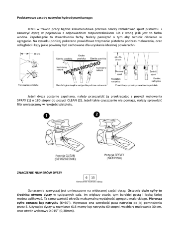 Podstawowe zasady natrysku hydrodynamicznego: Jeżeli w trakcie pracy będzie kilkuminutowa przerwa należy zablokować spust pistoletu i zanurzyć dyszę w pojemniku z odpowiednim rozpuszczalnikiem lub z wodą jeśli jest to farba wodna. Zapobiegnie to stwardnieniu farby. Należy pamiętać o tym aby zwolnić ciśnienie w agregacie. Na rysunku poniżej pokazano prawidłowe trzymanie pistoletu podczas malowania, oraz odległości i kąty jakie powinny być zachowane dla uzyskania idealnej powierzchni. Jeżeli dysza zostanie zapchana, należy przeczyścić ją przekręcając z pozycji malowania SPRAY (1) o 180 stopni do pozycji CLEAN (2). Jeżeli takie czyszczenie nie pomaga, należy sprawdzić filtr umieszczony w rękojeści pistoletu. ZNACZENIE NUMERÓW DYSZY 6 15 Oznaczenie rozmiaru dyszy. Oznaczenie zazwyczaj jest umieszczone na widocznej części dyszy. Ostatnie dwie cyfry to średnica otworu dyszy w tysięcznych cala. Im większy otwór, tym bardziej gęstą i lepką farbę można aplikować. Ta sama wartość określa maksymalną wydajność agregatu malarskiego. Pierwsza cyfra oznacza kąt natrysku (6=60°). Wyznacza ona szerokość pasa natrysku po jej pomnożeniu przez 5. Używając dyszy w rozmiarze 615 mamy kąt natrysku 60 stopni, wachlarz malowania 30 cm, oraz otwór wylotowy 0.015” (0,38mm). PRZELICZNIK ROZMIARÓW DYSZ: Wielkość otworu w calach (mm) Wydajność w galonach i litrach na minutę 0,007” (0,18mm) 0,05 gal/min (0,19 l/min) 0,009” (0,23mm) 0,08 gal/min (0,30 l/min) 0,011” (0,28mm) 0,12 gal/min (0,45 l/min) 0,013” (0,33mm) 0,17 gal/min (0,64 l/min) 0,015” (0,38mm) 0,23 gal/min (0,87 l/min) 0,017” (0,43mm) 0,30 gal/min (1,13 l/min) 0,019” (0,48mm) 0,36 gal/min (1,36 l/min) 0,021” (0,53mm) 0,46 gal/min (1,74 l/min) 0,023” (0,58mm) 0,55 gal/min (2,08 l/min) 0,025” (0,64mm) 0,66 gal/min (2,49 l/min) 0,027” (0,68mm) 0,77 gal/min (2,91 l/min) 0,029” (0,74mm) 0,88 gal/min (3,33 l/min) 0,031” (0,79mm) 1,02 gal/min (3,86 l/min) 0,033” (0,84mm) 1,17 gal/min (4,42 l/min) 0,035” (0,89mm) 1,31 gal/min (5,19 l/min) 0,037” (0,94mm) 1,47 gal/min (5,56 l/min) 0,039” (0,99mm) 1,63 gal/min (6,16 l/min) 0,041” (1,04mm) 1,80 gal/min (6,80 l/min) 0,043” (1,09mm) 1,99 gal/min (7,52 l/min) 0,045” (1,14mm) 2,17 gal/min (8,20 l/min) 0,047” (1,19mm) 2,37 gal/min (8,96 l/min) 0,049” (1,24mm) 2,58 gal/min (9,75 l/min) DOBÓR ROZMIARU DYSZY: Bardzo ważna sprawą jest dobre dobranie rozmiaru dyszy, ponieważ pozwala to na zmniejszenie strat podczas aplikacji i zmniejsza zużycie farby. Tym samym dobór dyszy skraca czas wykonania zadania i zapewnia lepszą kontrolę. Optymalne wykorzystanie dyszy natryskowej zależy min. od: -szerokości strumienia, -wielkości otworu dyszy, -typu natryskiwanej farby, -gęstości, lepkości farby -zawartości cząstek stałych -rodzaju malowanej powierzchni oraz -maksymalnej wydajności pompy. Identyczna szerokość pasa natrysku – różne grubości otworu dyszy Różne szerokości pasa natrysku – taka sama grubość otworu dyszy. Rysunek pokazuje różnice pomiędzy dyszami z takim samym pasem natrysku, lecz ze zwiększającą się średnicą dyszy (ostatnie dwie cyfry w oznaczeniu dyszy 5XX). Im większa średnica dyszy tym więcej materiału można natryskiwać na powierzchnie w tym samym czasie. Rysunek pokazuje różnice pomiędzy dyszami ze zwiększającym się pasem natrysku, lecz taką sama grubością otworu dyszy (pierwsza cyfra w oznaczeniu dyszy X15) Taka sama ilość materiału jest natryskiwana na szerokim jak i wąskim pasie natrysku. Stosując większy kąt, uzyskujemy szerszy pas natrysku i tym samym cieńszą powłokę. OZNAKI ZUŻYCIA DYSZY: Nowa dysza natryskuje równomierny eliptyczny kształt z z delikatnymi brzegami. Zużyta dysza daje nierównomierny kształt, z ostrymi krawędziami. Bywa też tak, że same brzegi dyszy zaczynają pisać grubymi liniami, a przepływ materiału przez dyszę może przekraczać wydajność agregatu. Pas natrysku jest mniejszy. Poniżej rysunek przedstawiający różnicę pomiędzy nową i zużytą dyszą. Głównymi przyczynami zużywania się dysz są: 1. ciśnienie robocze materiału 2. cząstki stałe powodujące zwiększone ścieranie węglika