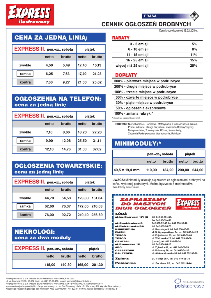 PRASA CENNIK OGŁOSZEŃ DROBNYCH Cennik obowiązuje od 15.02.2010 r. CENA ZA JEDNĄ LINIĄ: EXPRESS Il. pon.-cz., sobota RABATY 3 - 5 emisji 5% 6 - 10 emisji 8% 11 - 15 emisji 11% piątek netto brutto netto brutto 16 - 25 emisji 15% zwykłe 4,50 5,49 12,40 15,13 więcej niż 25 emisji 20% ramka 6,25 7,63 17,40 21,23 DOPŁATY kontra 7,60 9,27 21,00 25,62 300% - pierwsze miejsce w podrubryce 200% - drugie miejsce w podrubryce 100% - trzecie miejsce w podrubryce OGŁOSZENIA NA TELEFON: 50% - czwarte miejsce w podrubryce cena za jedną linię 30% - piąte miejsce w podrubryce 50% - ogłoszenia ekspresowe EXPRESS Il. 100% - zmiana rubryki* pon.-cz., sobota piątek netto brutto netto brutto zwykłe 7,10 8,66 18,20 22,20 ramka 9,90 12,08 25,50 31,11 kontra 12,10 14,76 31,00 37,82 * nie dotyczy ogłoszeń towarzyskich RUBRYKI: Nieruchomości, Handlowe, Motoryzacja, Finanse/Biznes, Nauka, Praca, Zdrowie, Usługi, Turystyka, Zwierzęta/Rośliny/Ogrody, Matrymonialne, Towarzyskie, Różne, Komunikaty, Życzenia/Podziękowania, Gastronomia, Rolnicze MINIMODUŁY:* pon.-cz., sobota netto brutto 110,00 134,20 piątek netto brutto OGŁOSZENIA TOWARZYSKIE: 40,5 x 19,4 mm cena za jedną linię EXPRESS Il. pon.-cz., sobota piątek 200,00 244,00 UWAGA: Minimoduły ukazują się zawsze za ogłoszeniami drobnymi na końcu wybranej podrubryki. Można łączyć do 8 minimodułów. *Nie dotyczy towarzyskich netto brutto netto brutto zwykłe 44,70 54,53 123,80 151,04 ramka 62,60 76,37 172,65 210,63 kontra 76,00 92,72 210,40 256,69 ZAPRASZAMY DO NASZYCH BIUR OGŁOSZEŃ ŁÓDŹ ul. Sienkiewicza 3 ul. Piotrkowska 94 MANUFAKTURA PIASKI TESCO TESCO CENTRAL ul. Rzgowska 12 ABC CARREFOUR D.H. TEOFIL tel. 042 66-59-455, fax 042 66-59-456 042 637-72-47, fax 042 630-95-40 tel. 042 633-36-73 ul. Karskiego 5, tel. 042 636-47-86 al. S. Wyszyńskiego 7a, tel. 042 640-44-26 ul. Pojezierska 93, tel. 042 659-59-09 ul. Widzewska 22, tel. 042 673-99-00 (parter), tel. 042 630-59-34 tel. 042 684-86-10 ul. Zgierska 69, tel. 042 640-68-93 ul. Kolumny 36, tel. 042 645-34-37 ul. Aleksandrowska 38, tel. 042 652-98-90 Zgierz ul. 1 Maja 28A, tel. 042 719-08-70 Pabianice ul. Św. Jana 7/9, tel. 042 212-14-44 ul. ks. Skorupki 17/19 NEKROLOGI: cena za dwa moduły EXPRESS Il. pon.-cz., sobota netto 115,00 brutto 140,30 piątek netto 165,00 brutto 201,30 Polskapresse Sp. z o.o. Oddział Biuro Reklamy w Warszawie, Filia Łódź ul. ks. Skorupki 17/19, 90-532 Łódź, tel. (42) 66-59-455, e-mail: [email protected] Polskapresse Sp. z o.o. Oddział Biuro Reklamy w Warszawie. 02-672 Warszawa, ul. Domaniewska 41, wpisana do rejestru przedsiębiorców prowadzonego przez Sąd Rejonowy dla M. St. Warszawy XIII Wydział Gospodarczy Krajowego Rejestru Sądowego pod numerem KRS 0000002408, NIP 522-01-03-609, kapitał zakładowy 41.503.000 zł