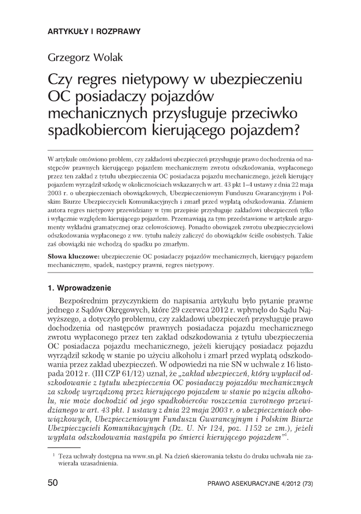 ARTYKUŁY I RO ZPRAW Y Grzegorz Wolak C zy regres nietypowy w ubezpieczeniu O C posiadaczy pojazdów mechanicznych przysługuje przeciwko spadkobiercom kierującego pojazdem? W artykule omówiono problem, czy zakładowi ubezpieczeń przysługuje prawo dochodzenia od n a stępców prawnych kierującego pojazdem m echanicznym zwrotu odszkodowania, wypłaconego przez ten zakład z tytułu ubezpieczenia OC posiadacza pojazdu mechanicznego, jeżeli kierujący pojazdem wyrządził szkodę w okolicznościach wskazanych w art. 43 pkt 1-4 ustawy z dnia 22 maja 2003 r. o ubezpieczeniach obowiązkowych, Ubezpieczeniowym Funduszu Gwarancyjnym i Pol skim Biurze Ubezpieczycieli Komunikacyjnych i zmarł przed wypłatą odszkodowania. Zdaniem autora regres nietypowy przewidziany w tym przepisie przysługuje zakładowi ubezpieczeń tylko i wyłącznie względem kierującego pojazdem. Przemawiają za tym przedstawione w artykule argu menty wykładni gramatycznej oraz celowościowej. Ponadto obowiązek zwrotu ubezpieczycielowi odszkodowania wypłaconego z ww. tytułu należy zaliczyć do obowiązków ściśle osobistych. Takie zaś obowiązki nie wchodzą do spadku po zmarłym. S łow a k luczow e: ubezpieczenie OC posiadaczy pojazdów m echanicznych, kierujący pojazdem mechanicznym, spadek, następcy prawni, regres nietypowy. 1. W p ro w ad zen ie Bezpośrednim przyczynkiem do napisania artykułu było pytanie prawne jednego z Sądów Okręgowych, które 29 czerwca 2012 r. wpłynęło do Sądu Naj wyższego, a dotyczyło problemu, czy zakładowi ubezpieczeń przysługuje prawo dochodzenia od następców prawnych posiadacza pojazdu mechanicznego zwrotu wypłaconego przez ten zakład odszkodowania z tytułu ubezpieczenia OC posiadacza pojazdu mechanicznego, jeżeli kierujący posiadacz pojazdu wyrządził szkodę w stanie po użyciu alkoholu i zmarł przed wypłatą odszkodo wania przez zakład ubezpieczeń. W odpowiedzi na nie SN w uchwale z 16 listo pada 2012 r. (III CZP 61/12) uznał, że „zakład ubezpieczeń, który wypłacił od szkodowanie z tytułu ubezpieczenia OC posiadaczy pojazdów mechanicznych za szkodę wyrządzoną przez kierującego pojazdem w stanie po użyciu alkoho lu, nie może dochodzić od jego spadkobierców roszczenia zwrotnego przewi dzianego w art. 43 pkt. 1 ustawy z dnia 22 maja 2003 r. o ubezpieczeniach obo wiązkowych, Ubezpieczeniowym Funduszu Gwarancyjnym i Polskim Biurze Ubezpieczycieli Komunikacyjnych (Dz. U. Nr 124, poz. 1152 ze zm.), jeżeli wypłata odszkodowania nastąpiła po śmierci kierującego pojazdem”1. 1 Teza uchwały dostępna na www.sn.pl. Na dzień skierowania tekstu do druku uchwała nie za wierała uzasadnienia. 50 P R A W O A S E K U R A C Y JN E 4 /2 0 1 2 (73) Czy regres nietypowy w ubezpieczeniu OC posiadaczy pojazdów mechanicznych Pragnę podkreślić, że opowiadam się za poglądem, w myśl którego w okolicz nościach wskazanych w art. 43 pkt 1-4 ustawy z dnia 22 maja 2003 r. o ubezpie czeniach obowiązkowych, Ubezpieczeniowym Funduszu Gwarancyjnym i Pol skim Biurze Ubezpieczycieli Komunikacyjnych2 ubezpieczycielowi n ie p rzy słu g u je prawo dochodzenia od następców prawnych kierującego pojazdem m e chanicznym zwrotu odszkodowania wypłaconego przez niego na rzecz poszkodo wanego z tytułu ubezpieczenia OC posiadacza pojazdu mechanicznego. 2. Stan praw ny W myśl art. 34 ust. 1 i 2 i art. 35 ustawy: - z ubezpieczenia OC posiadaczy pojazdów mechanicznych przysługuje od szkodowanie, jeżeli p o s ia d a c z lu b k ie ru ją c y pojazdem mechanicznym są obowiązani do odszkodowania za wyrządzoną w związku z ruchem tego po jazdu szkodę, będącą następstwem śmierci, uszkodzenia ciała, rozstroju zdrowia bądź też utraty, zniszczenia lub uszkodzenia mienia. Za szkodę po wstałą w związku z ruchem pojazdu mechanicznego uważa się również szkodę powstałą podczas i w związku z: wsiadaniem do pojazdu m echanicz nego lub wysiadaniem z niego, bezpośrednim załadowywaniem lub rozłado wywaniem pojazdu, zatrzymaniem lub postojem pojazdu; - ubezpieczeniem OC posiadaczy pojazdów mechanicznych jest objęta odpo wiedzialność cywilna każdej osoby, która kierując pojazdem mechanicznym w okresie trwania odpowiedzialności ubezpieczeniowej wyrządziła szkodę w związku z ruchem tego pojazdu. Zatem określenie kierujący pojazdem mechanicznym obejmuje również po siadacza tego pojazdu, jeżeli prowadził on pojazd osobiście3. Zgodnie zaś z art. 43 zakładowi ubezpieczeń oraz Ubezpieczeniowemu Funduszowi Gwarancyjnemu, w przypadkach określonych w art. 98 ust. 2 pkt 14, przysługuje prawo dochodzenia od k ie ru ją c e g o p o ja z d e m m e c h a 2 Dz. U. N r 124, poz. 1152 z późn. zm.; dalej jako „ustawa” lub „ustawa o ubezpieczeniach obo wiązkowych”. Określenia: „ubezpieczyciel” i „zakład ubezpieczeń” są używane w artykule za miennie. Dla porządku wskazać jednak należy, iż ustawa z dnia 13 kwietnia 2007 r. o zmianie ustawy - Kodeks cywilny oraz o zmianie niektórych innych ustaw (Dz. U. Nr 82, poz. 557) sta nowi w art. 1 pkt 2, że użyte w przepisach tytułu XXVII księgi III w różnych przypadkach wyra zy „zakład ubezpieczeń” zastępuje się użytym w odpowiednim przypadku wyrazem „ubezpie czyciel”, zaś w art. 6, że ilekroć w przepisach odrębnych jest mowa o „zakładzie ubezpieczeń” rozumie się przez to ubezpieczyciela. 3 Tak SN w uchwale z 2 m arca 1965 r. (III CO 8/65), niepubl.; zob. też T. Sangowski, Szczegól na postać regresu w ubezpieczeniach od odpowiedzialności cywilnej, Studia Ubezpieczeniowe 1975, n r 2, s. 233-237. 4 Chodzi o umowne ubezpieczenia obowiązkowe, o których mowa w art. 4 pkt 1-3 ustawy, tj. ubezpieczenie odpowiedzialności cywilnej posiadaczy pojazdów m echanicznych za szkody po wstałe w związku z ruchem tych pojazdów (inaczej: „ubezpieczenie OC posiadaczy pojazdów m echanicznych”), ubezpieczenie odpowiedzialności cywilnej rolników z